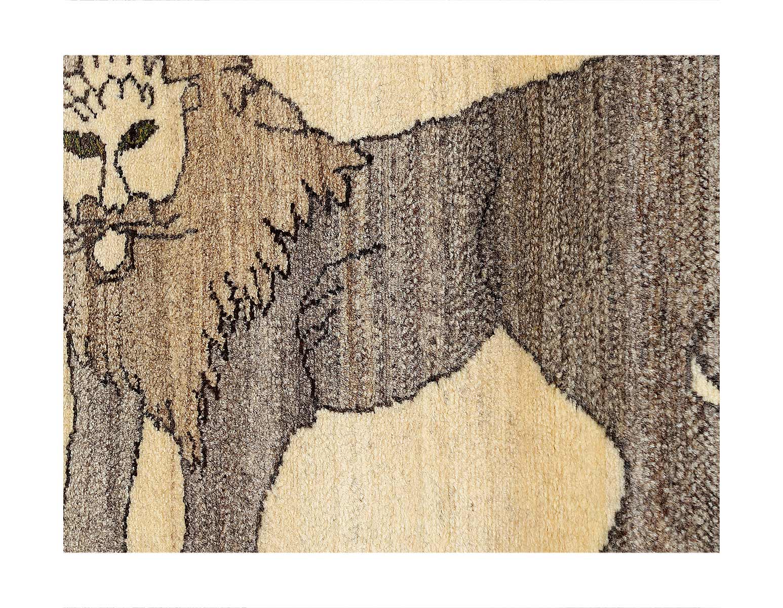 This Persian Qashqai Lion carpet features a Kashkouli style weave. Highlighting the powerful imagery of a prowling Lion, the carpet's central motif features a cream lion atop a rich red background. Utilizing the contrasting hues between the light cream background, weavers designated the alternating tones to depict depth and detailing for the lion's mane, paws, ears, and tail. Furthermore, the eye of the lion and torso detailing, completed in dark indigo, adds character to the lion. Surrounding the big cat is a simple and colorful border featuring tribal and a repetitive dogtooth border. Adding life to the geometric cream wool detail the exterior with dark gray outlining each motif. Considering this Qashqai's unique design, what truly separates this carpet from other transitional pieces comes down to its hand-knotted construction.