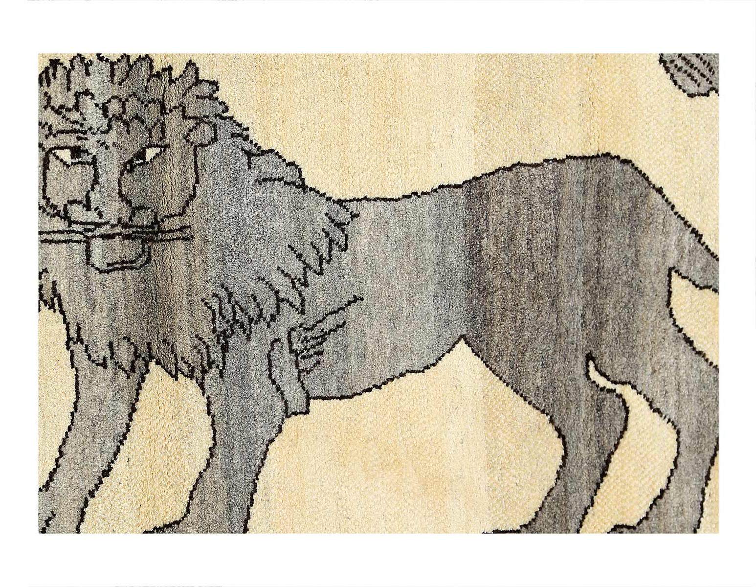 This Persian Qashqai Lion carpet measures 2'8" x 4'3" and features a Kashkouli style weave. Highlighting the powerful imagery of a prowling Lion, the carpet's central motif features a cream lion atop a rich red background. Utilizing the contrasting hues between the light cream background, weavers designated the alternating tones to depict depth and detailing for the lion's mane, paws, ears, and tail. Furthermore, the eye of the lion and torso detailing, completed in dark indigo, adds character to the lion. Surrounding the big cat is a simple and colorful border featuring tribal and a repetitive dogtooth border. Adding life to the geometric cream wool detail the exterior with dark gray outlining each motif. Considering this Qashqai's unique design, what truly separates this carpet from other transitional pieces comes down to its hand-knotted construction.