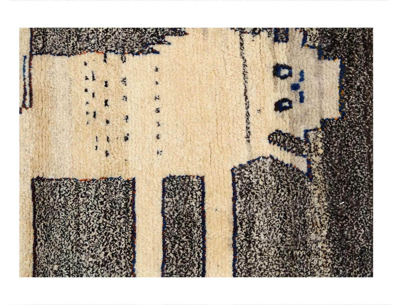 This Persian Qashqai Lion carpet features a Kashkouli style weave. Highlighting the powerful imagery of a prowling Lion, the carpet's central motif features a cream lion atop a rich red background. Utilizing the contrasting hues between the light cream background, weavers designated the alternating tones to depict depth and detailing for the lion's mane, paws, ears, and tail. Furthermore, the eye of the lion and torso detailing, completed in dark indigo, adds character to the lion. Surrounding the big cat is a simple and colorful border featuring tribal and a repetitive dogtooth border. Adding life to the geometric cream wool detail the exterior with dark gray outlining each motif. Considering this Qashqai's unique design, what truly separates this carpet from other transitional pieces comes down to its hand-knotted construction.