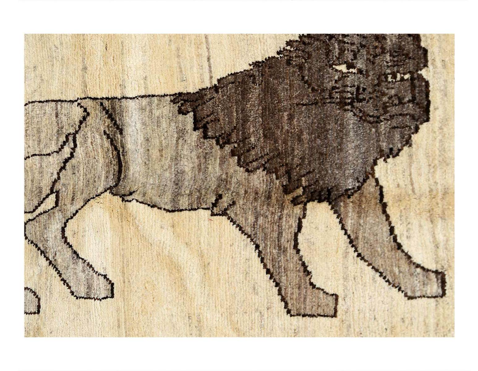 This Persian Qashqai Lion carpet features a Kashkouli style weave. Highlighting the powerful imagery of a prowling Lion, the carpet's central motif features a cream lion atop a rich red background. Utilizing the contrasting hues between the light cream background, weavers designated the alternating tones to depict depth and detailing for the lion's mane, paws, ears, and tail. Furthermore, the eye of the lion and torso detailing, completed in dark indigo, adds character to the lion. Surrounding the big cat is a simple and colorful border featuring tribal and a repetitive dogtooth border. Adding life to the geometric cream wool detail the exterior with dark gray outlining each motif. Considering this Qashqai's unique design, what truly separates this carpet from other transitional pieces comes down to its hand-knotted construction.