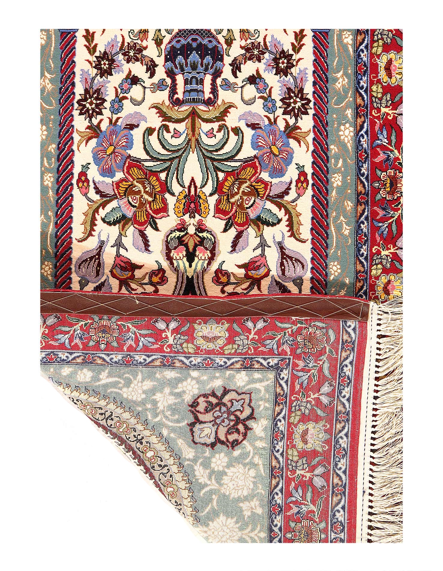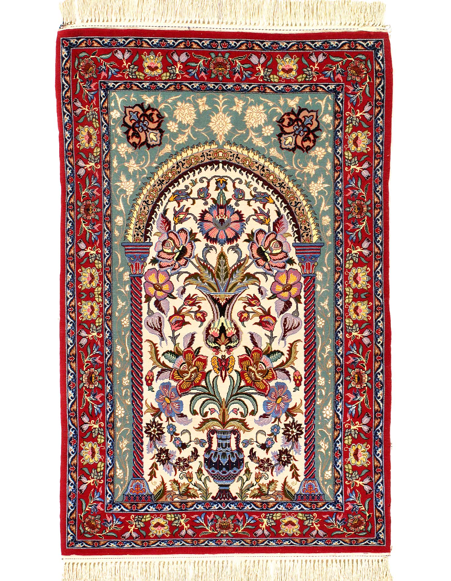 Original Fine Persian Isfahan MEHRAB Design Rug. Handmade Hand-knotted Silk & korker wool on a Silk .Classical combination of colours: cream ground with red border and medallion along with plenty of blue.
