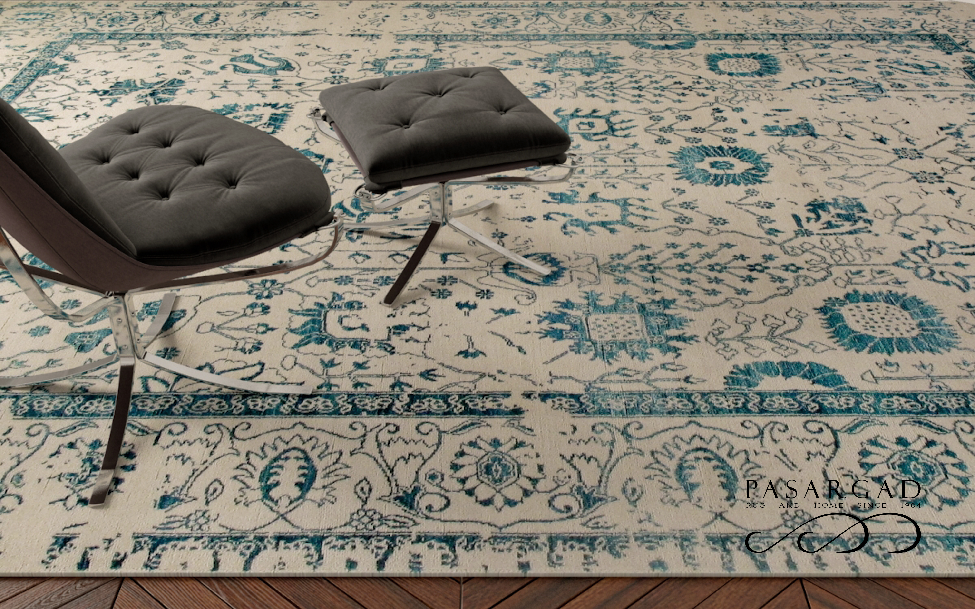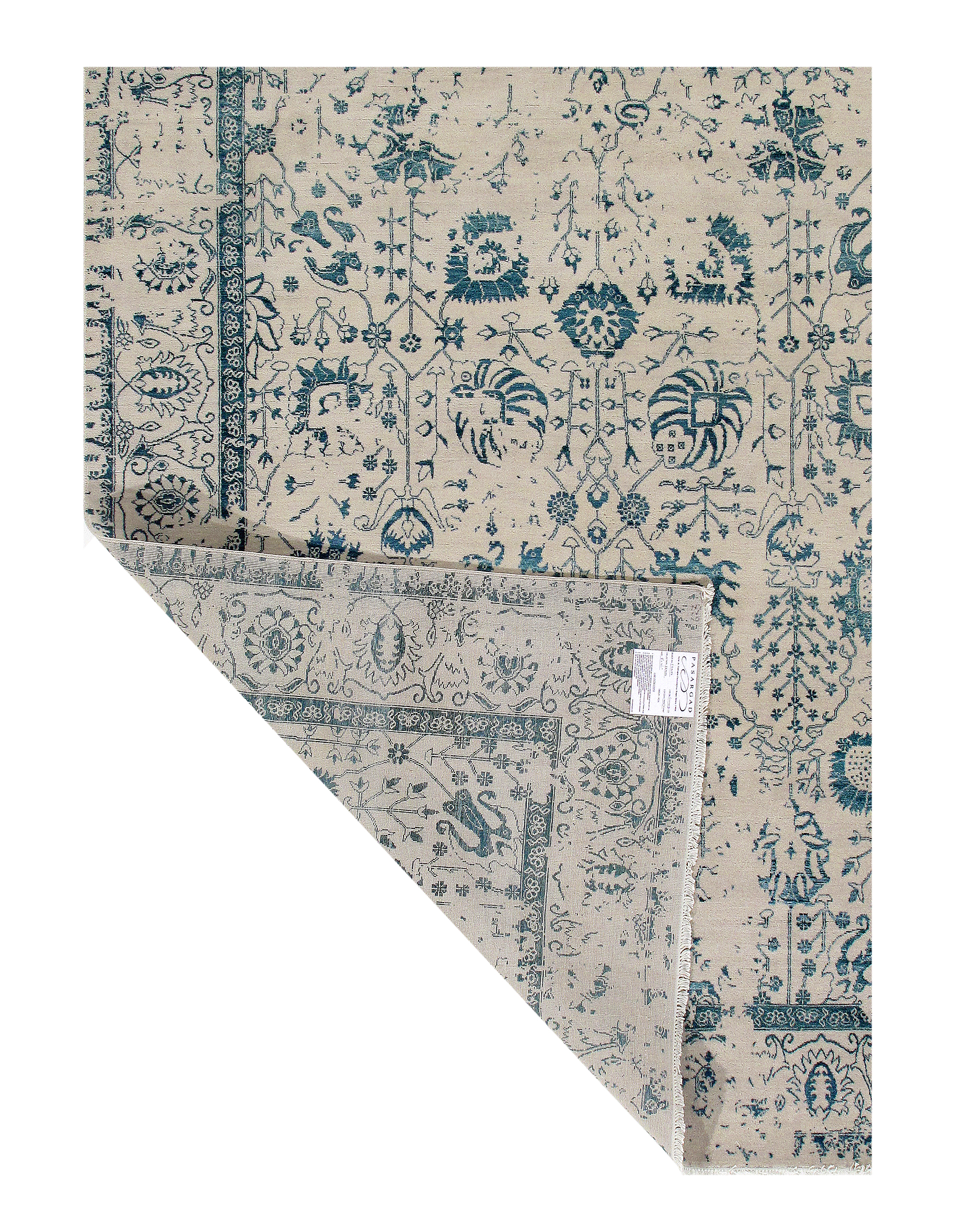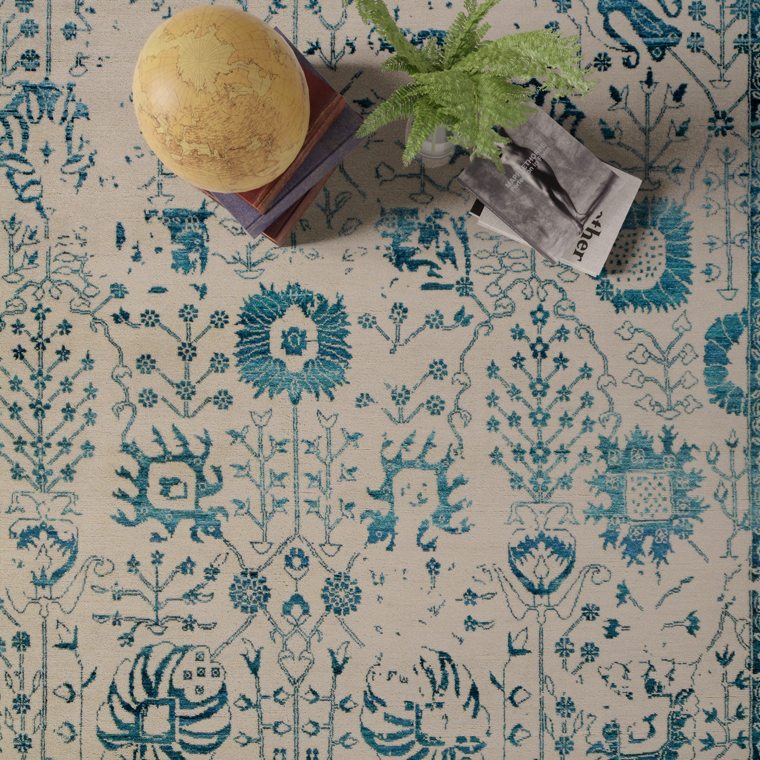 With its element of comfort, artistic statement and functional versatility, this contemporary rug will create a stunning focal point. Rather than sticking to a traditional modern style and risking a rather flat outcome, Indian artisans skillfully combined abstract style with the trending erased pattern creating this beautiful work of art. This balancing effect of modern abstract design with cool colors and subtle luminosity from the silky shimmers evoke the interior ornamental detail and coloration throughout and contrast beautifully with the overall design. Sporting a simple yet effortlessly sophisticated look, this contemporary style rug is very versatile. With its show-stopping ‘Erased’ antique style and luxurious blend of modernism and abstract design, this rug will work well with transitional, modern and contemporary interiors. Hand-knotted wool and bamboo silk. Made in India.