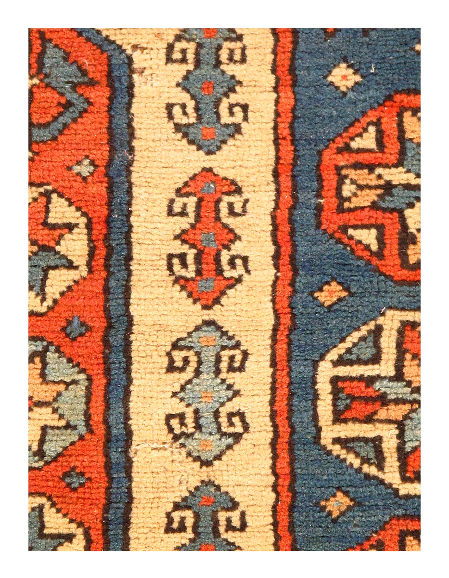Antique Caucasian Kazak Rug with Geometric . This stunning late 19th century Kazak rug from the Caucasus region displays magnificent, interconnected, geometric medallions and an all-over geometric design. A dynamic palette of red, blue, beige , and ivory with charcoal accents are incorporated into the carpet's multifaceted designs,