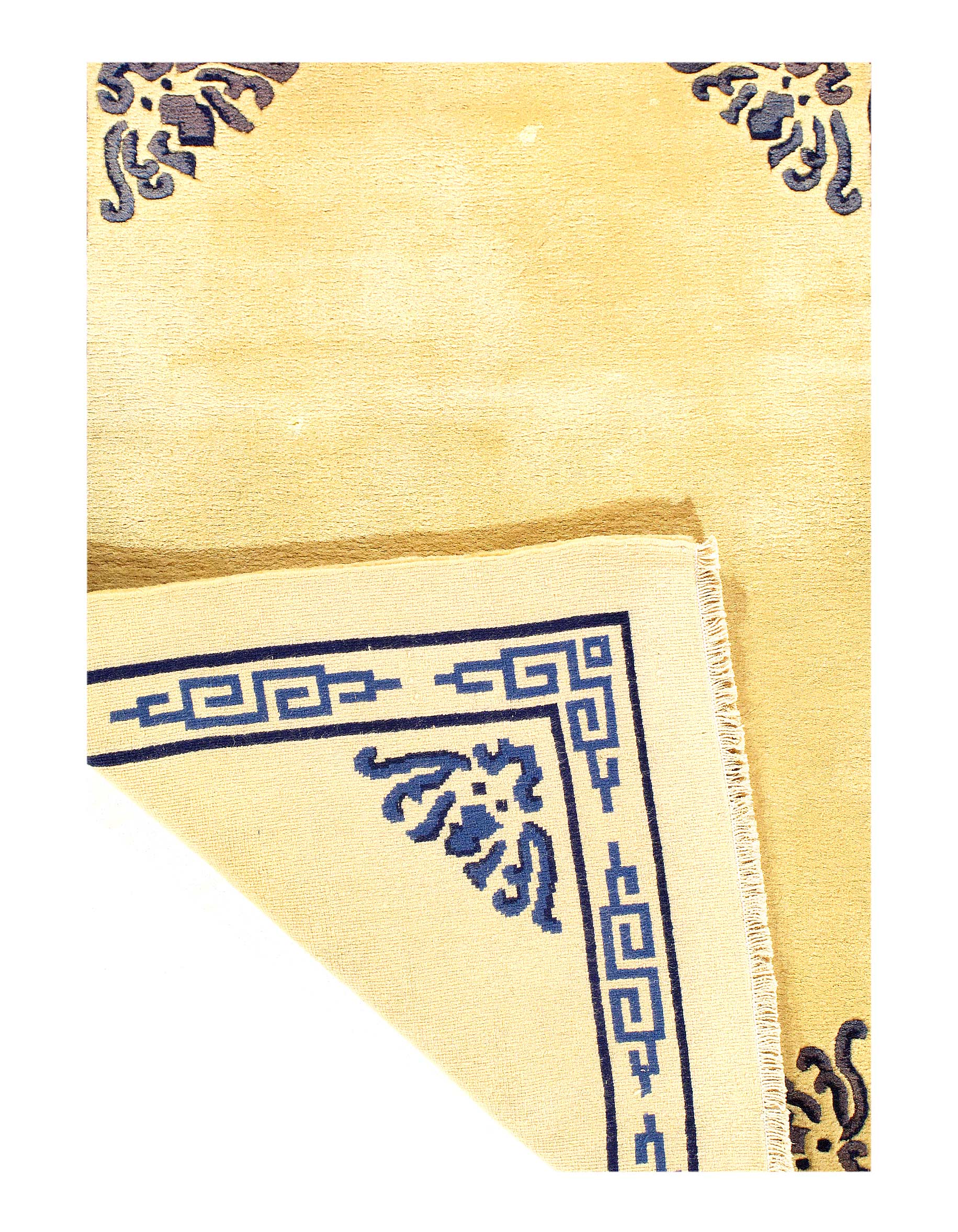 Chinese Deco Rug, Origin: China, Circa: Early 20th Century – Here is an exciting and appealing antique Oriental carpet – an antique Art Deco rug that was designed and woven in China during the early years of the twentieth century. Heavily informed by the aesthetic inclinations of the Art Deco period, this unique carpet is a compelling and thought-provoking example. A scalloped border of L Green encloses a Beige / Ivory sand field on this exquisitely subtle and restrained antique Chinese Art Deco. At first the field appears empty or open, but it is actually covered by a tone-on-tone design of scrolls and cloud-bands emanating inward from the outer edges. In their sinuous rhythms they echo the scalloped forms of the border and continue its visual effects across the carpet in a more subdued manner. This carpet testifies to the masterful design sensibilities of Chinese weavers as they made the transition into the modern world. The Art Deco movement had an outside influence on the world of art and design, and some of the most important qualities and characteristics of that movement may be found in this fine rug.