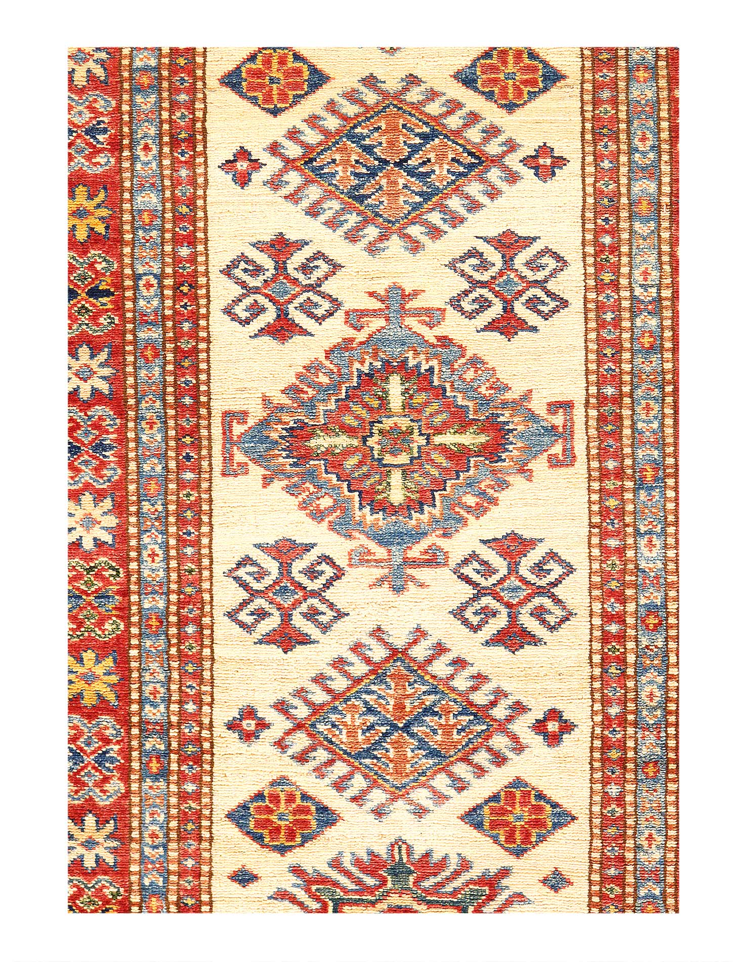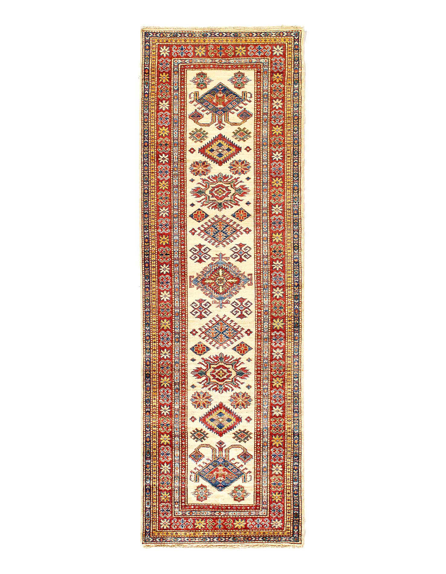 Vegetable Dyed,This rug is handmade from 100-percent premium, hand-spun wool, and employ ancient pot-dying techniques to give them their authentic look.This rug is handmade from 100-percent premium, hand-spun wool, and employ ancient pot-dying techniques to give them their authentic look.Kazak is a modern shape of old Caucasian rugs which strictly adheres to traditional design elements of the Caucasus. It has elements such as the stepped hooked polygons, geometrical medallions and rosettes, presented in more stylized manner and with a new dimension. Natural dyes produce soft luminous shades and abrashes causing a beautiful sheen. Hand spun wool yarn is normally used in the variety of vibrant warm colors. Kazaks rugs in our collection are all fine quality pieces from Pakistan made with Ghazni handspun wool and natural dyes.
