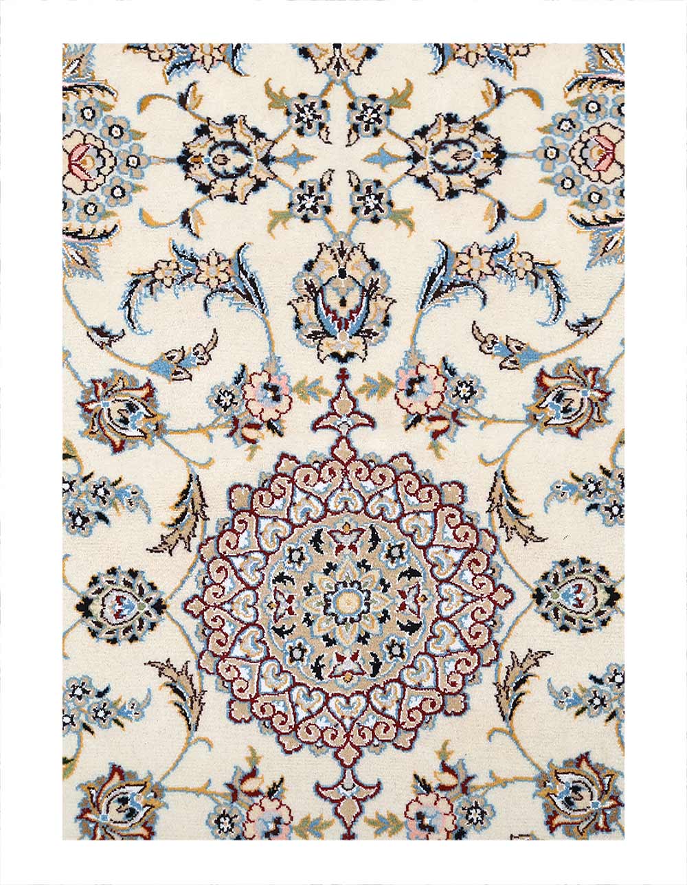 Persian Nain rugs are renowned for their detail and fine use of outlining along the central motifs. Breaking from the classical style of many vintage rugs produced around central Iran, Persian Nain rugs became renowned for their modern appeal and personal style, establishing the classical motifs of many other regional rugs, only through a more precise lens. In this striking piece, the precision is particularly visible along the heart of the vintage Persian rug, where the attention to detail allows each individual color to stand out as a unique part of the whole. The surrounding borders help ground the masterpiece and add horizontal intrigue to the natural elements within, which are arranged vertically to establish a cascading effect.