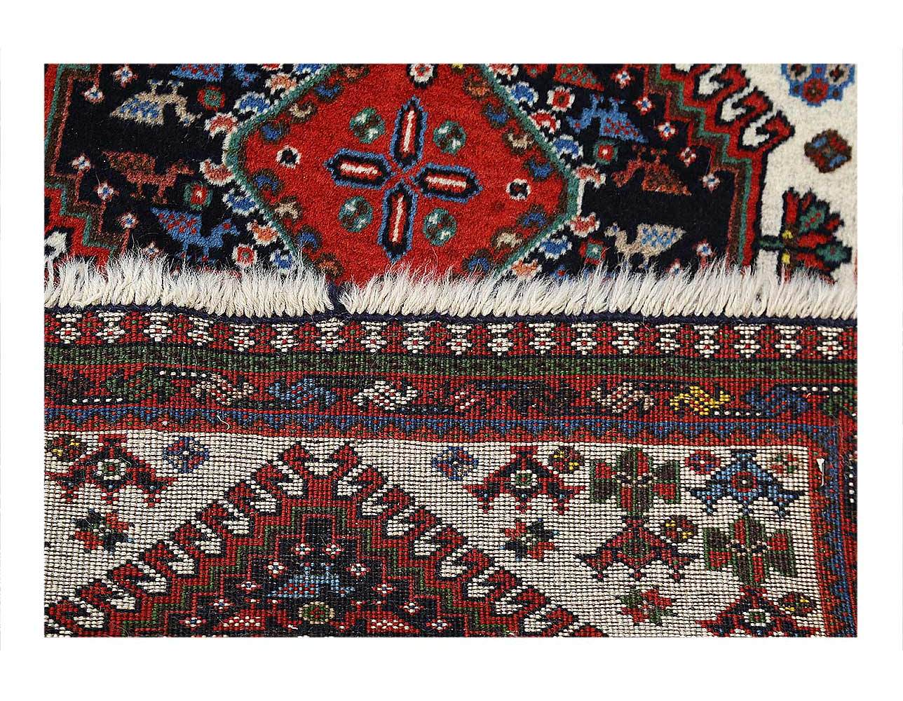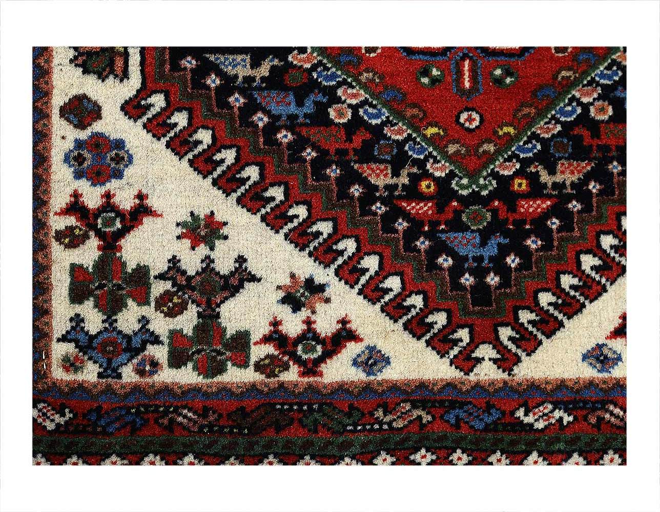 The pile used in Yalameh rugs is very fine, particularly in comparison to other tribal designs, using soft wool based on a Wool foundation. The pattern is distinctive with large repeated diamonds in a straight line down the carpet, often with geometrical animal or human prints scattered across the field. Dark red or light brown on a blue or orange background is most common for Yalameh, similar to Shiraz rugs, the rugs compliment modern or minimalist furniture beautifully, giving the living space an aura of luxurious style and warm.