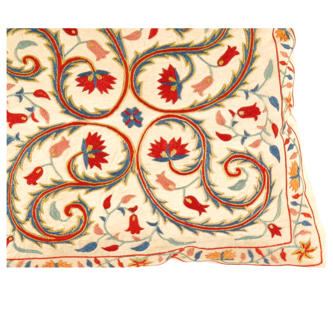 ● True to the “needle” origin of the Persian word suzani, these pillows are embroidered with traditional floral motifs in richly coloured patterns that define this historic style.