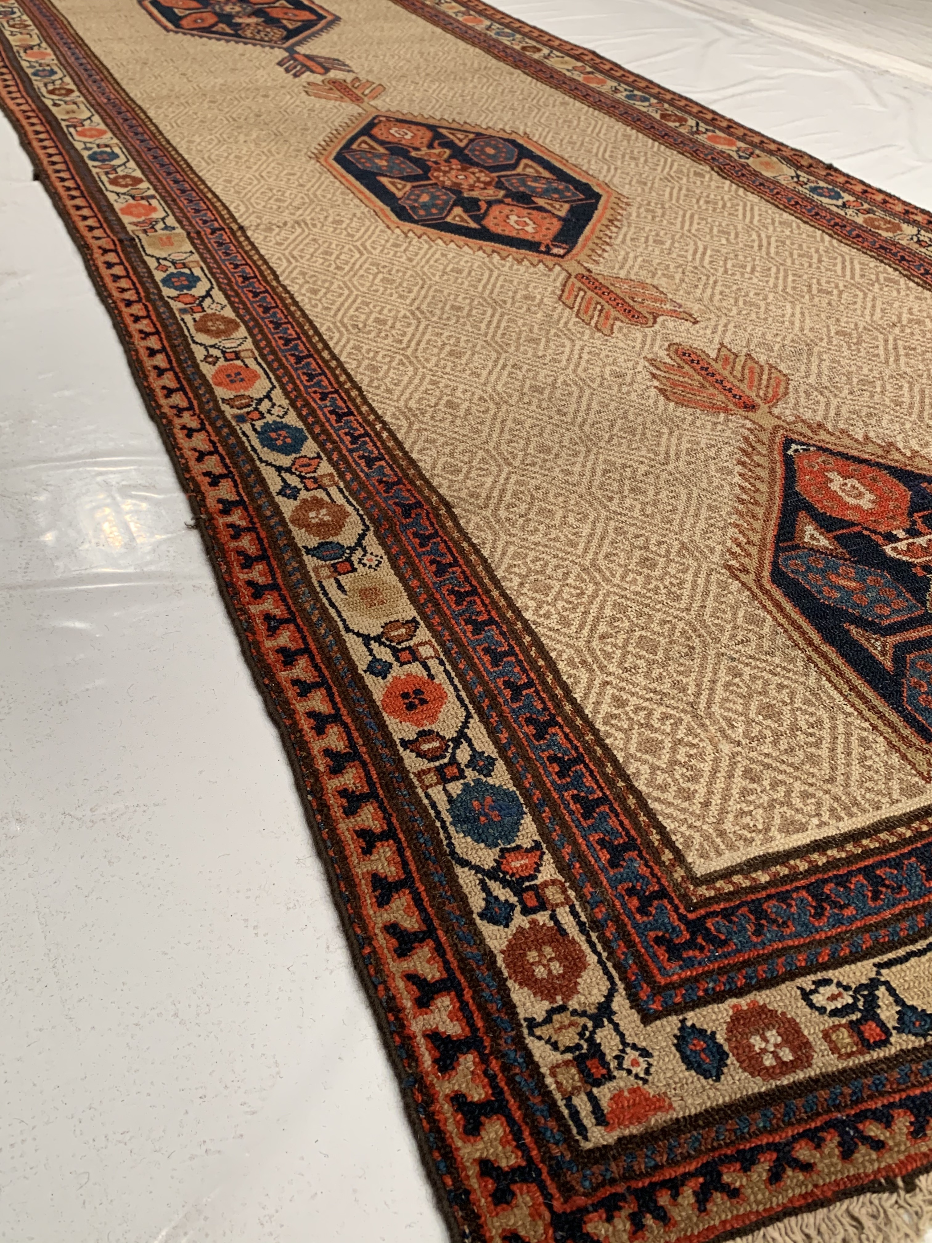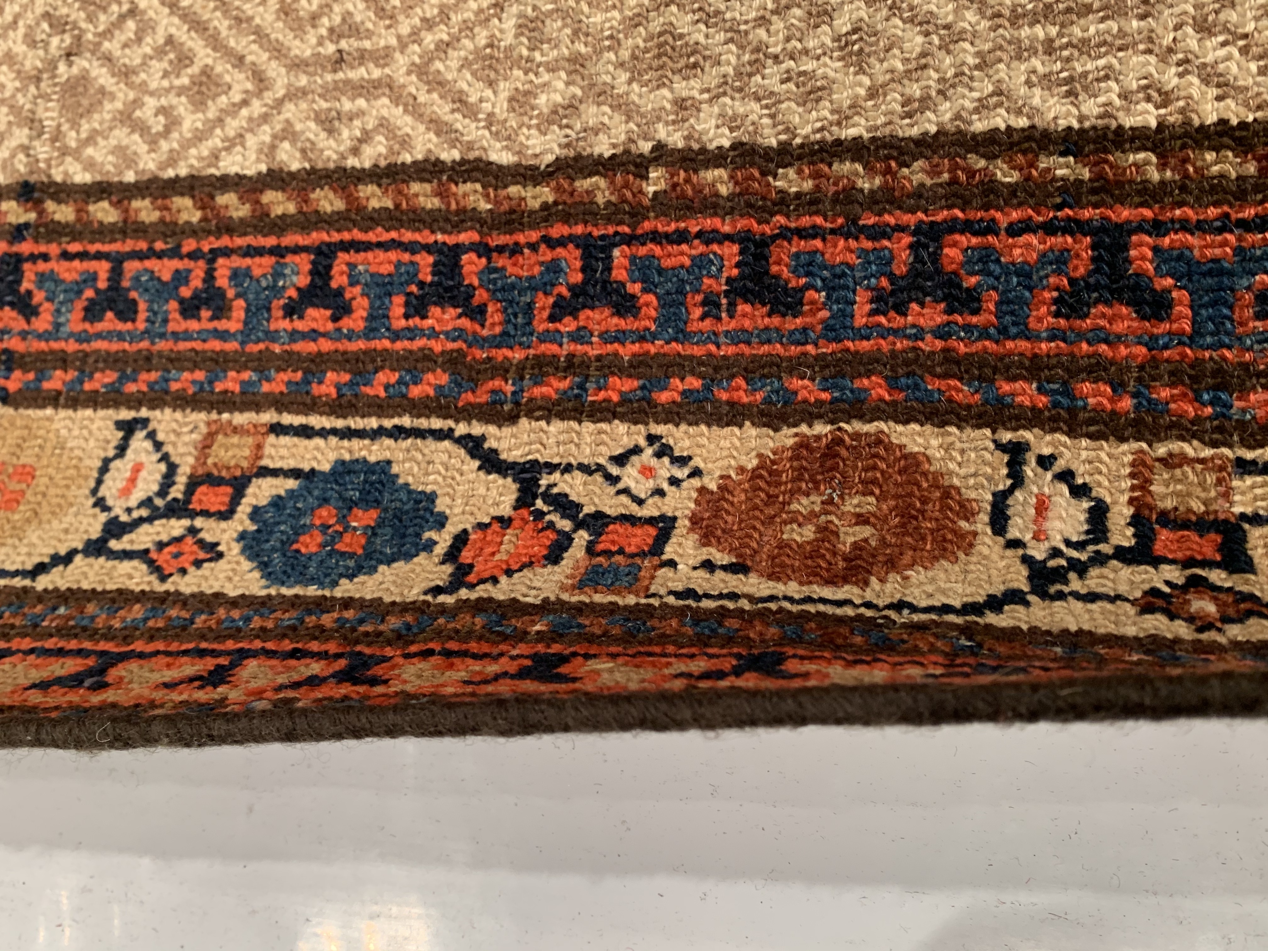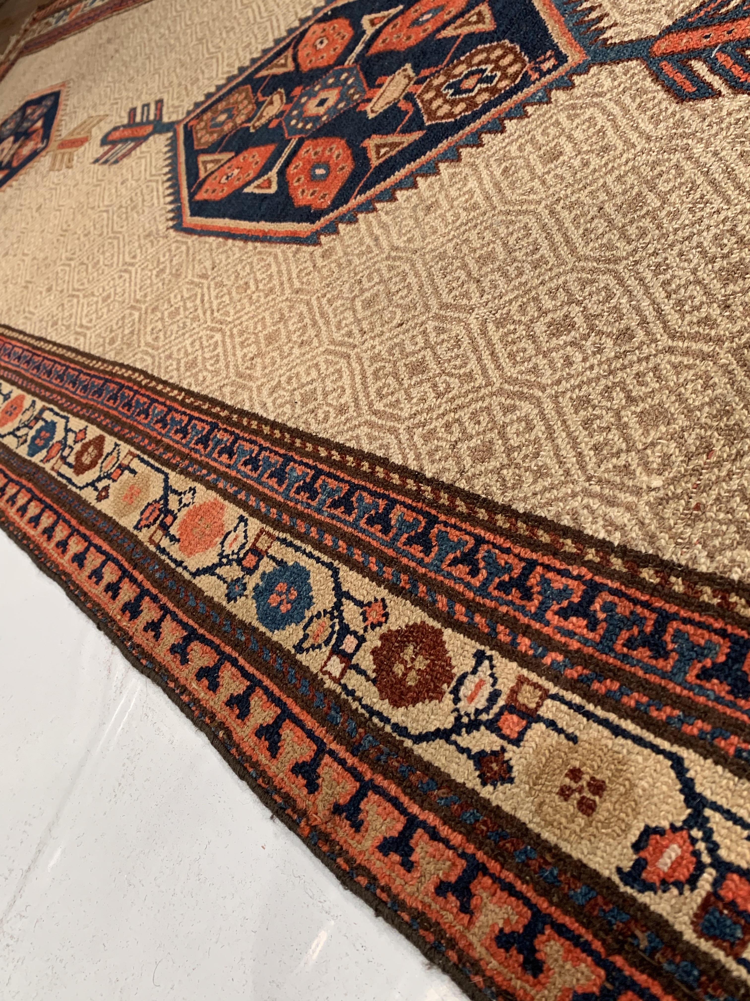 Serab designs were influenced by the materials that they had available. This antique carpet was created around the year 1900. The designs were influenced by the tribes that surrounded them, but they were not influenced by the carpet weaving centers of the cities. This beautiful piece uses traditional motifs that have a distinctive stylized geometric quality.