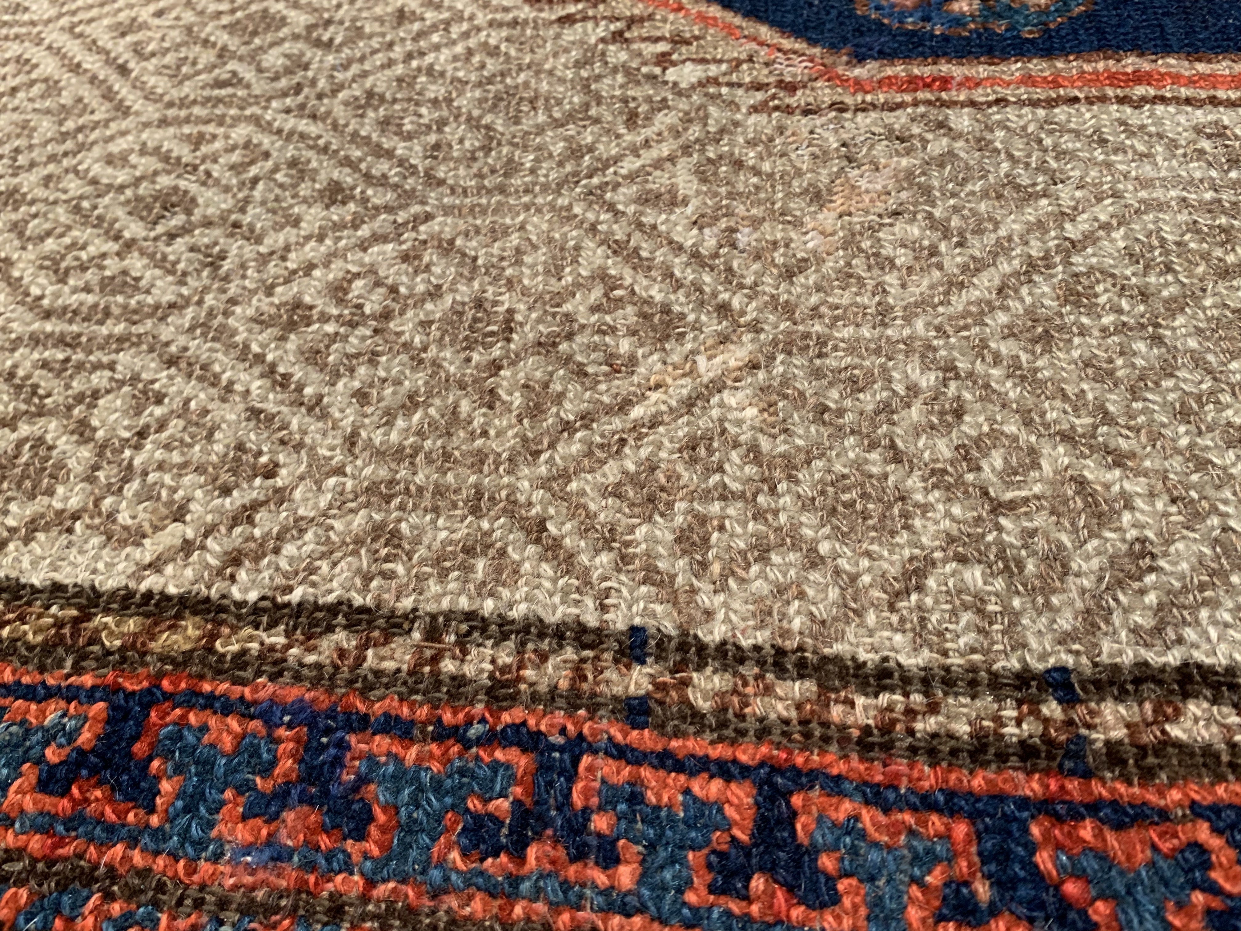 This Persian rug has an allover pattern based on large, complex repeating motifs. Of particular note is that the Serab would often use camel hair or blend camel hair with wool to create a range of browns. Sometimes these would be further dyed, and sometimes, they would be left in their natural color. This, combined with the blue that is unique to the area, gives this carpet and earthy feel that is characteristic of Serab carpets. This is a beautiful village carpet that could be used in a number of designs.