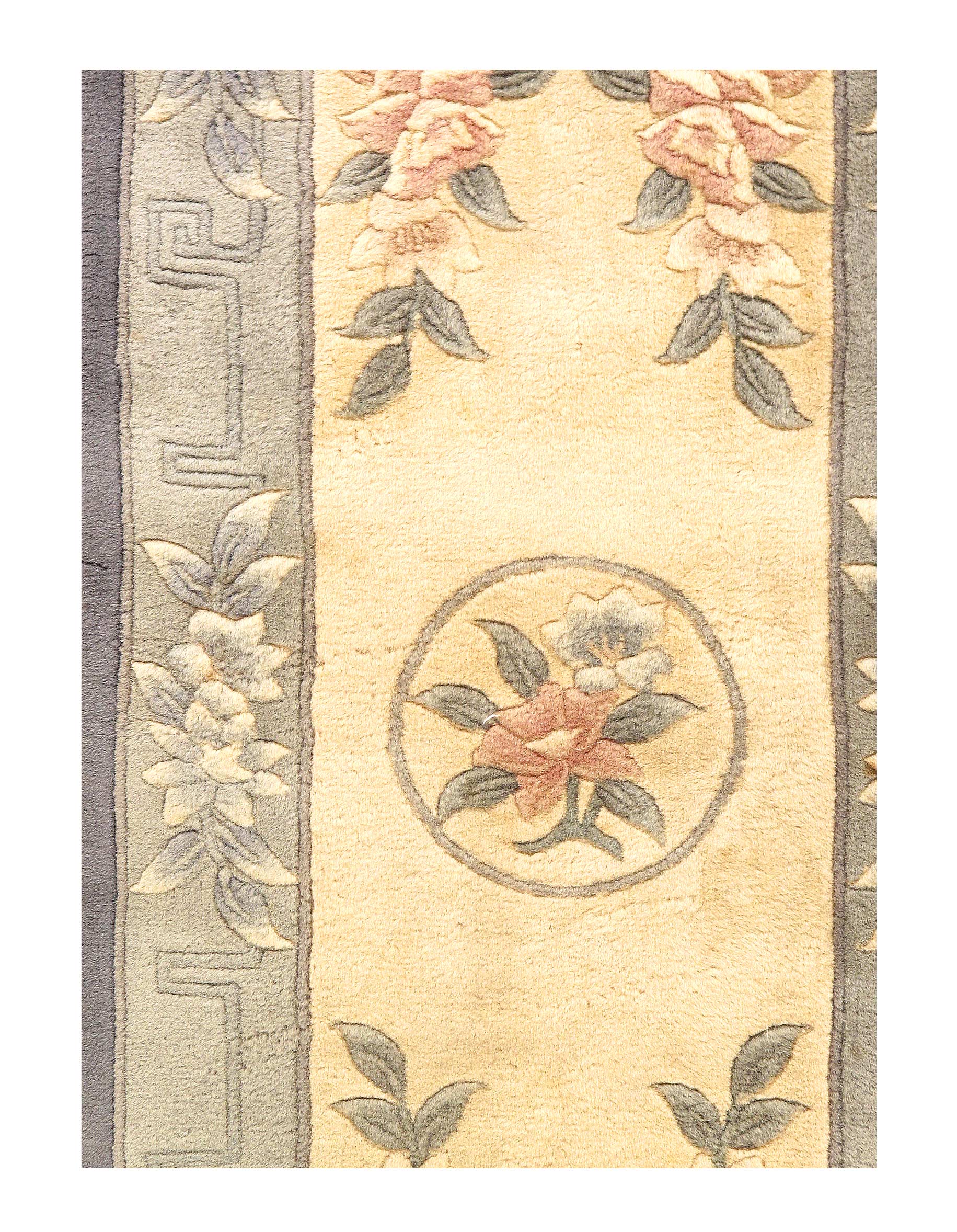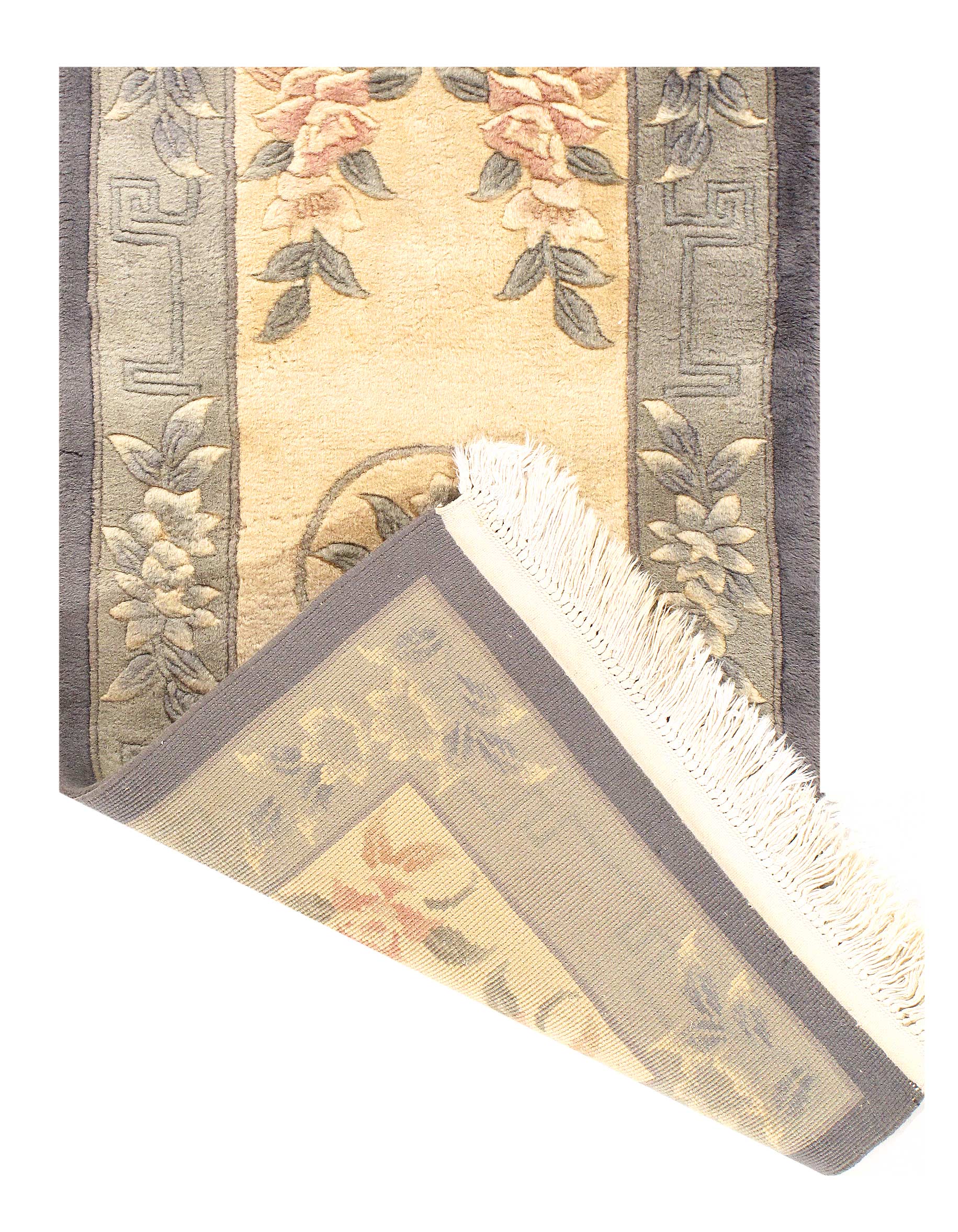Traditional Chinese rugs and carpets are immediately recognizable by their simple, classic motifs and unusual colors. These rugs often feature a center, circular medallion; familiar objects seen in nature such as animals, flowers, and clouds; stylized Chinese ideographs; and even entire scenes. They're usually framed with a simple, wide border. Chinese rugs are woven with a 5-ply yarn, in contrast with the 2-ply yarns used in Persian rugs and carpets. Many Chinese rugs and carpets are sculpted where contrasting colors meet to provide interest and texture to the simple patterns. These rugs are usually of high quality and extremely durable.