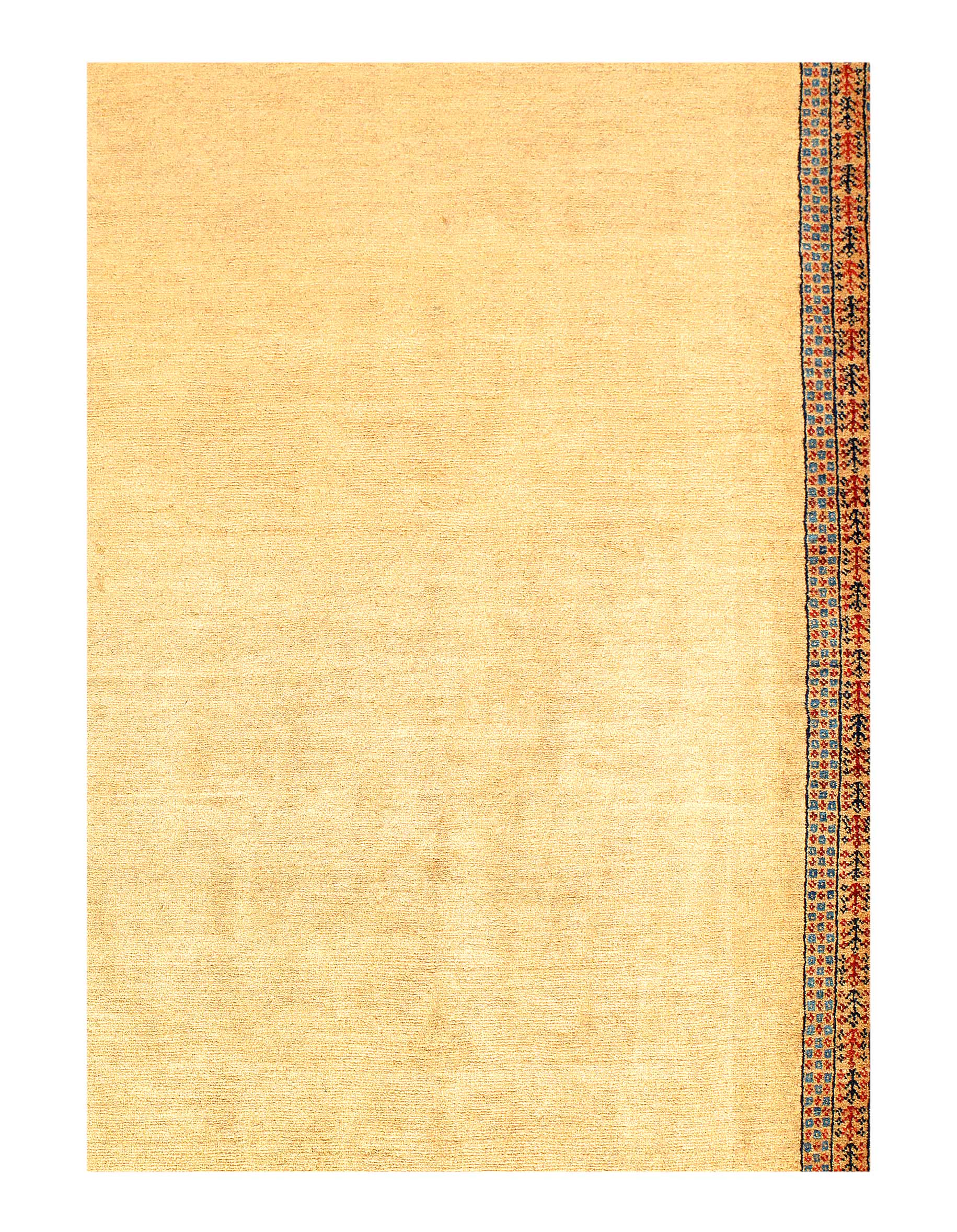 Most of the recent Gabbehs are filled with color with the weavers creativity being given free reign. There is nothing subtle or understated about them. The beauty of these rugs is their unmistakable uniqueness. I had one Gabbeh with a herd of camels, another with only a few simple trees. I remember one in particular that had wine glasses positioned right next to the humans on the rug! Some Gabbehs will have small animal figures whimsically placed throughout the field. You may see a simple rendition of the Tree of Life design, camels crossing the desert, a stylized sunset or the colors of the ocean with each rug having it's own individual qualities. A few of the more daring pieces have no design at all with only wool quality and variegation of color dictating the design elements.