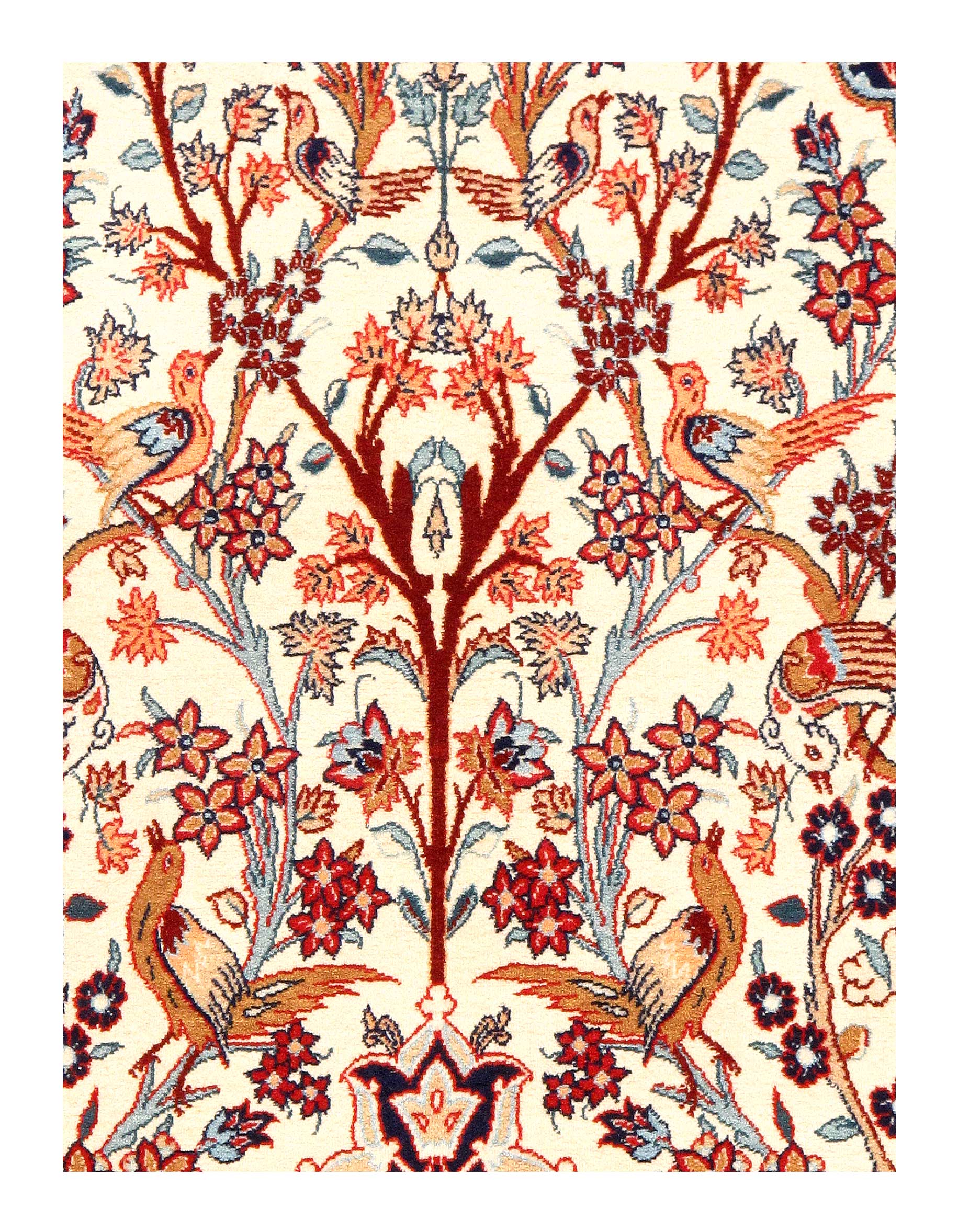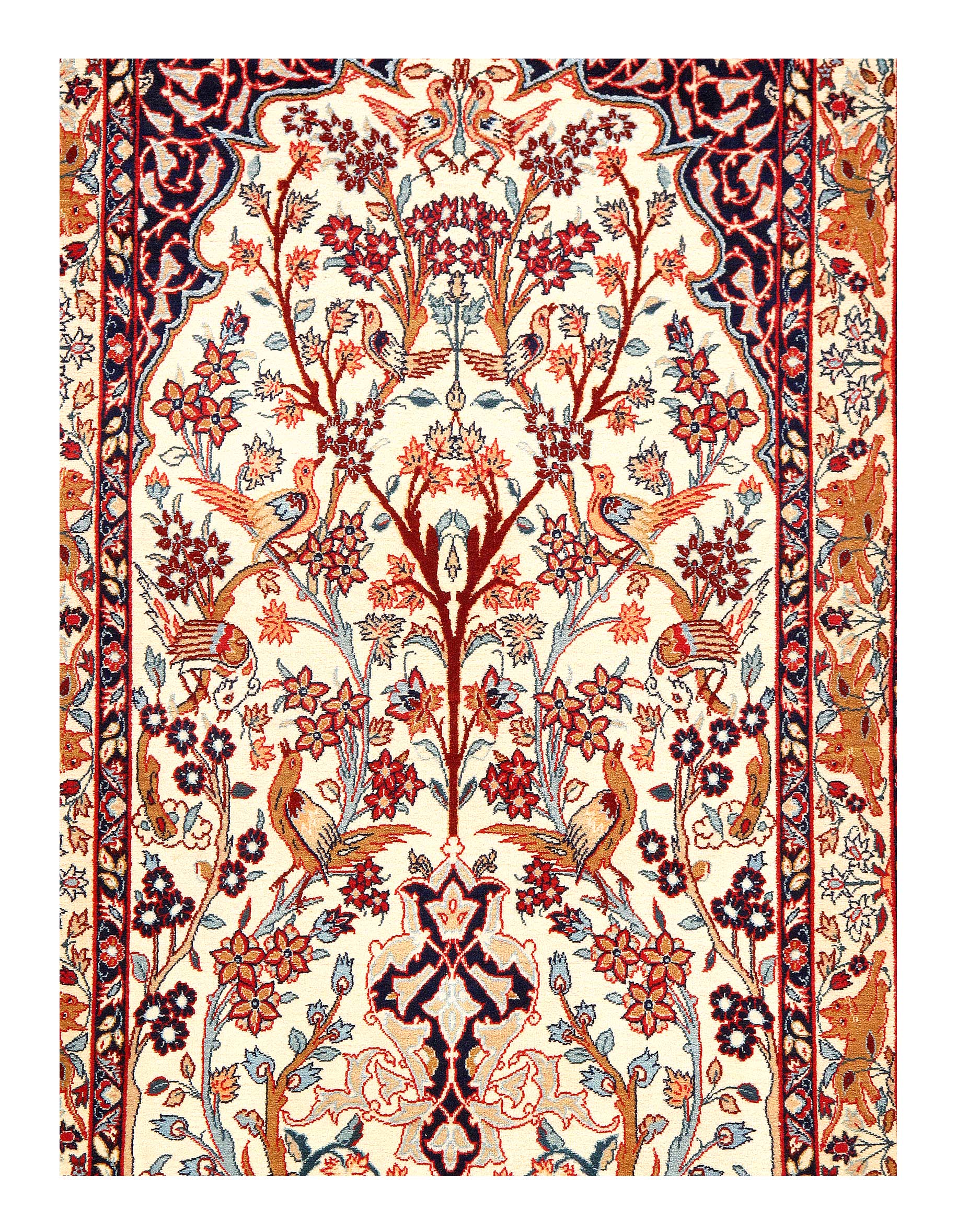 The Isfahan rugs are made with exceptionally good quality of wool & silk. They use traditional motifs inspired by architectural tiles that once decorated the historical buildings from which these rugs originated in. When it comes to high class designs the composition, patterns, and materials of Isfahan meets those expectations. The motifs usually consist of medallions with palmetts and also figural motifs. Isfahan rugs have an extremely high knot density and are woven with silk and golden threads, which give them their luxurious look.signed By serafian