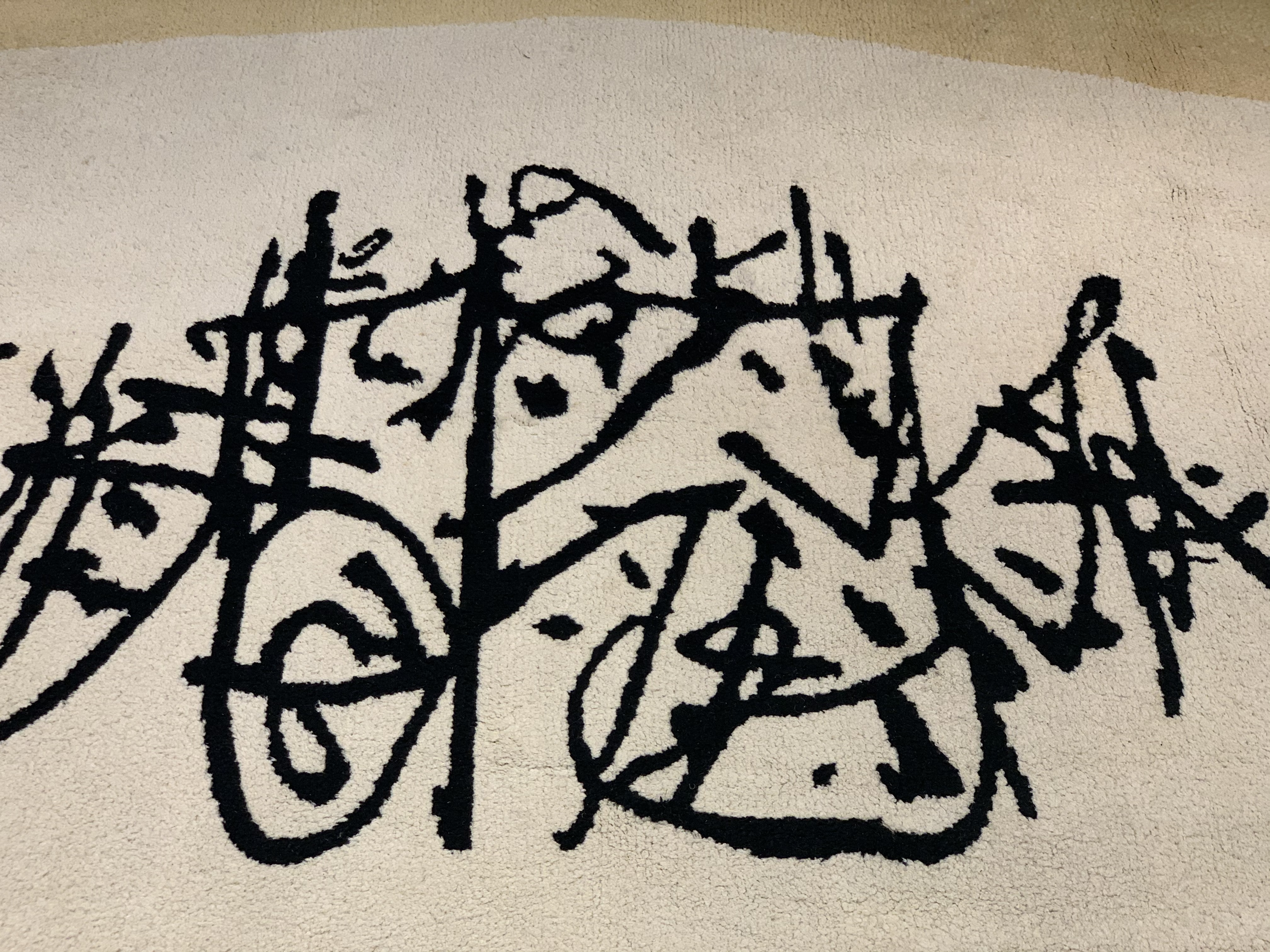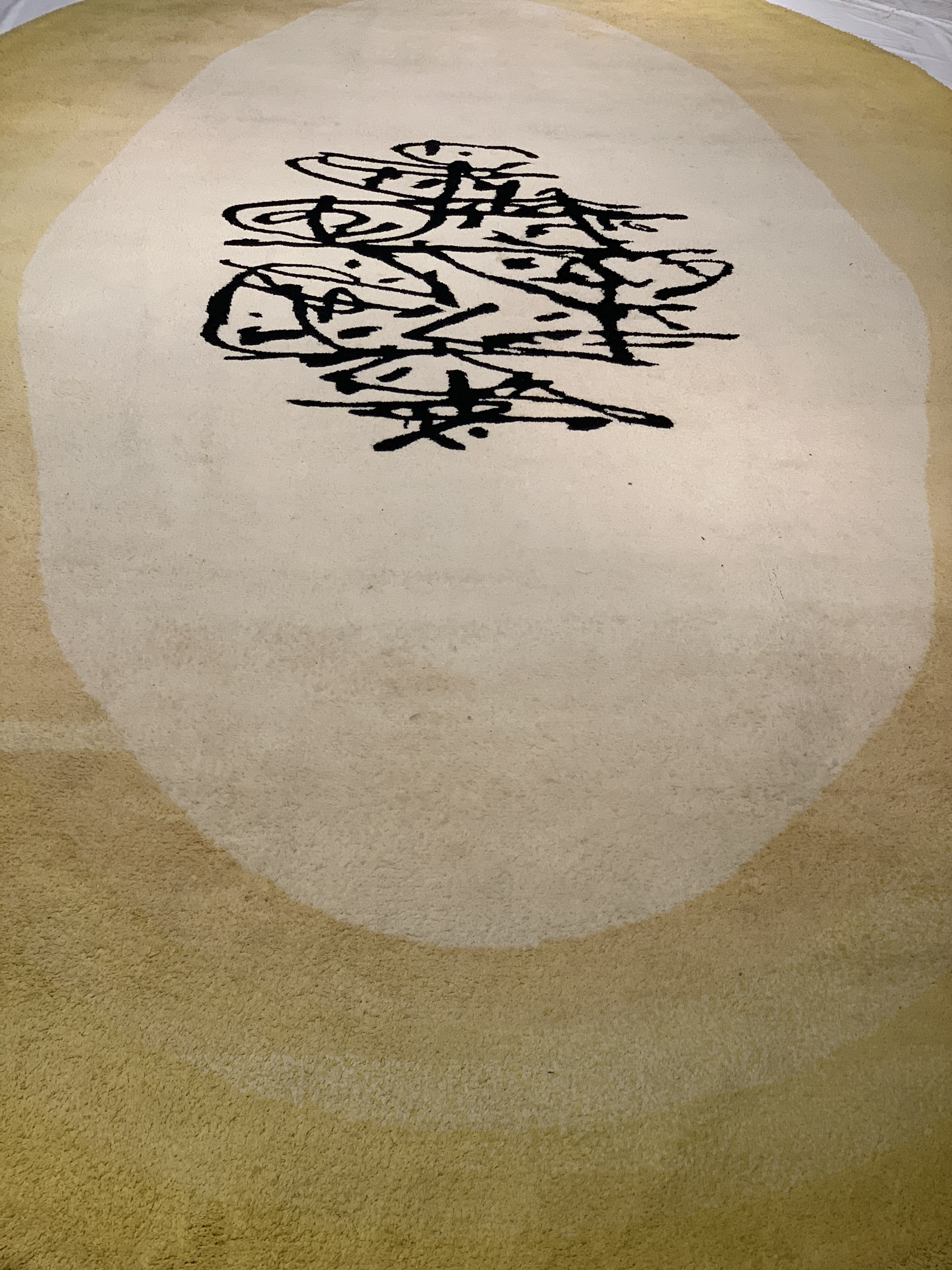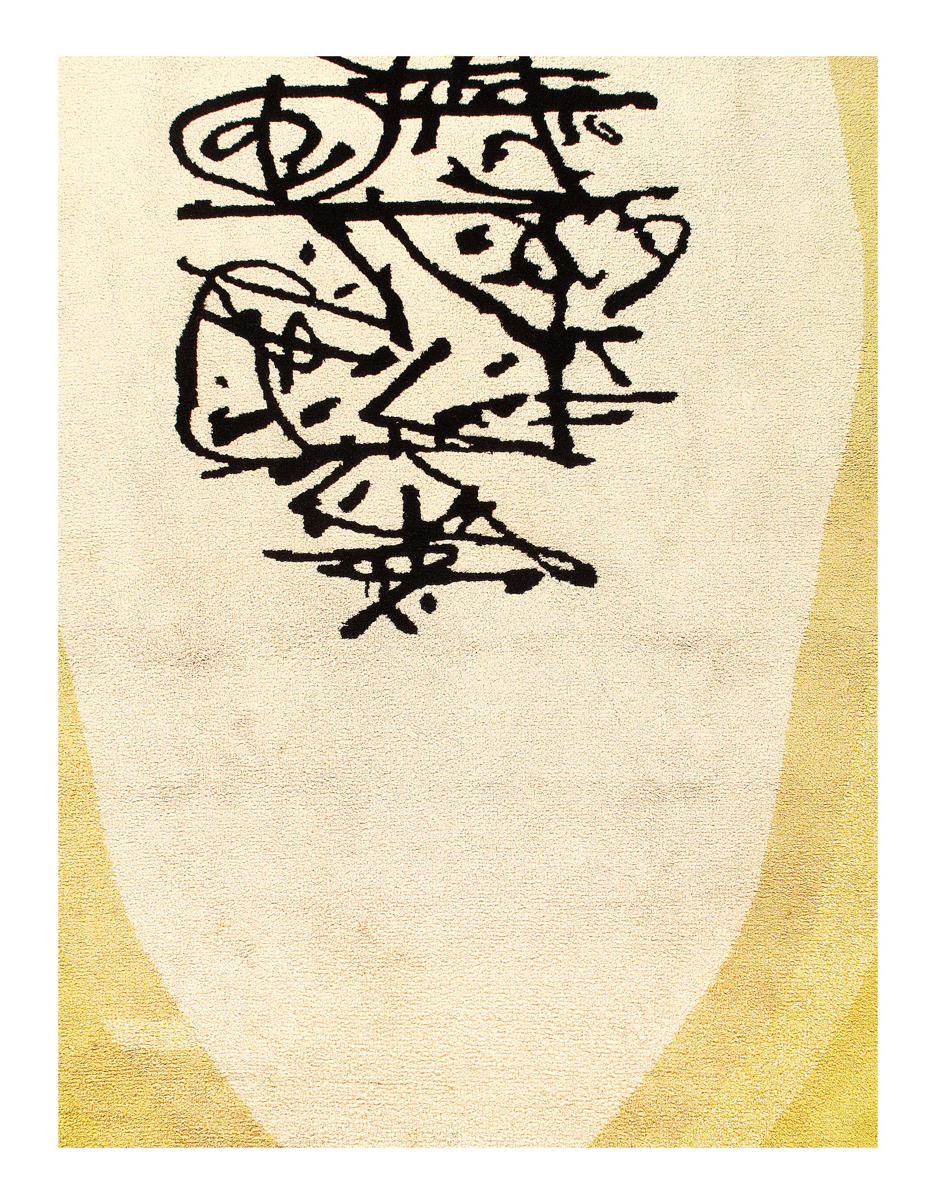 Custom Mid Century Modern wool rug, attributed to Antonio Saura, Manolo Millares, Carola Torres. Abstract rug features yellow banded borders with cream center and black abstract design.