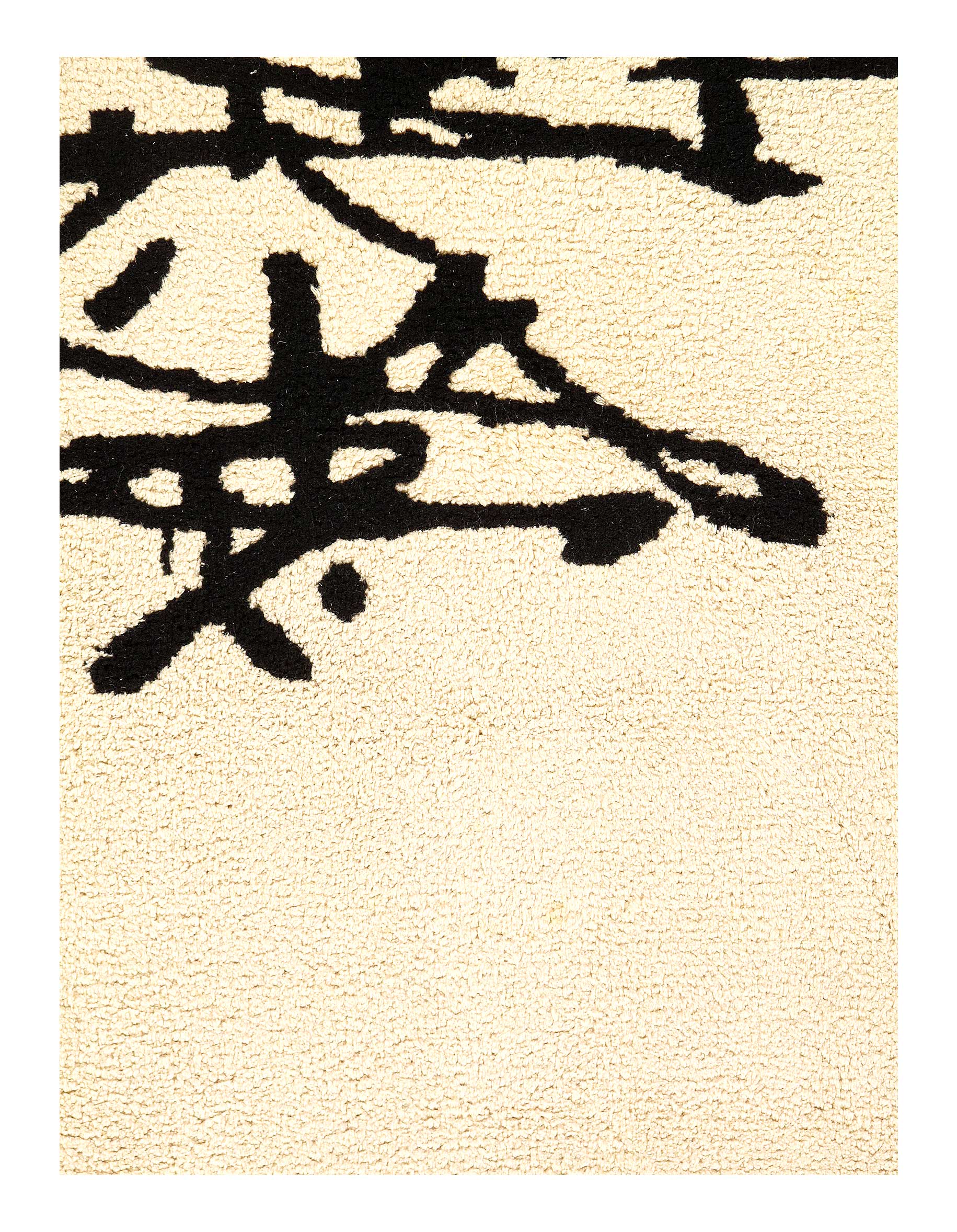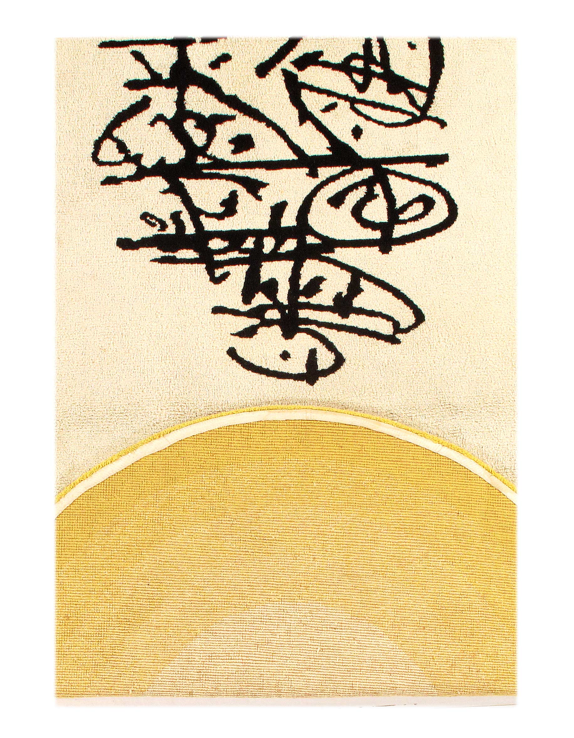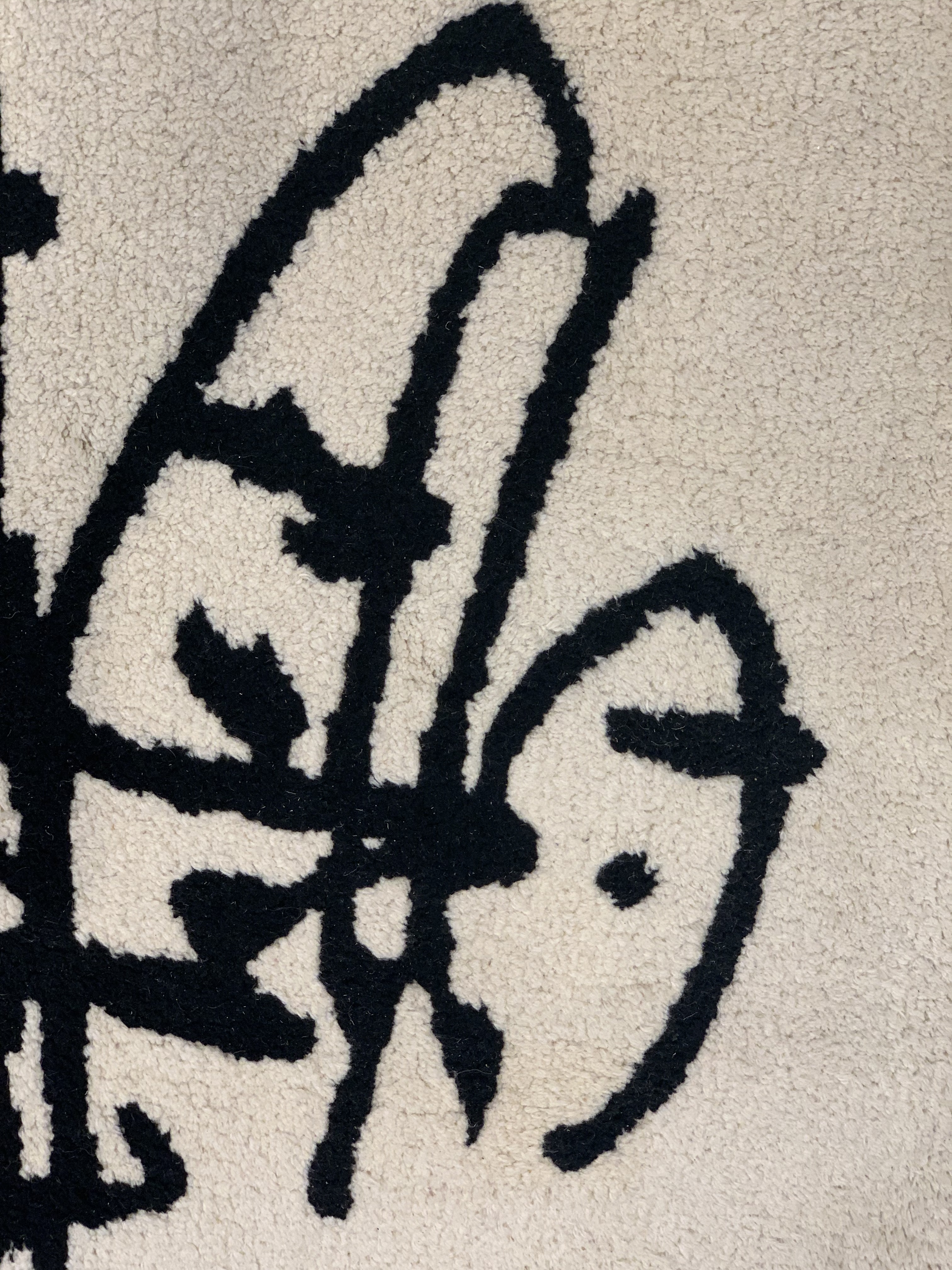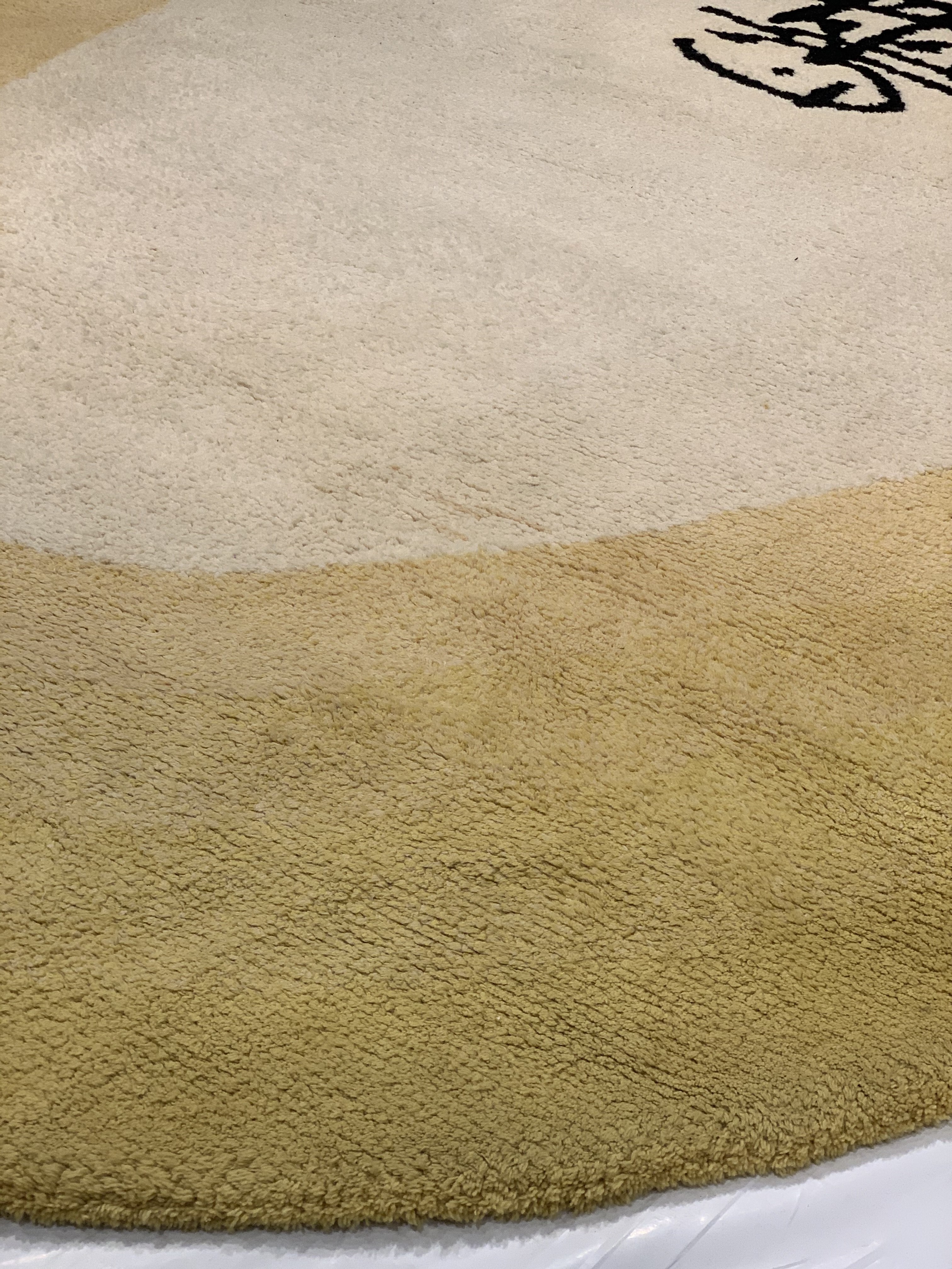 Custom Mid Century Modern wool rug, attributed to Antonio Saura, Manolo Millares, Carola Torres. Abstract rug features yellow banded borders with cream center and black abstract design.