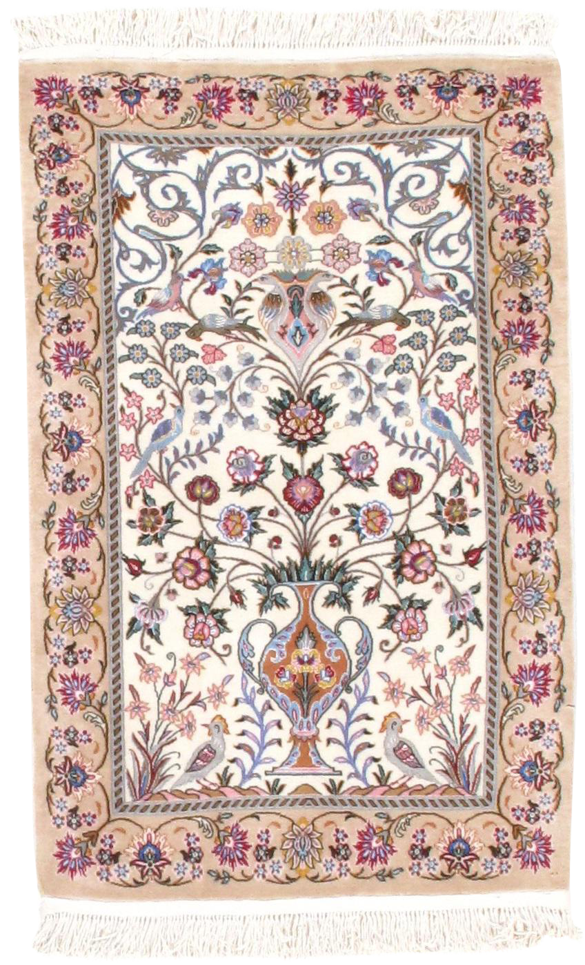 This outstanding midcentury Persian Isfahan carpet is primarily characterized by its classical composition. This beautiful carpet represents the highest levels of mastery achieved by Persian weavers. It showcases nature motifs that are astonishing in detail and intricacy. The precision with which this piece has been woven and the complexity of its details are impressive and unparalleled. Colors include various shades of ivory, red, salmon pink, and olive.
