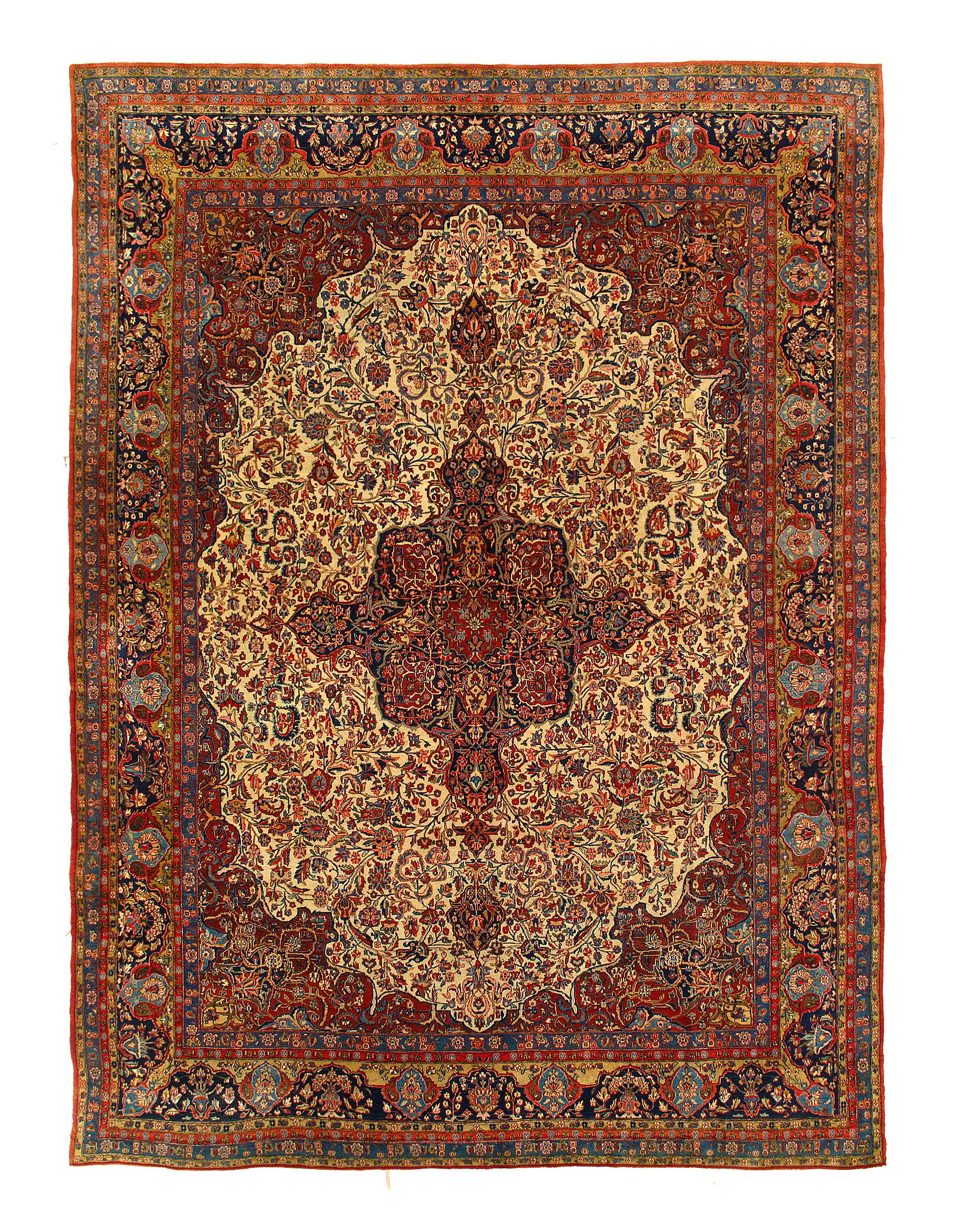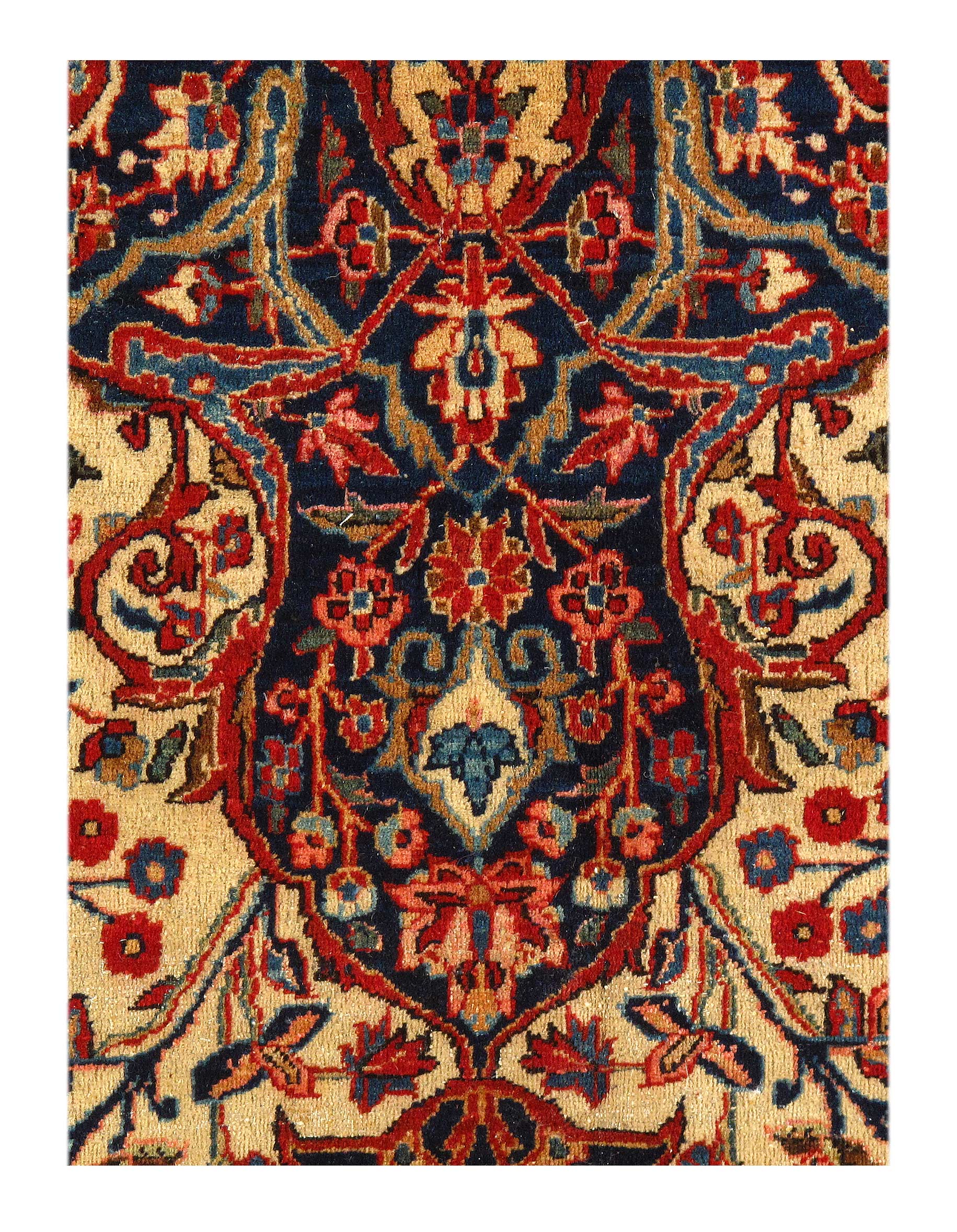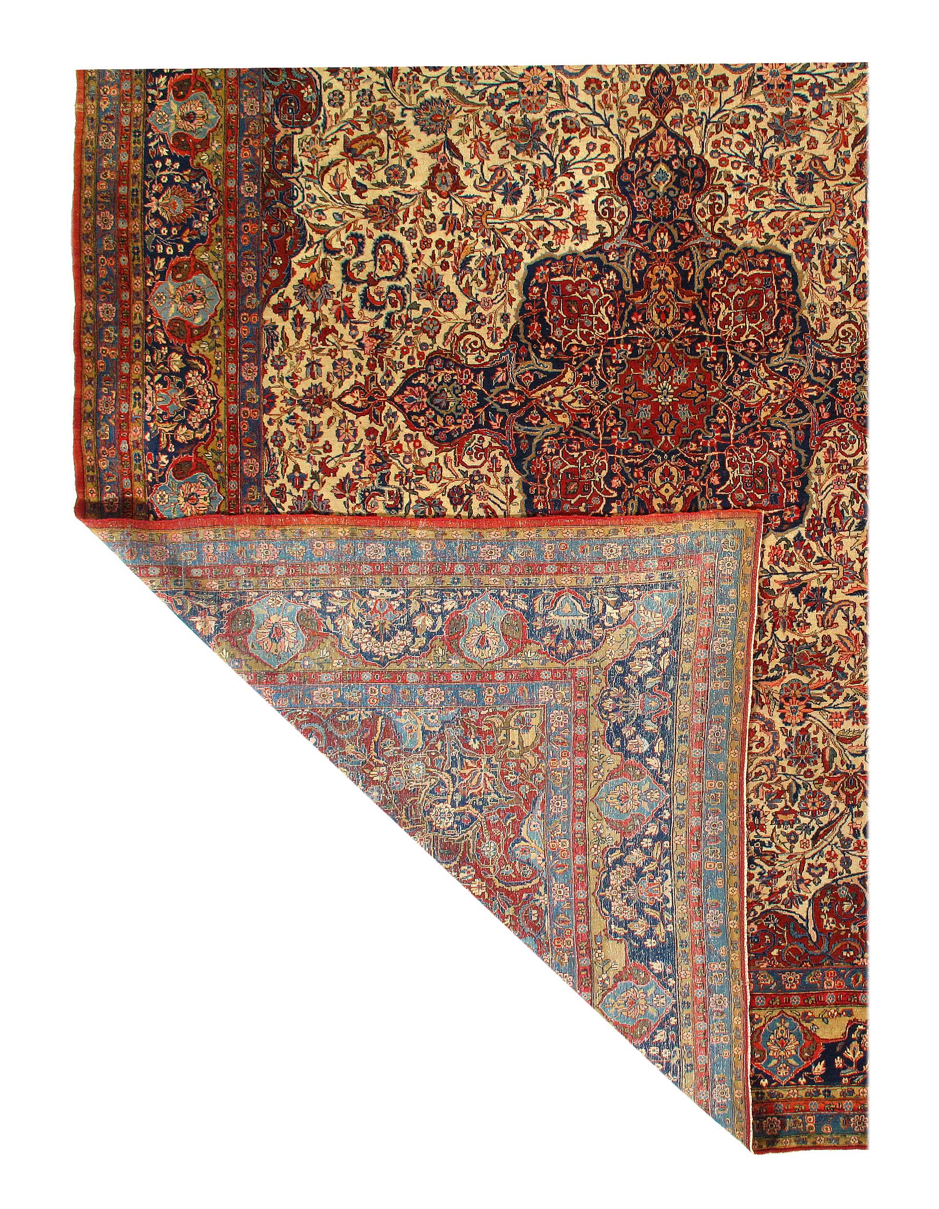 Kashan rug is typical of the fine rugs for which Kashan became famous in the 19th century. The color beige and rose gives the exquisite details depth, while the small diamond Allover accentuates the elegant flourishes in the field. The rich cerulean in the corners brings out elements elsewhere in the rug, particularly in the fine details around the border. Though the rug is relatively small in its dimensions, it is impactful, and thus works well even in larger areas.