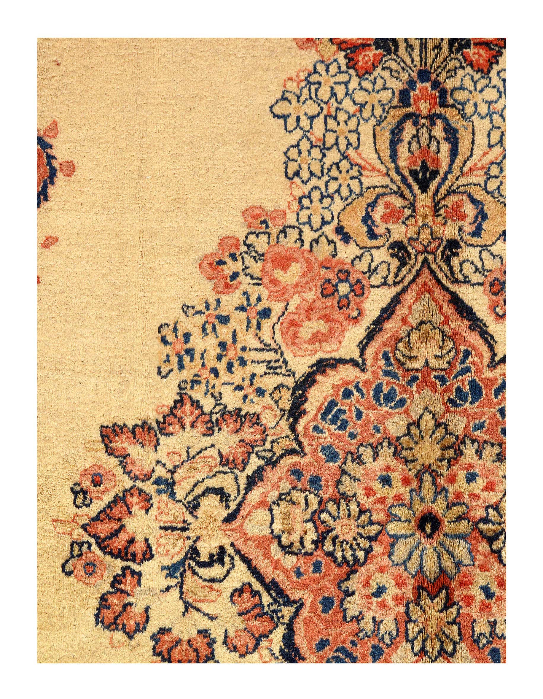 Beautiful Antique Ivory Background Sarouk Farhan Persian Rug D10542 Country of Origin / Rug Type: Persian Rug, Circa Date: 1900 – This beautiful antique Persian Sarouk Farahan rug features autumnal colors dominate the landscape, resulting in a brilliant display of color that seems almost nostalgic in its presentation. The warm colors invite the viewer to explore the Persian rug’s depths, and the clever use of dark and light contrasting around the borders establishes a clear grounding presence that helps define the appearance of the antique area rug as a whole. The largest border is surrounded on both sides by two thinner ones, which creates an even more refined arrangement, one that leads the viewer’s eyes effortlessly to the center of the antique Oriental rug, where the largest, “diamondback” form at the center features a darker color palette to dominate the lighter landscape.