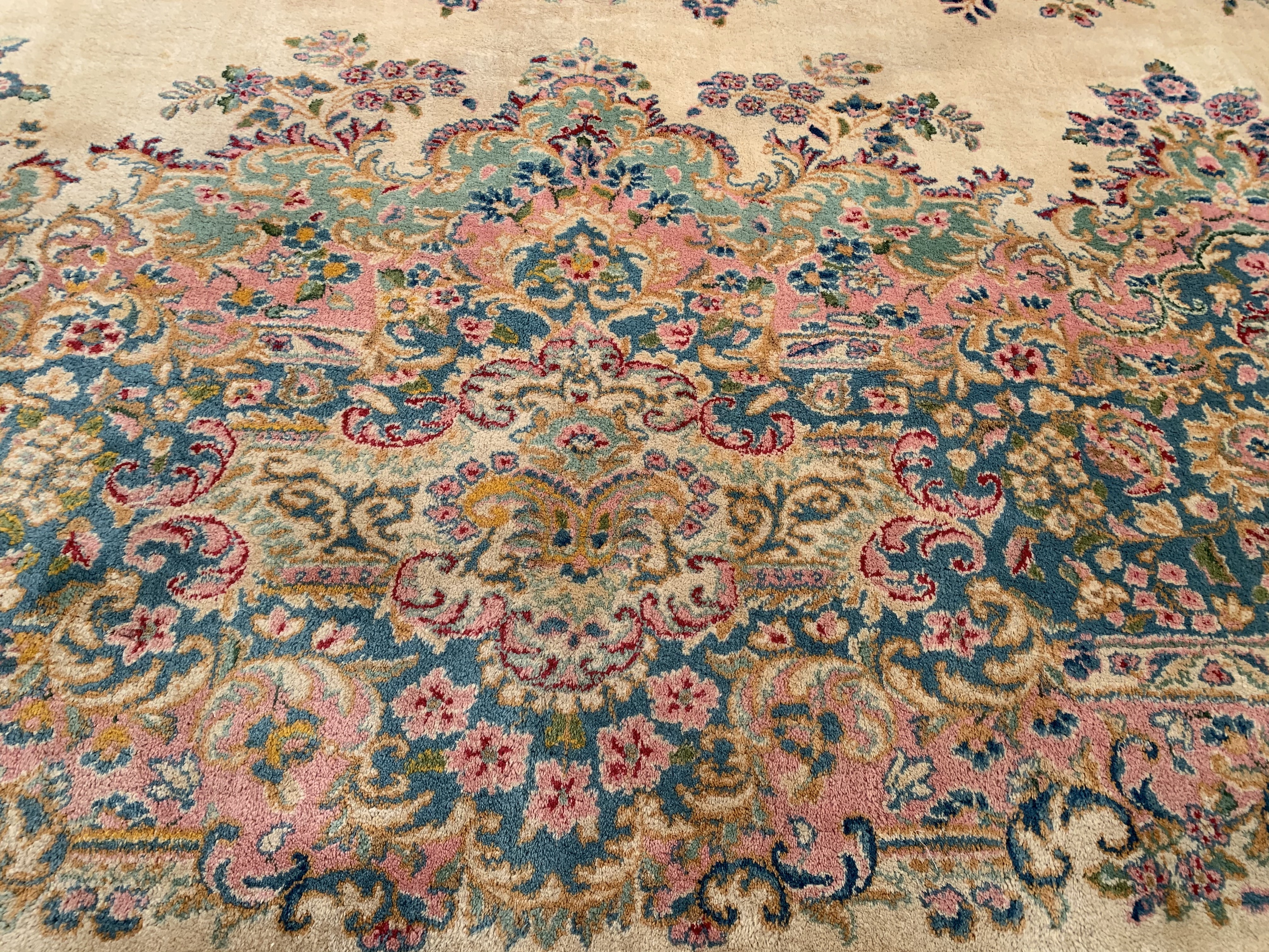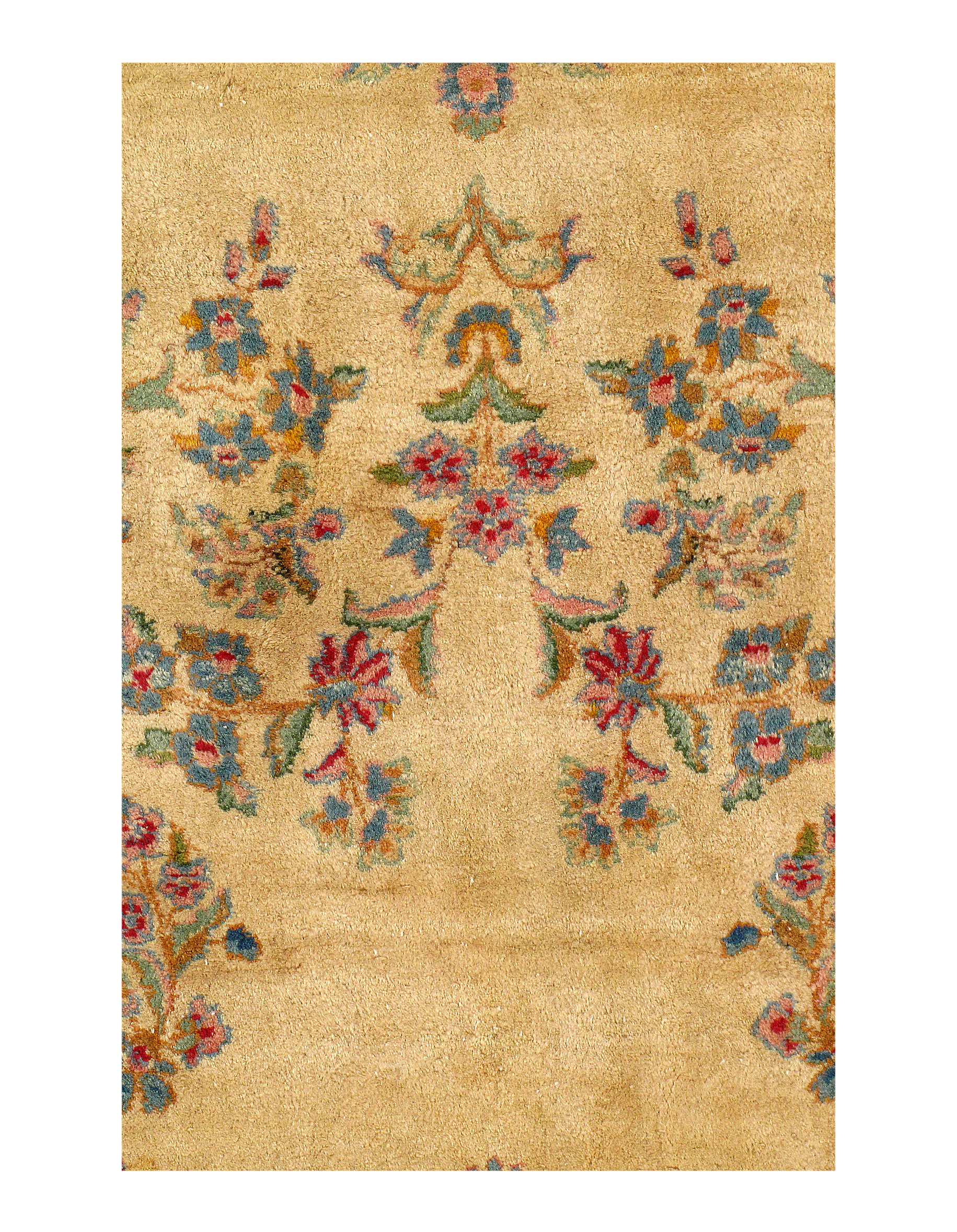 Kerman is an ancient city, with an incredible history going back over a thousand years. Marco Polo was one of the first westerners to view Kerman rugs. The city is located in the central south-eastern section of Iran, in the province that bears its name. Kerman rugs and carpets are perhaps one of the most recognizable within the antique Persian rug category. A typical pattern for Kerman rugs and carpets is a floral or architectural theme in the main border with a central medallion in the field. Other patterns include the finer Kerman Lavar style with garden, tree-of-life, vase, and all-over mille fleur designs, or the many pictorials which tell the story of a significant figure or event in history. The vase design carpets originated during the Safavieh dynasty, and are among the greatest masterpieces of Persian weaving.