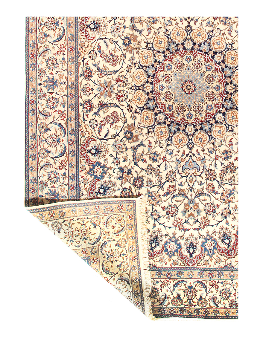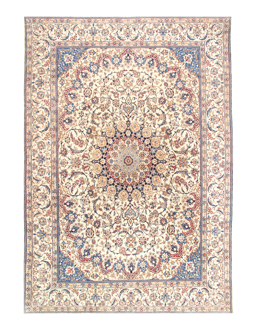 Beautiful hand-knotted Nain rug made from wool and silk. Nain is a small village located in central Iran that has relatively recently become a renowned center for carpet weaving. Production began here in the 1930s. Although Nain rugs are not as old as many of the traditional Persian rugs, they retain their value in terms of construction. They are also exquisite in design due to their use of silk in weaving both the foundation and fine pile of many rugs from the area.