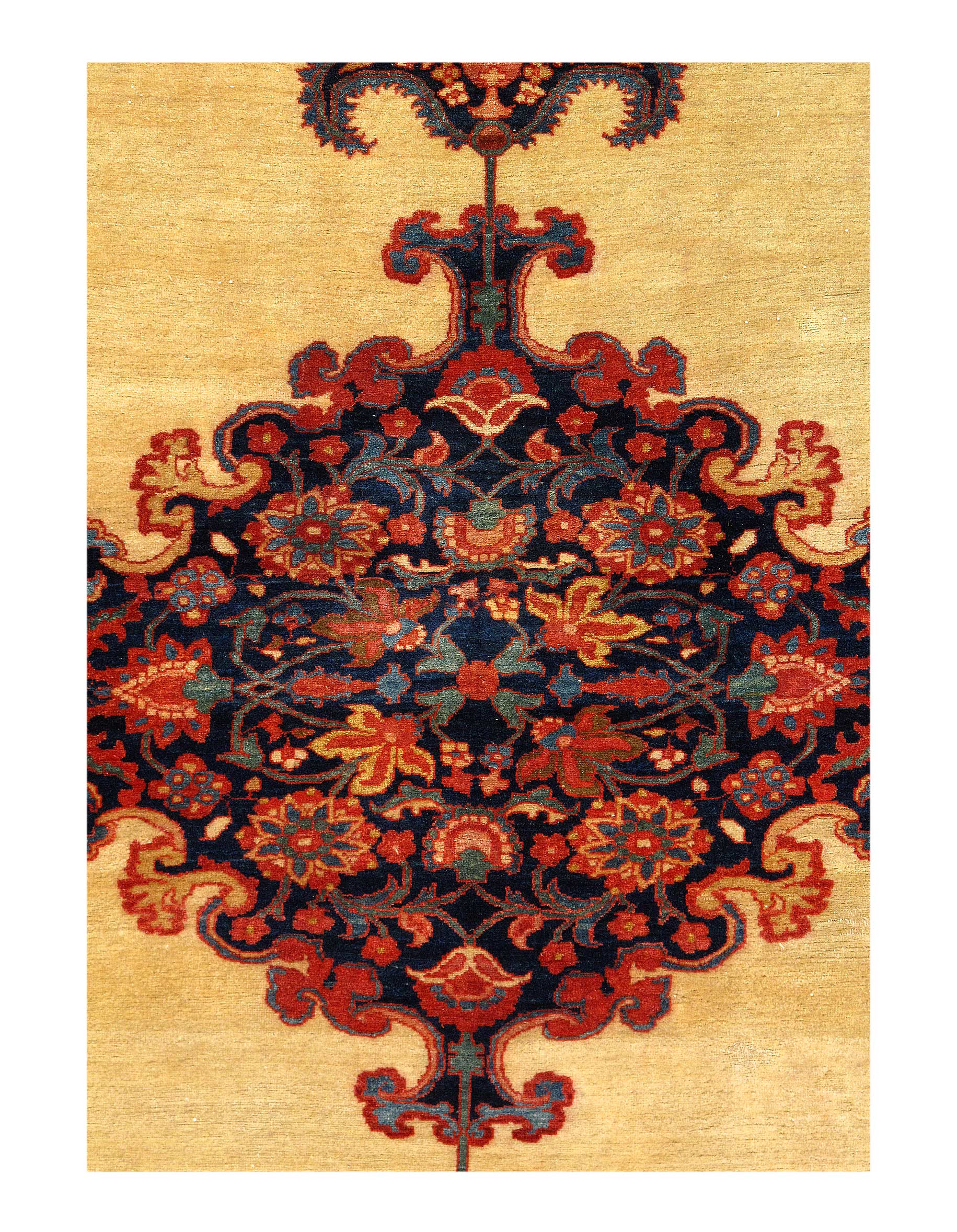 The rich brick red colored central medallion is set against the light creamy white color of central field. This creates a magnificently exciting juxtaposition which also helps to showcase the beautiful intricacy of the design patterns.