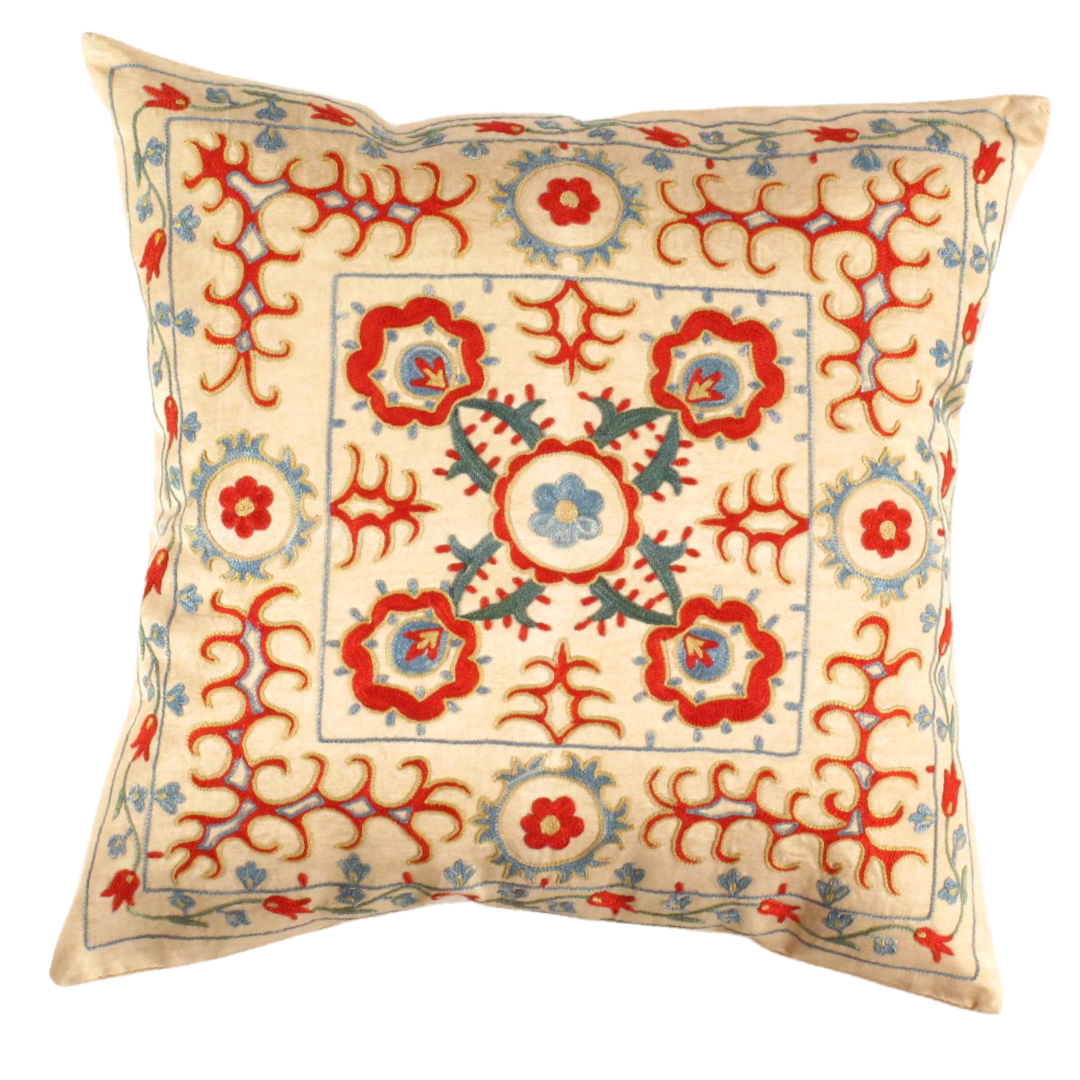 ● True to the “needle” origin of the Persian word suzani, these pillows are embroidered with traditional floral motifs in richly coloured patterns that define this historic style.