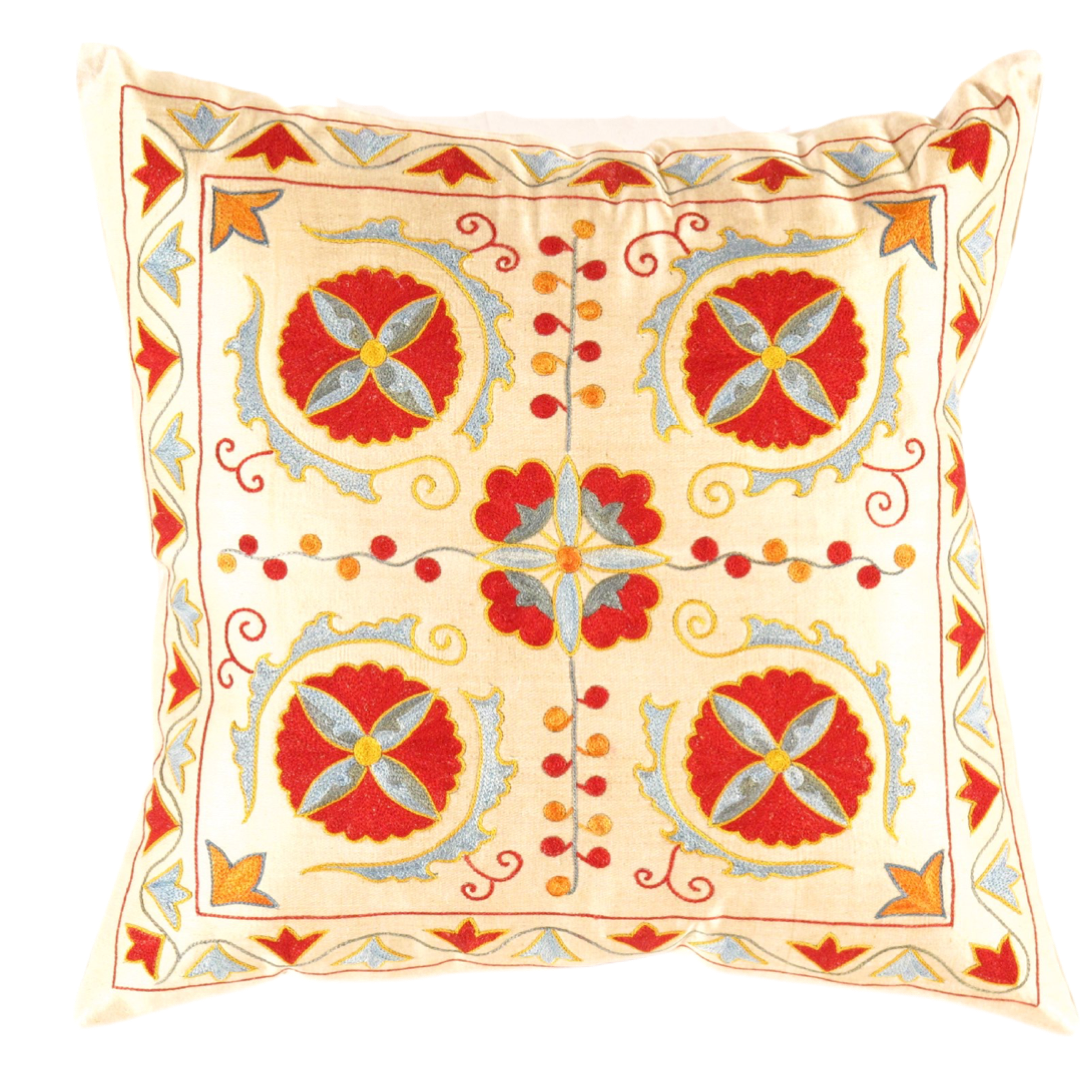 ● True to the “needle” origin of the Persian word suzani, these pillows are embroidered with traditional floral motifs in richly coloured patterns that define this historic style.