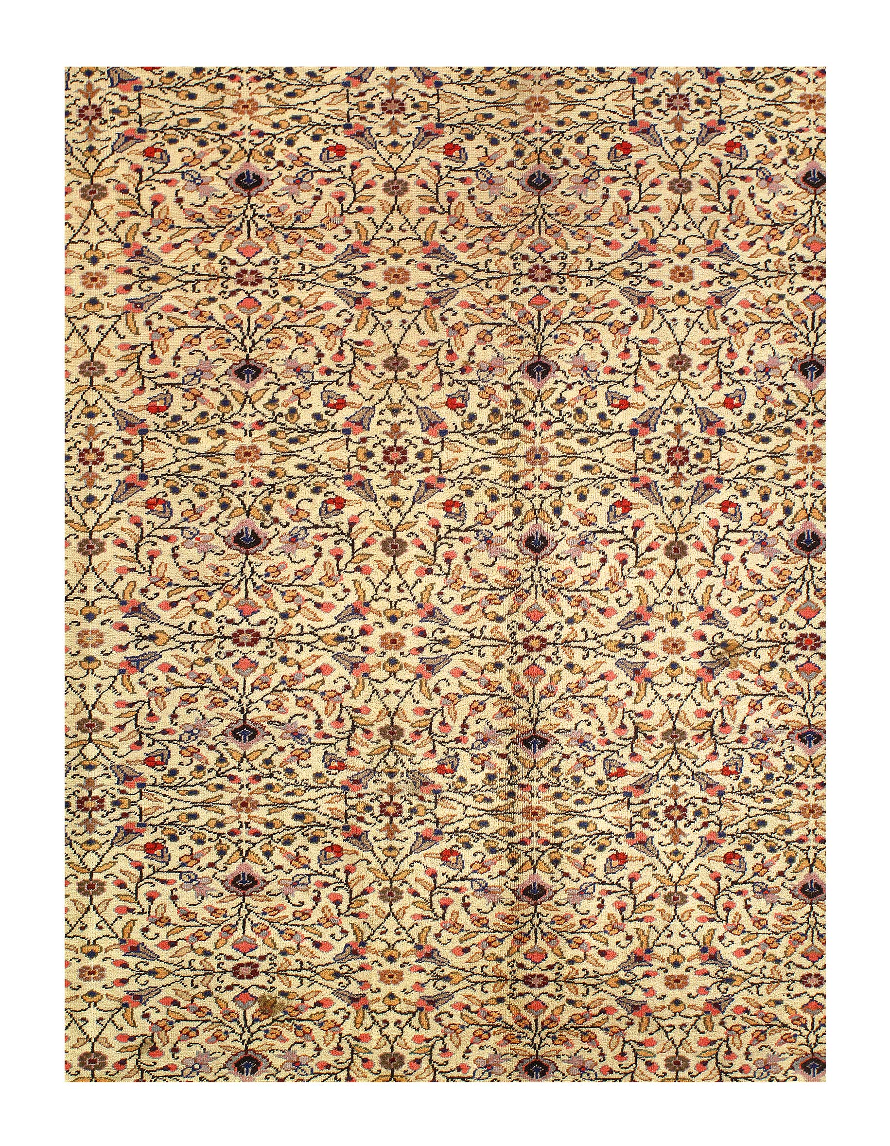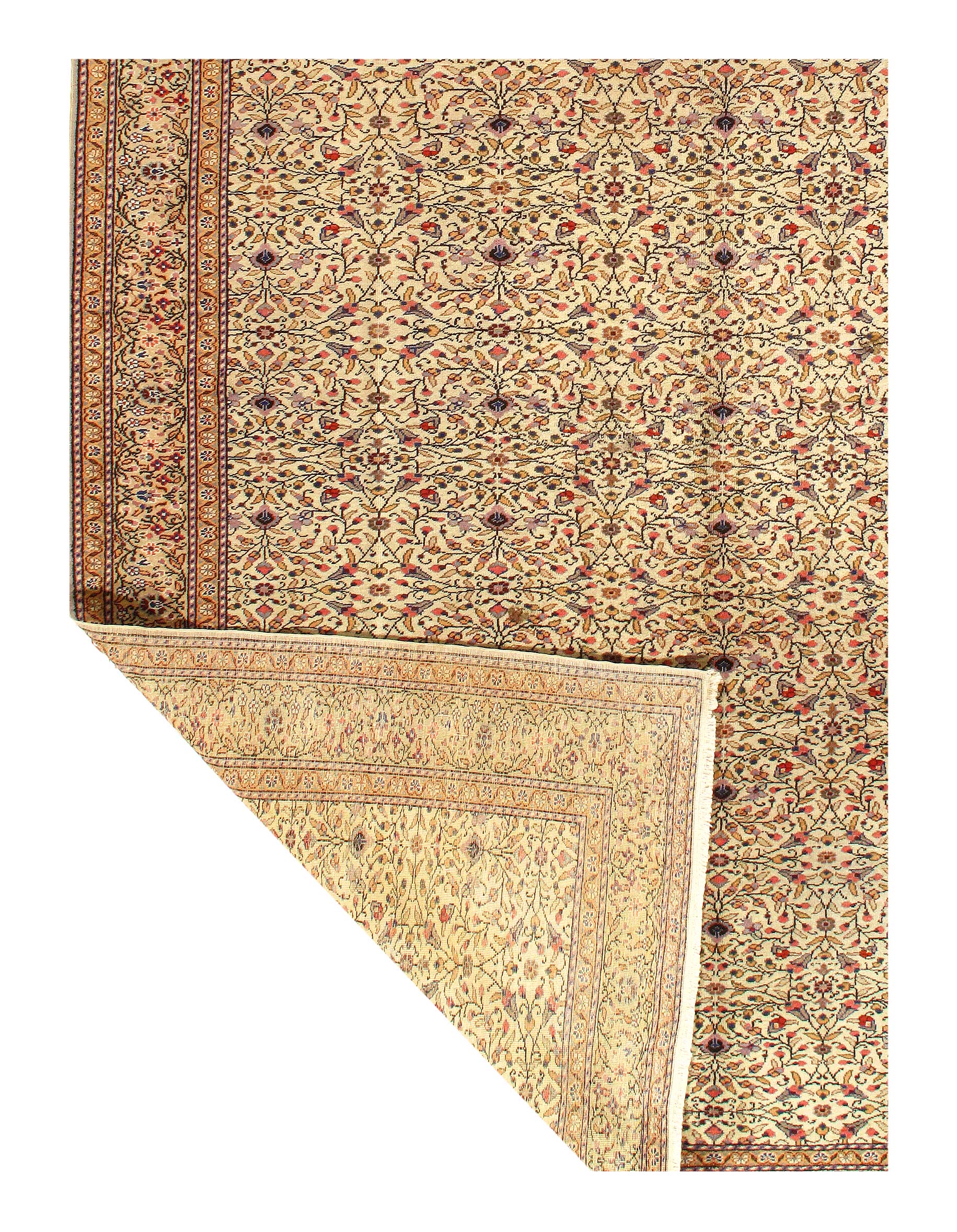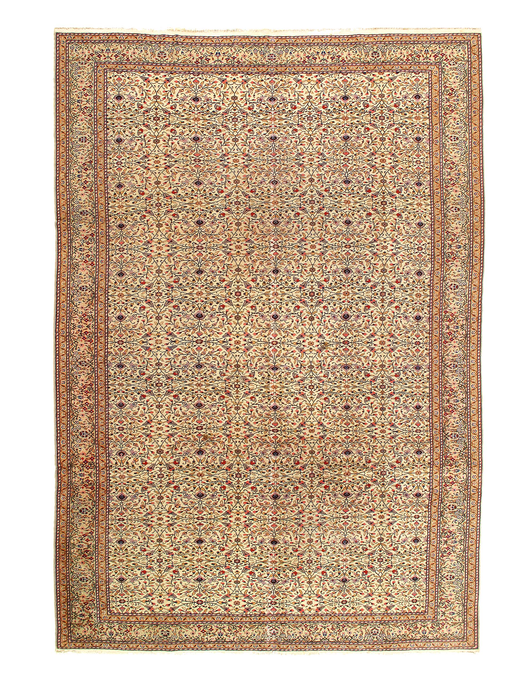Turkish Tabriz Rug, Origin: Turkey, – Woven in Turkey, this archetypal Mina Khani-style carpet features traditional Persian colors and an exquisite latticework pattern with an intricate network of intersecting vines running through central palmettes, blossom medallions and segmented rosettes. This classic Tabriz rug is completed by generous borders featuring a sienna background dotted with clusters of flowers, leaves and botanical elements.