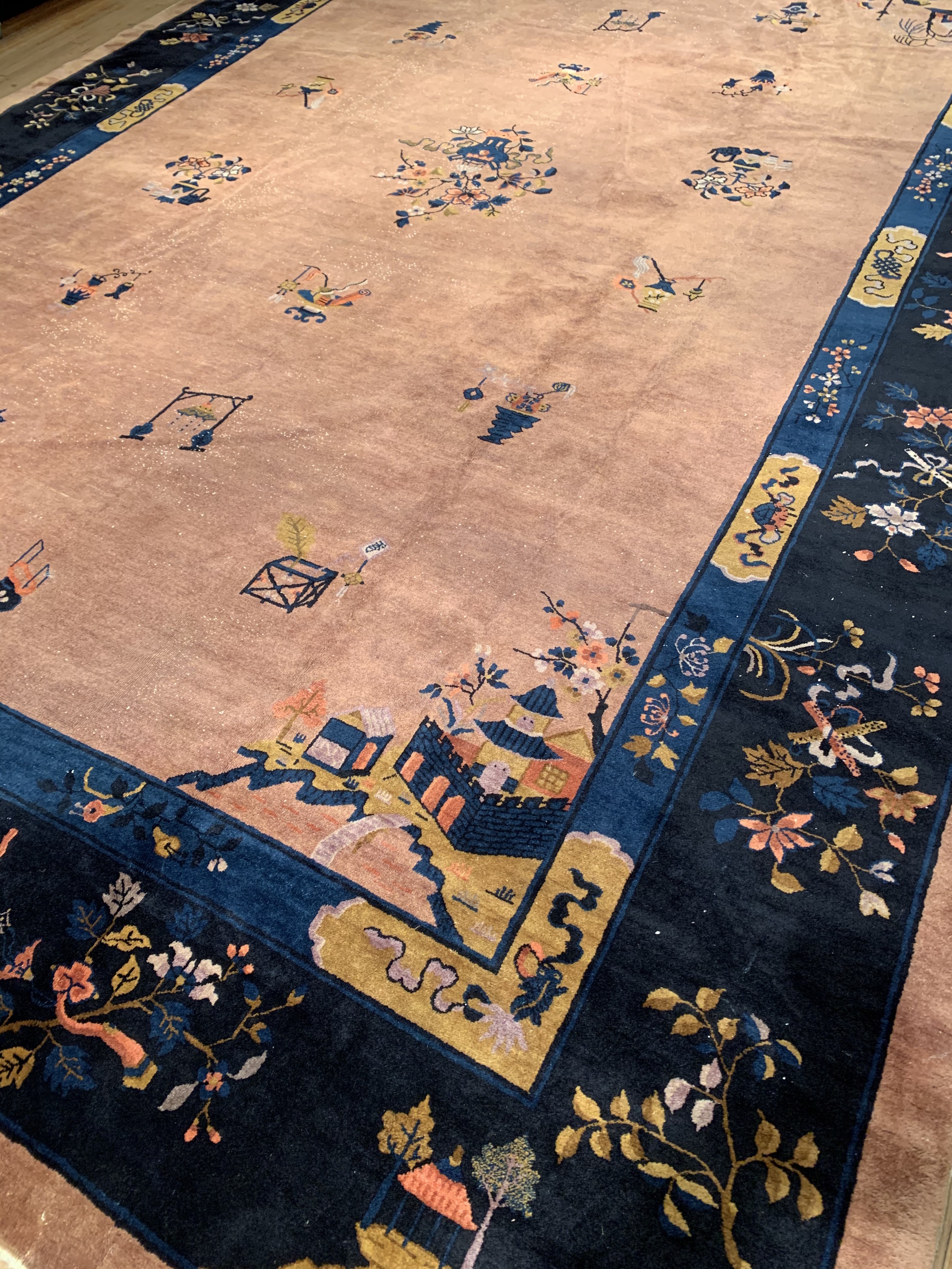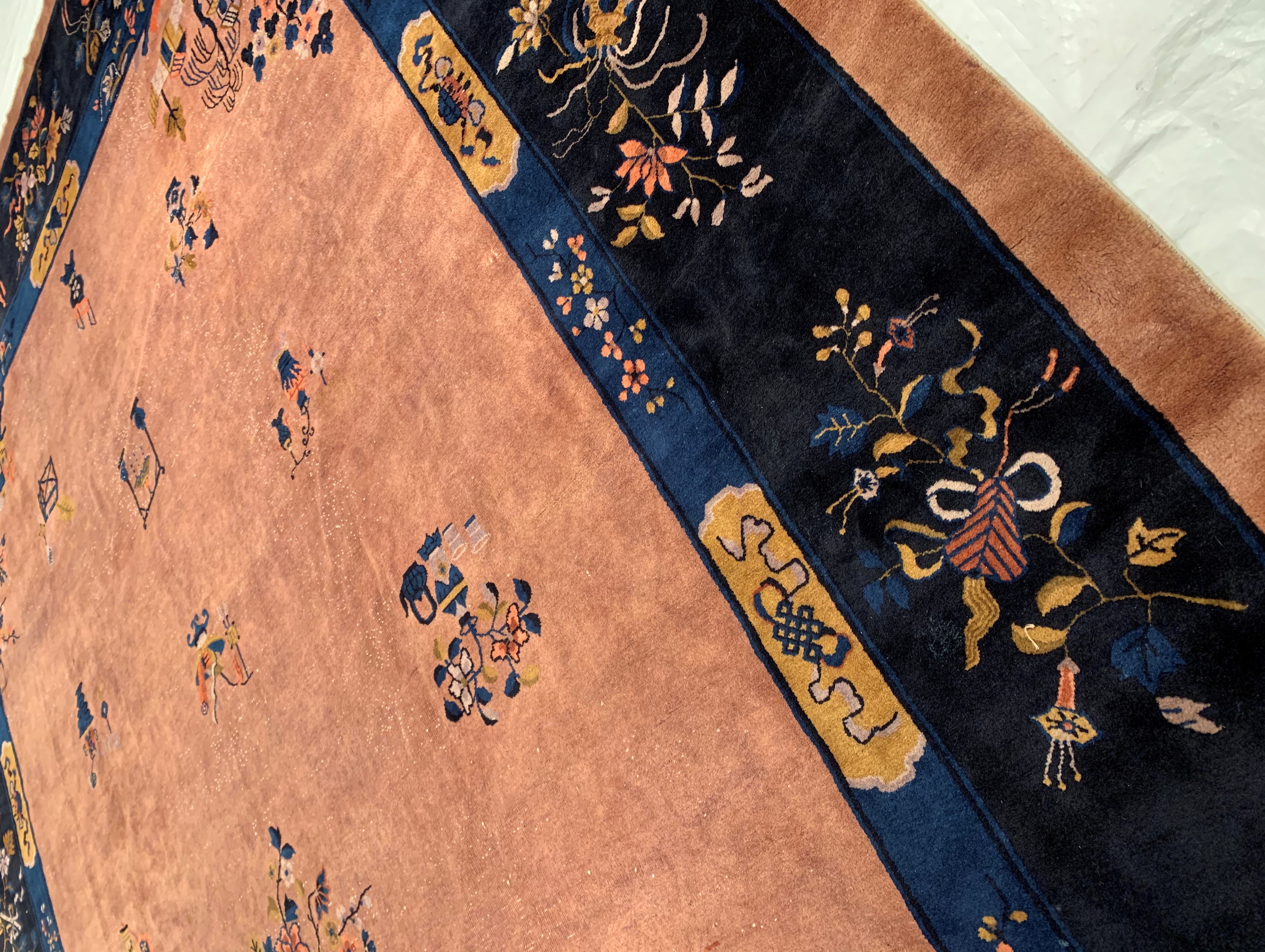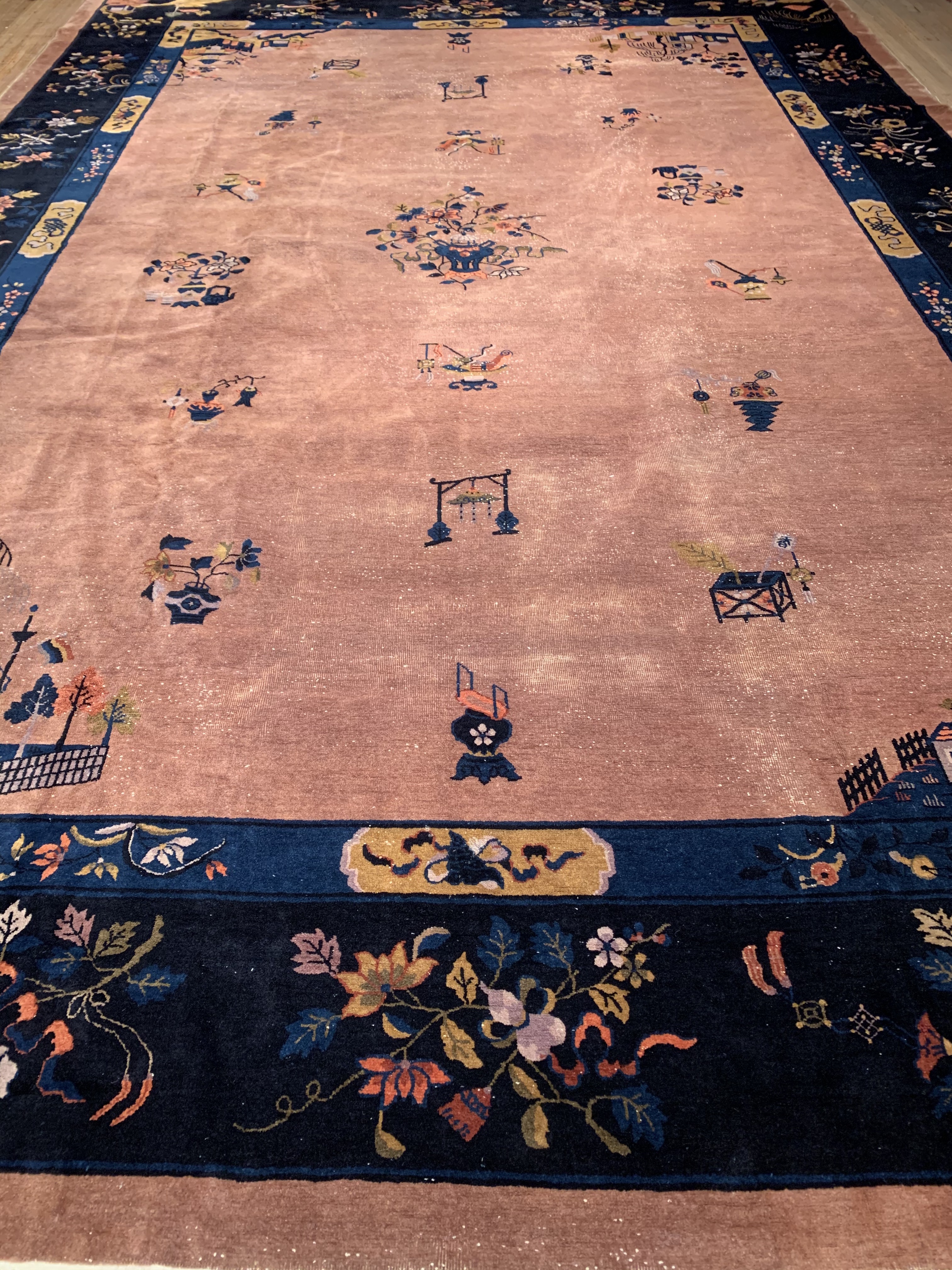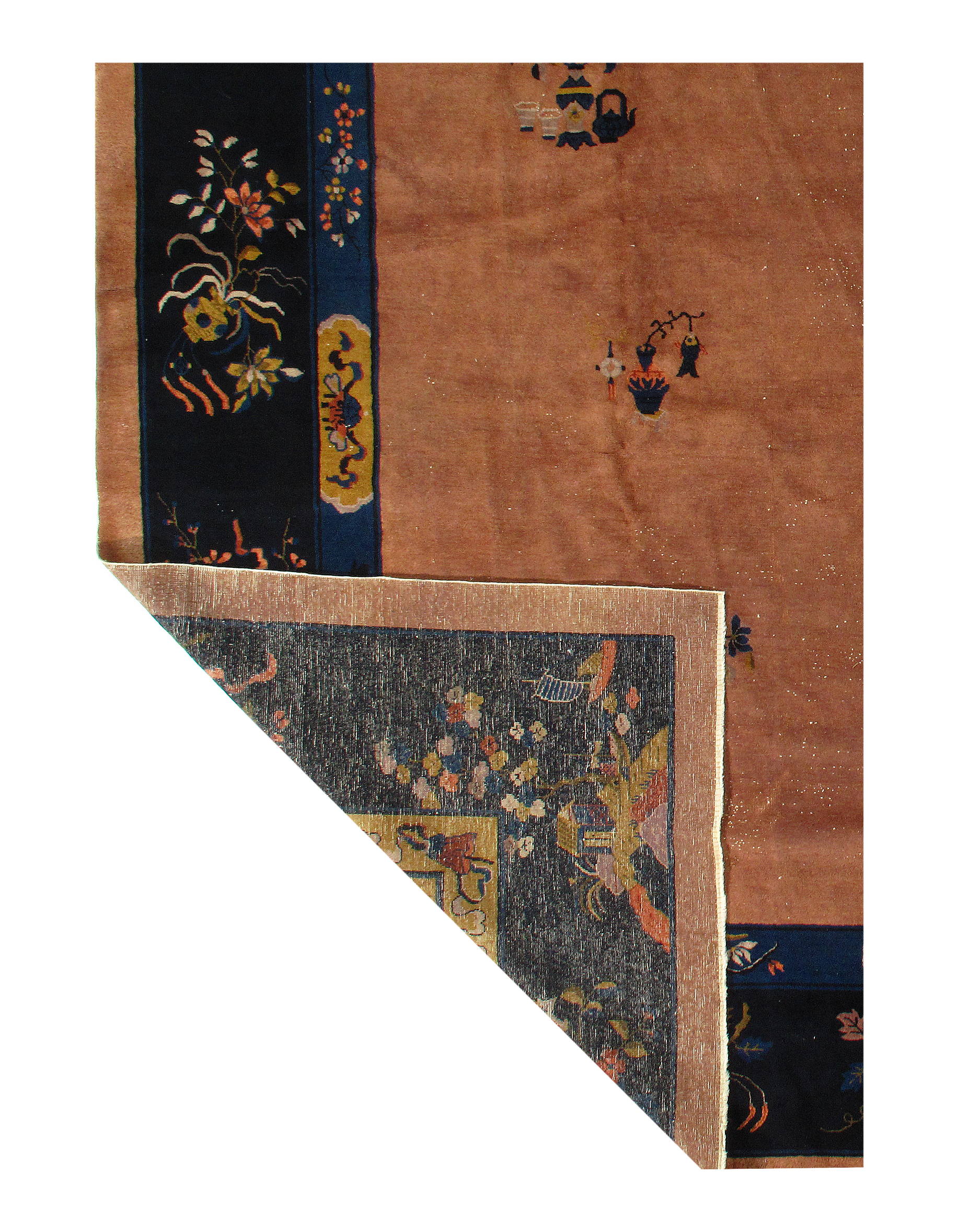 Chinese Deco Rug, Origin: China, Circa: 1920s– Here is an exciting and appealing antique Oriental carpet – an antique Art Deco rug that was designed and woven in China during the early years of the twentieth century. Heavily informed by the aesthetic inclinations of the Art Deco period, this unique carpet is a compelling and thought-provoking example. A scalloped border ofLight Green encloses a Rose sand field on this exquisitely subtle and restrained antique Chinese Art Deco. At first the field appears empty or open, but it is actually covered by a tone-on-tone design of scrolls and cloud-bands emanating inward from the outer edges. In their sinuous rhythms they echo the scalloped forms of the border and continue its visual effects across the carpet in a more subdued manner. This carpet testifies to the masterful design sensibilities of Chinese weavers as they made the transition into the modern world. The Art Deco movement had an outside influence on the world of art and design, and some of the most important qualities and characteristics of that movement may be found in this fine rug.