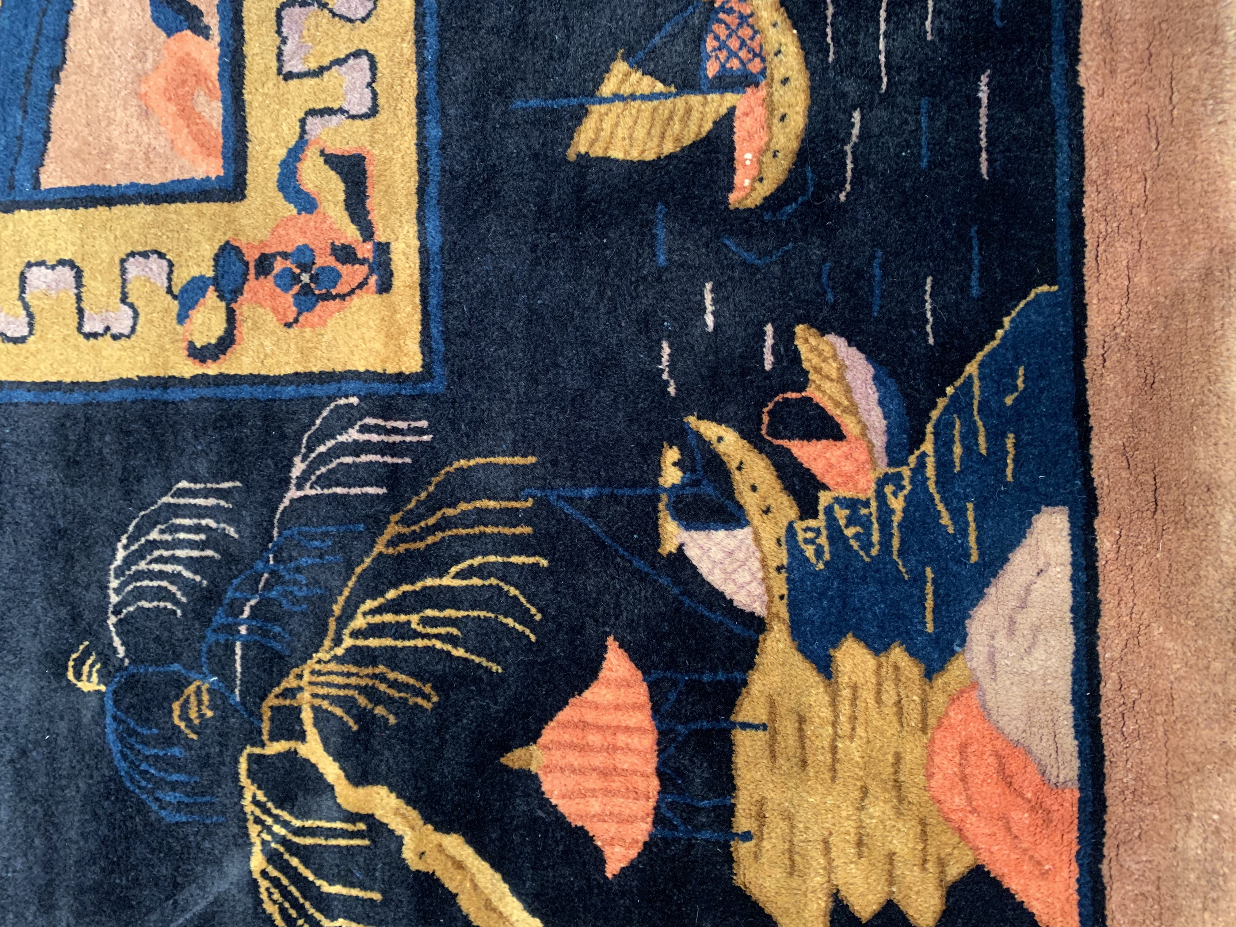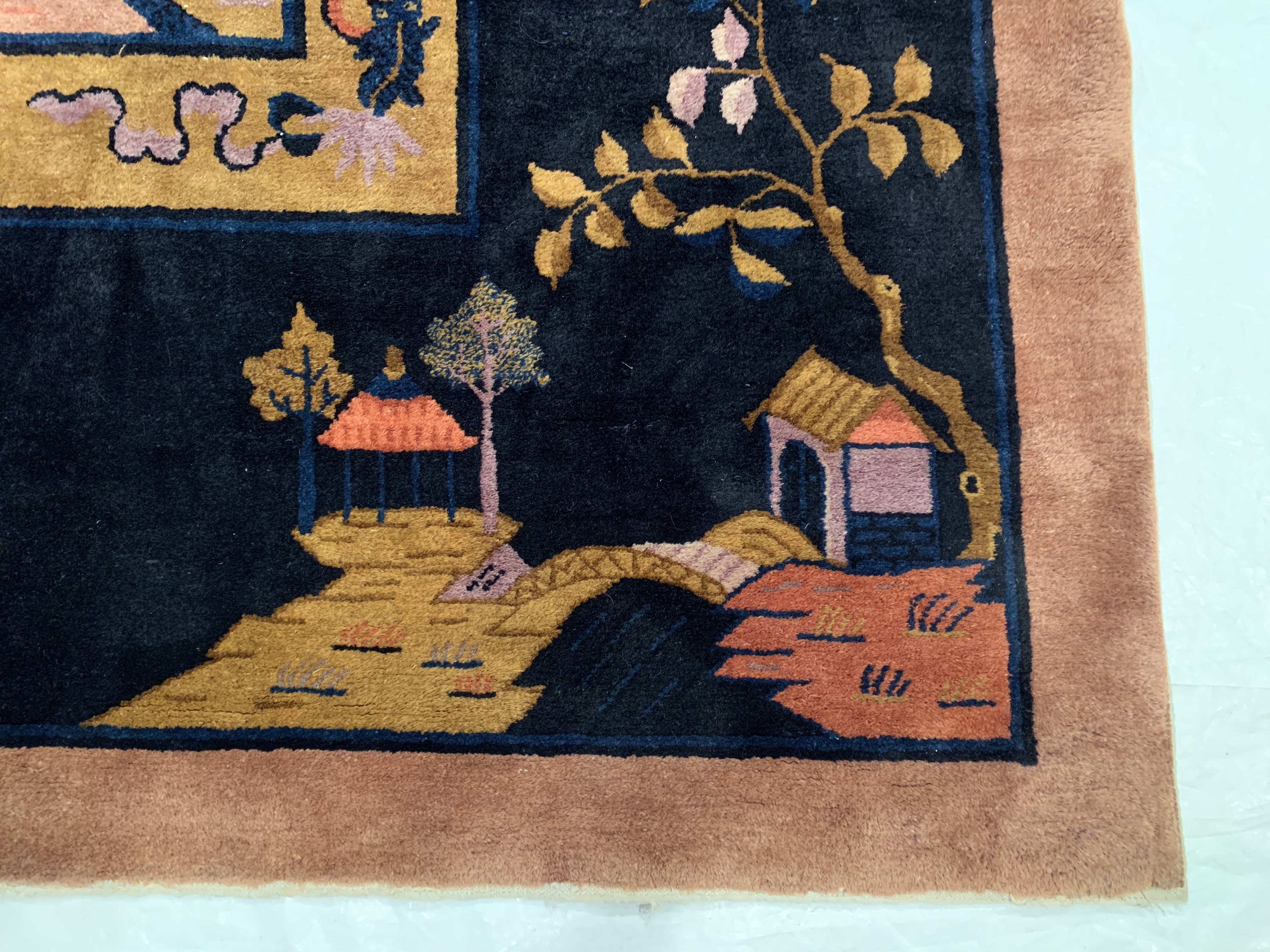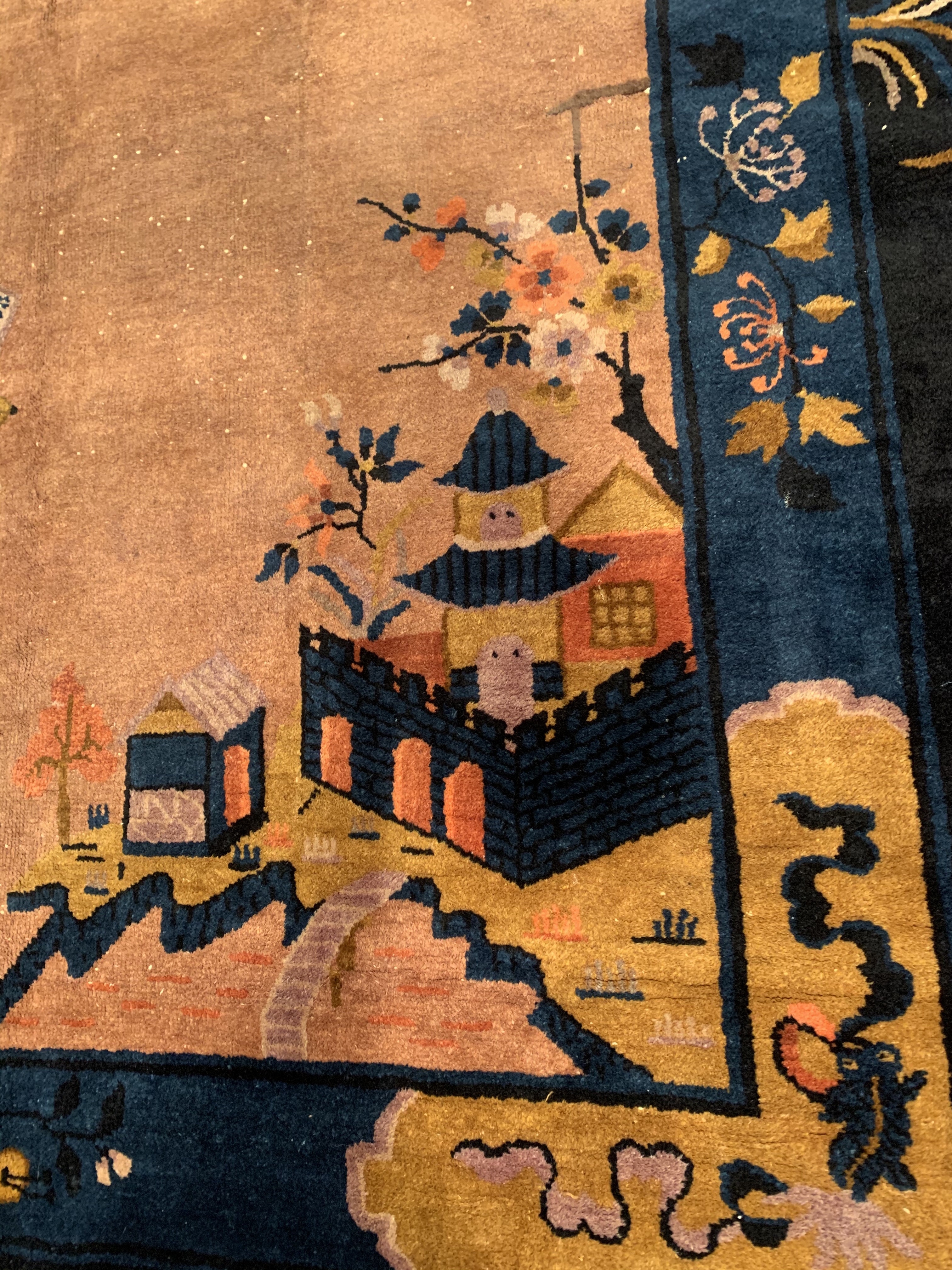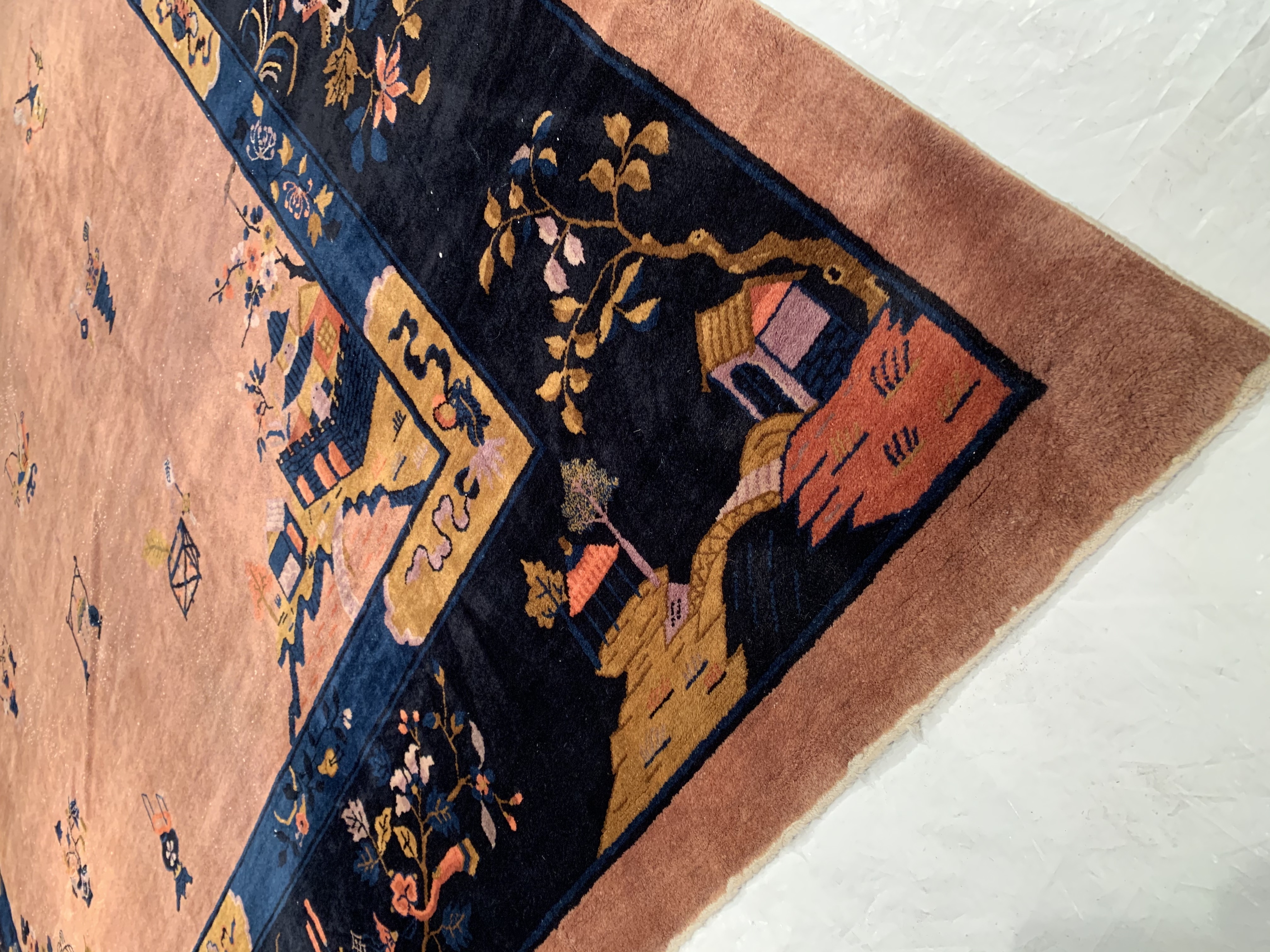 Chinese Deco Rug, Origin: China, Circa: 1920s– Here is an exciting and appealing antique Oriental carpet – an antique Art Deco rug that was designed and woven in China during the early years of the twentieth century. Heavily informed by the aesthetic inclinations of the Art Deco period, this unique carpet is a compelling and thought-provoking example. A scalloped border ofLight Green encloses a Rose sand field on this exquisitely subtle and restrained antique Chinese Art Deco. At first the field appears empty or open, but it is actually covered by a tone-on-tone design of scrolls and cloud-bands emanating inward from the outer edges. In their sinuous rhythms they echo the scalloped forms of the border and continue its visual effects across the carpet in a more subdued manner. This carpet testifies to the masterful design sensibilities of Chinese weavers as they made the transition into the modern world. The Art Deco movement had an outside influence on the world of art and design, and some of the most important qualities and characteristics of that movement may be found in this fine rug.