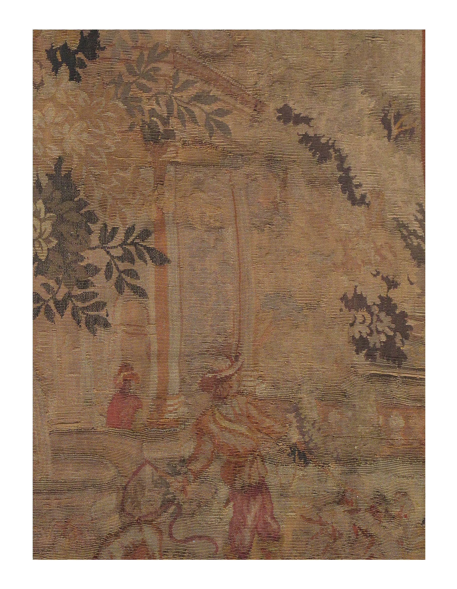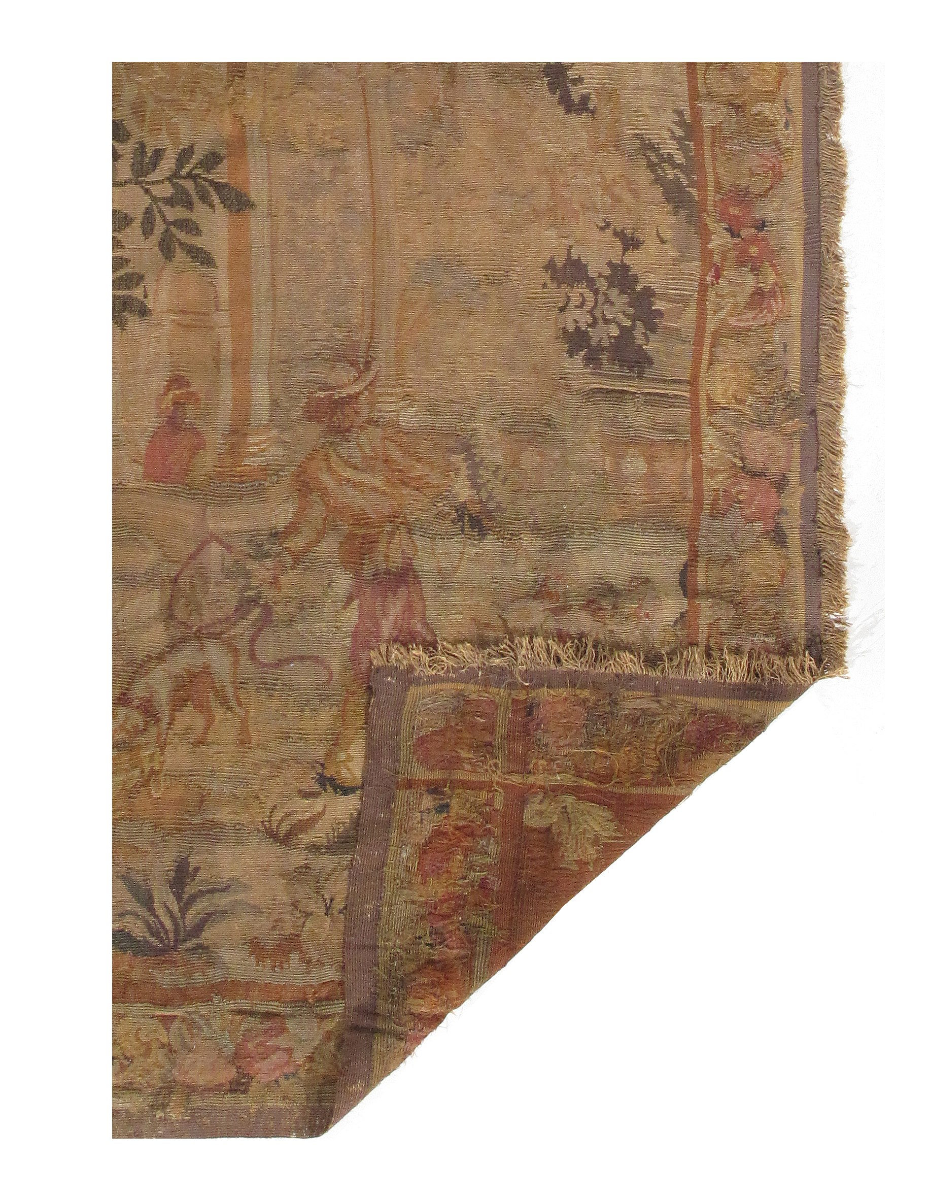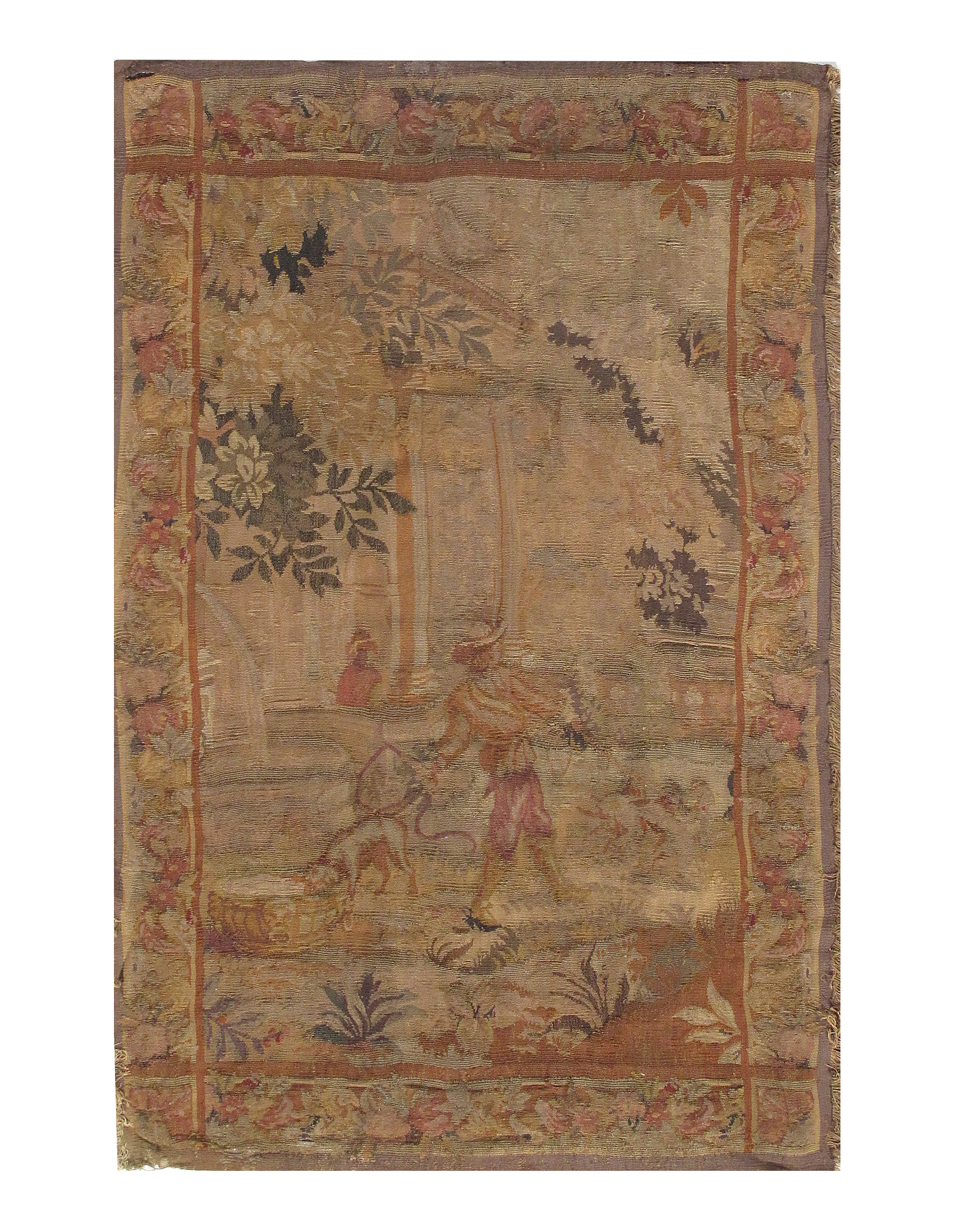 French Tapestry, France – Here is a truly wonderful rug – a tapestry made in France. This rug represents something genuinely special, and is a testament to the artisans who produced it. A beautiful piece, this rug possesses many of the qualities most sought after by collectors and experts, and would bring beauty and sophistication to any home. Surrounded by an archetypal floral border, this naturalist tapestry from France features a pastoral forest scene with rocks, plants, grasses, vines and trees extending into the distance. Detailed shading adds depth and dimension to the craggy rocks, textural tree bark and shadowy foliage while the scalloped leaves in the tree canopy evoke a vague oriental influence. Simply put, this rug is a remarkable piece of work. A lovely and elegant design and composition combine to make this rug something more than a decorative piece: they combine to make it a veritable work of art