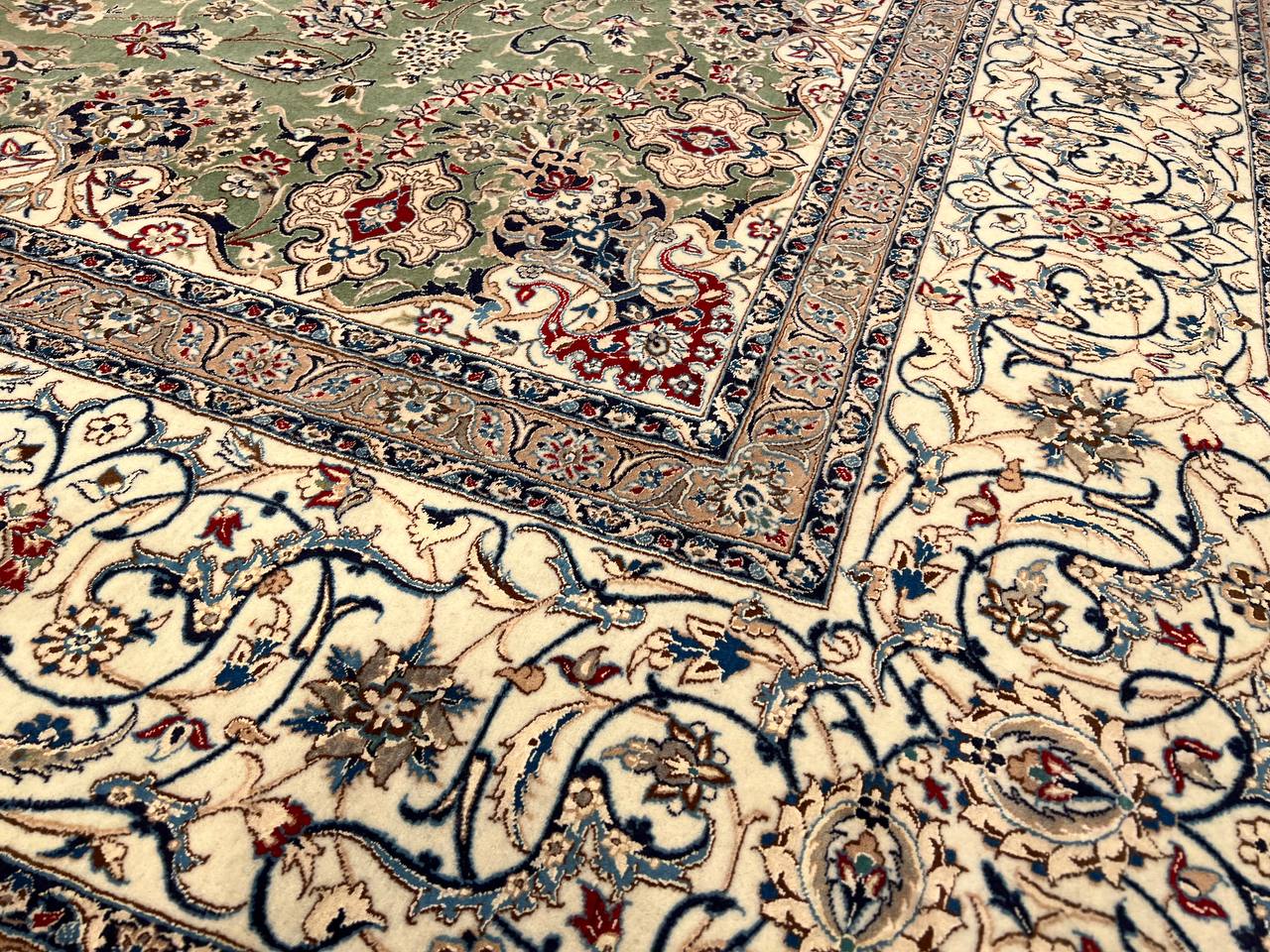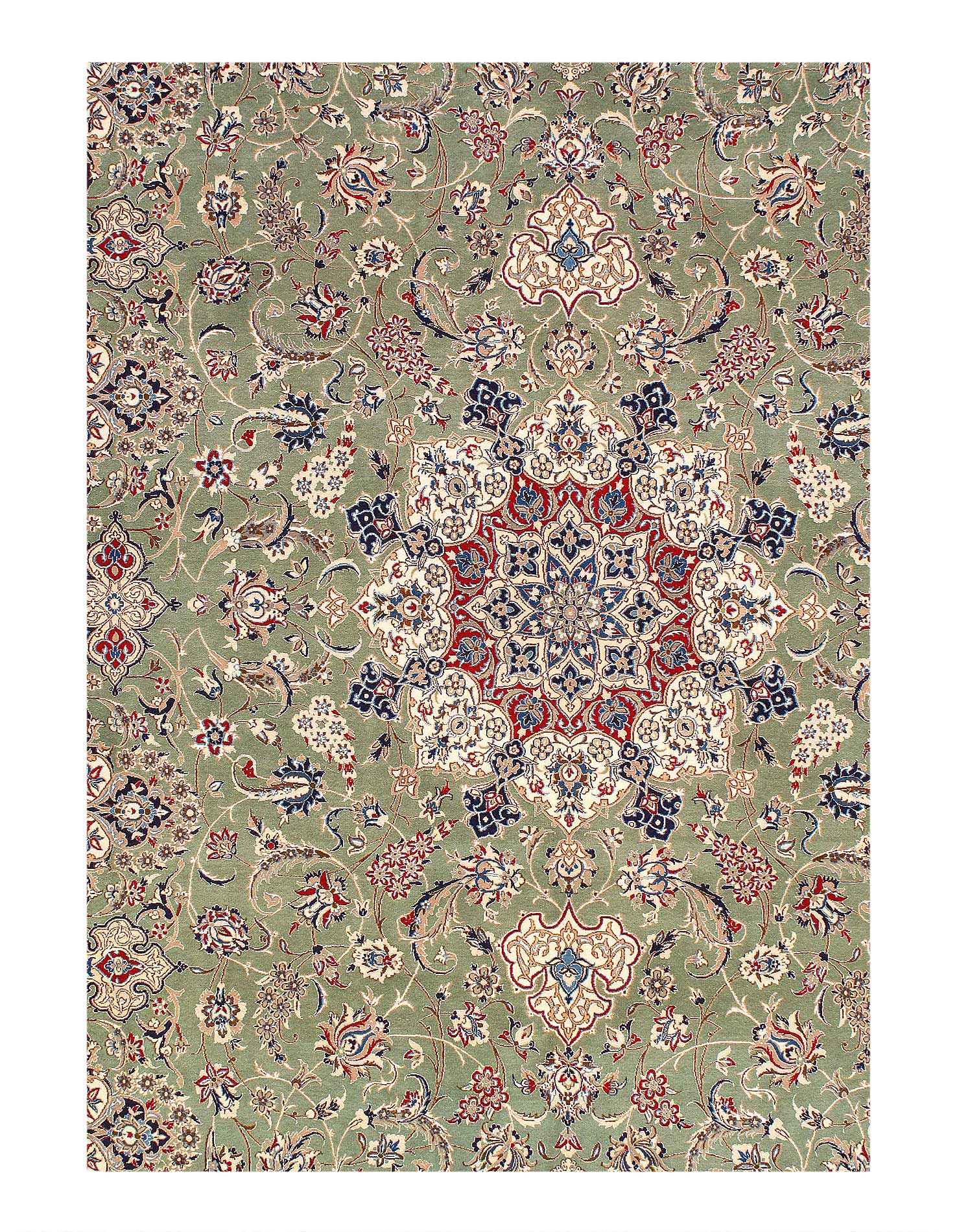 Persian Nain rugs are renowned for their detail and fine use of outlining along the central motifs. Breaking from the classical style of many vintage rugs produced around central Iran, Persian Nain rugs became renowned for their modern appeal and personal style, establishing the classical motifs of many other regional rugs, only through a more precise lens. In this striking piece, the precision is particularly visible along the heart of the vintage Persian rug, where the attention to detail allows each individual color to stand out as a unique part of the whole. The surrounding borders help ground the masterpiece and add horizontal intrigue to the natural elements within, which are arranged vertically to establish a cascading effect.