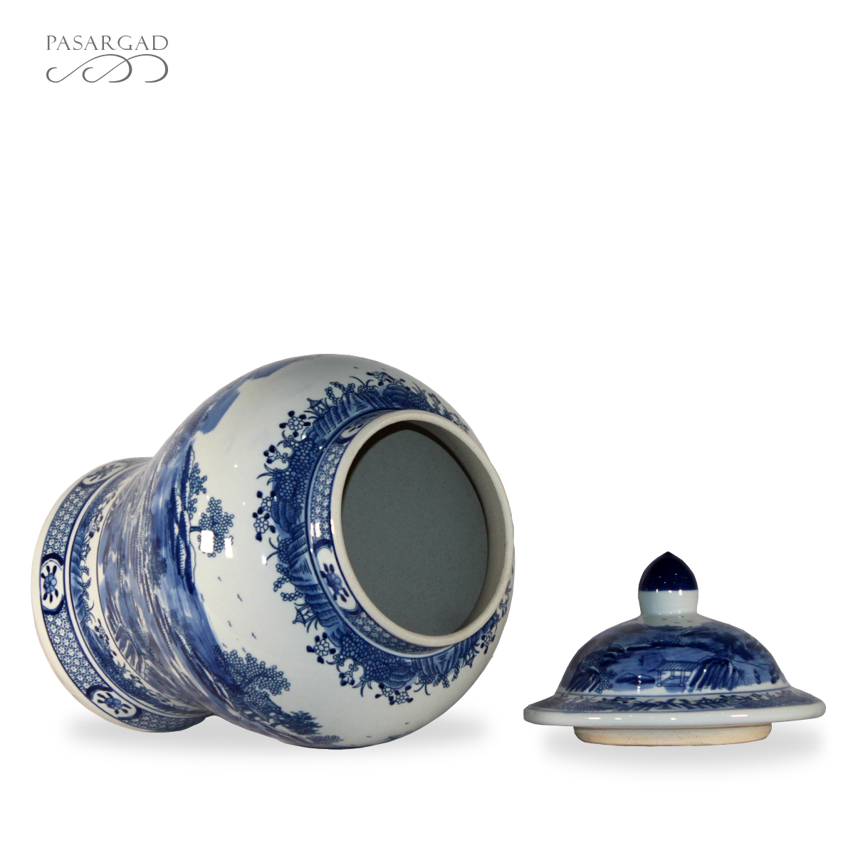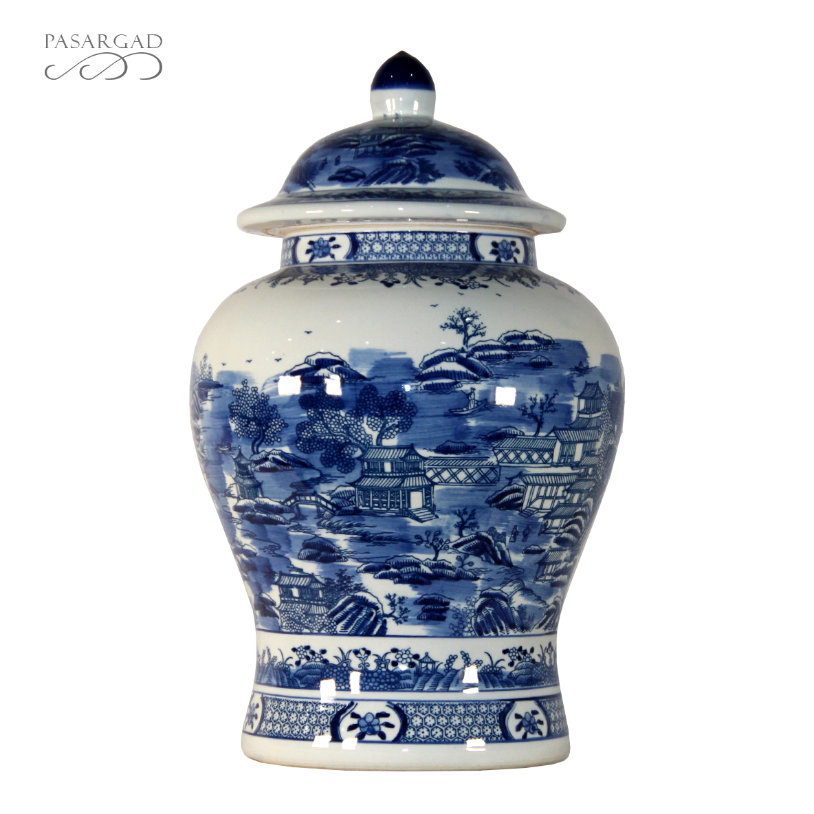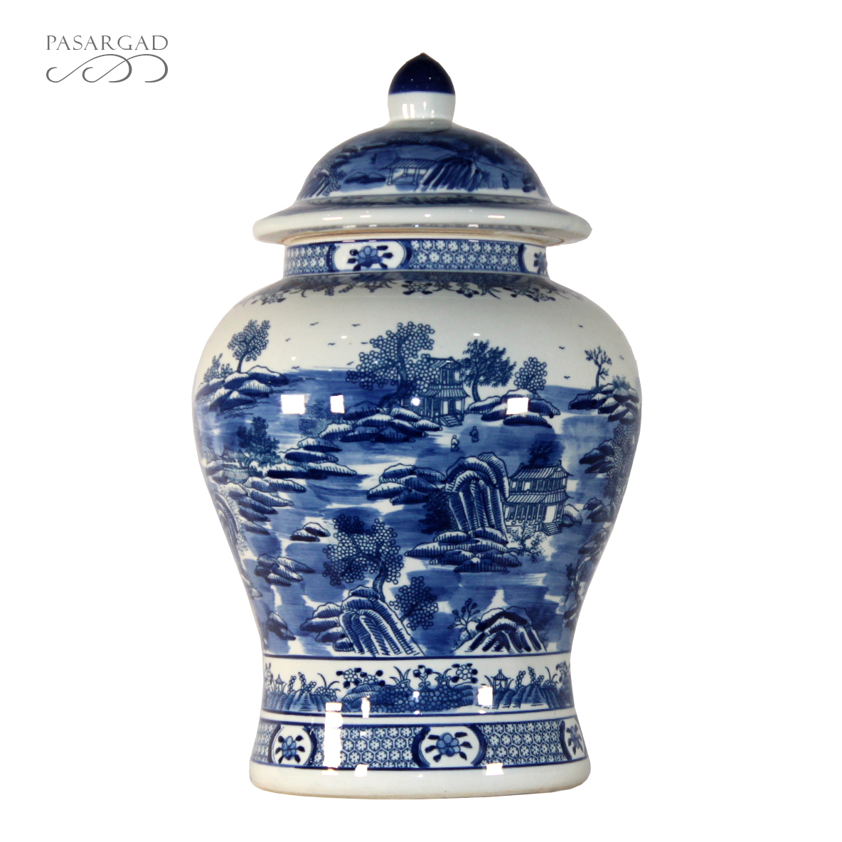 Classic Asian design temple jar, which are often displayed in pairs on buffets, credenzas, or sideboards. Decorated with a Chinese Blue and White landscape pattern with hand painted mountain and pagoda detail.