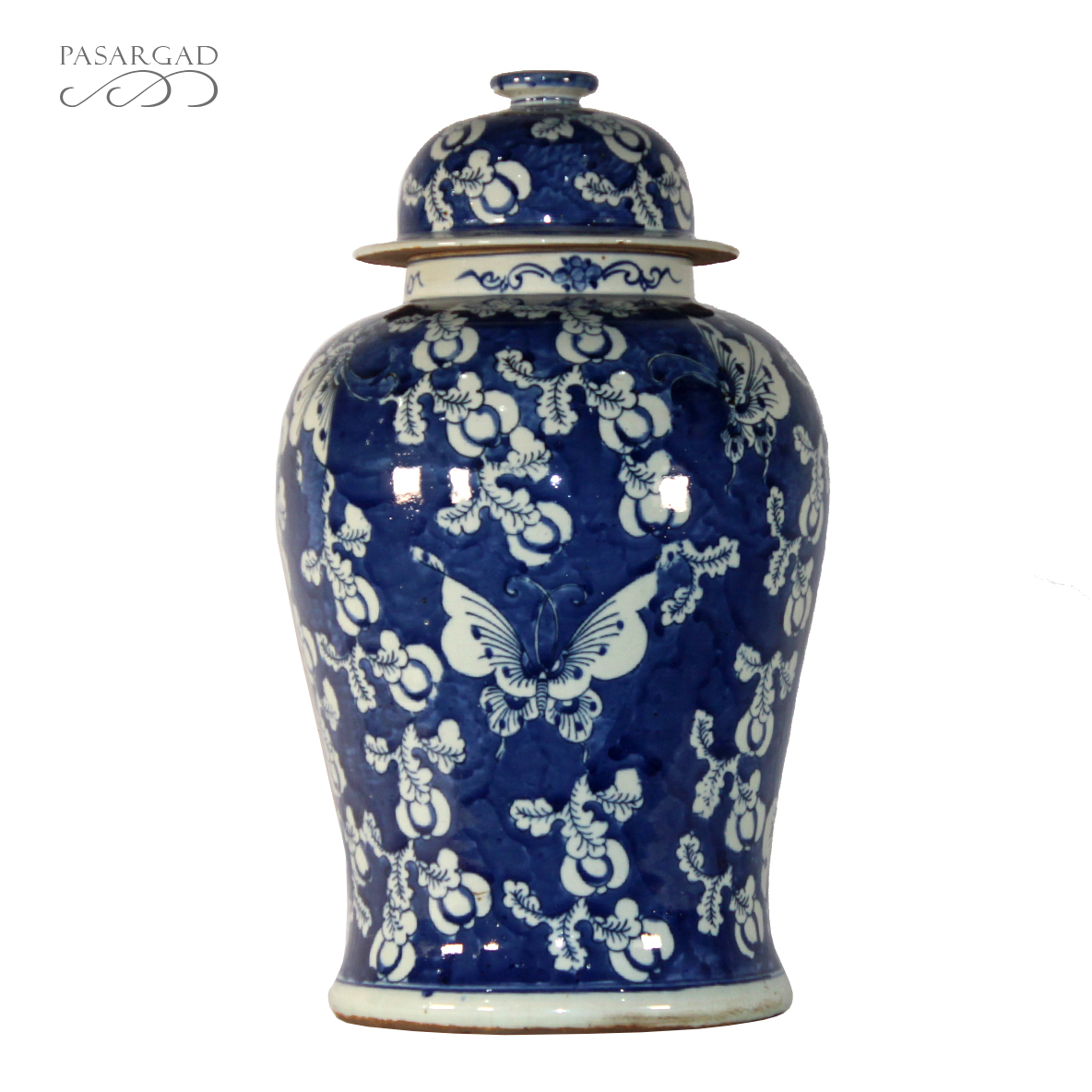 Classic Asian design temple jar, which are often displayed in pairs on buffets, credenzas, or sideboards. Decorated with a Chinese Blue and White landscape pattern with hand painted mountain and pagoda detail.