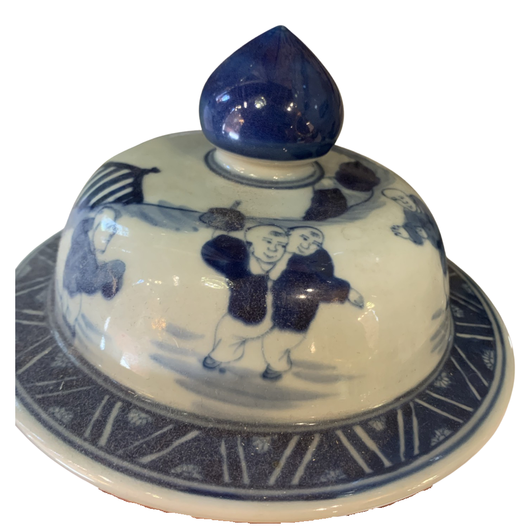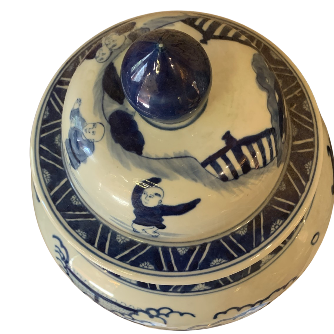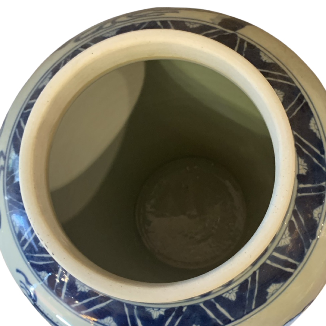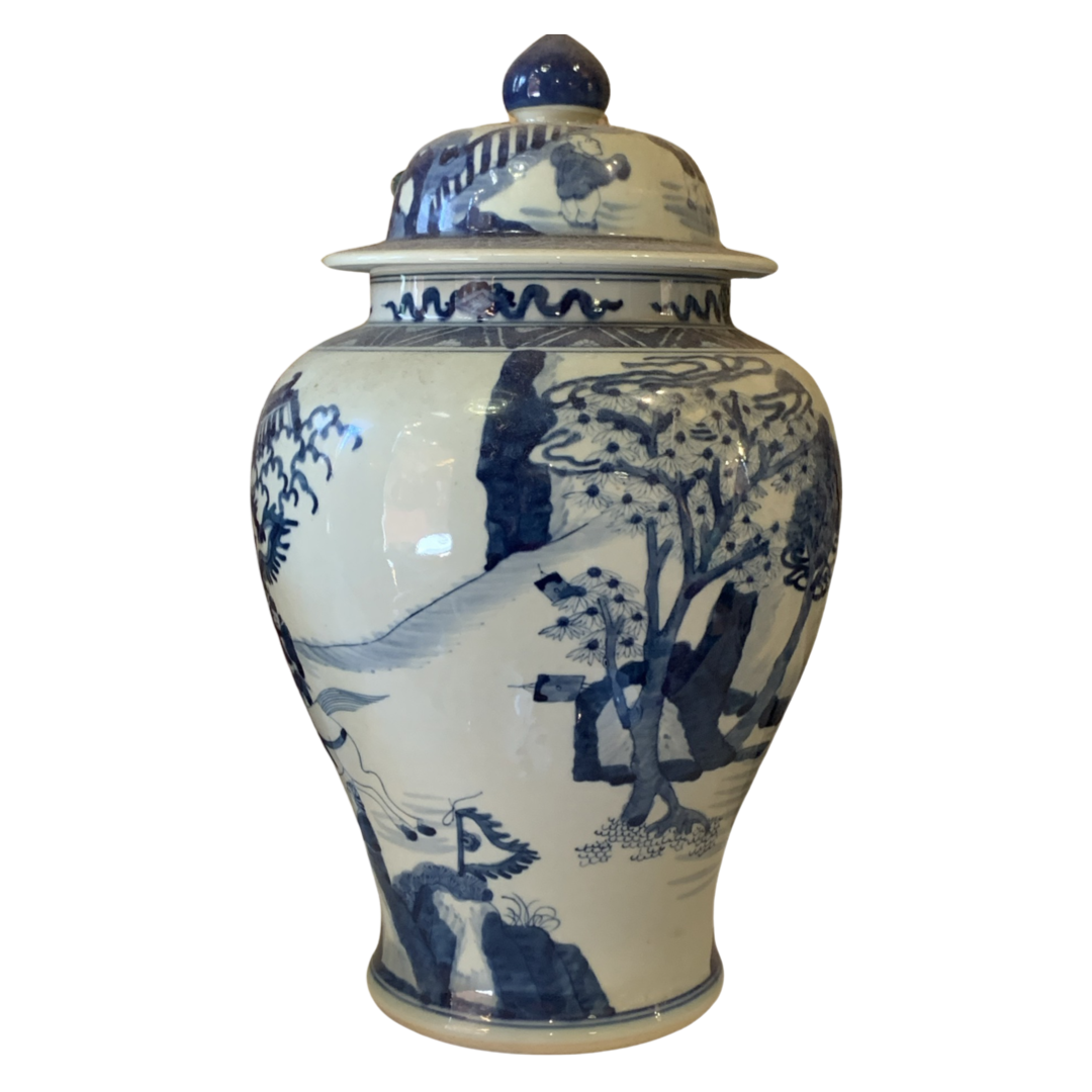 Classic Asian design temple jar, which are often displayed in pairs on buffets, credenzas, or sideboards. Decorated with a Chinese Blue and White landscape pattern with hand painted mountain and pagoda detail.