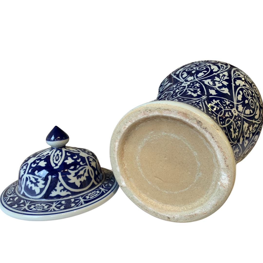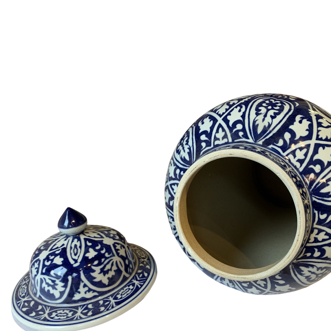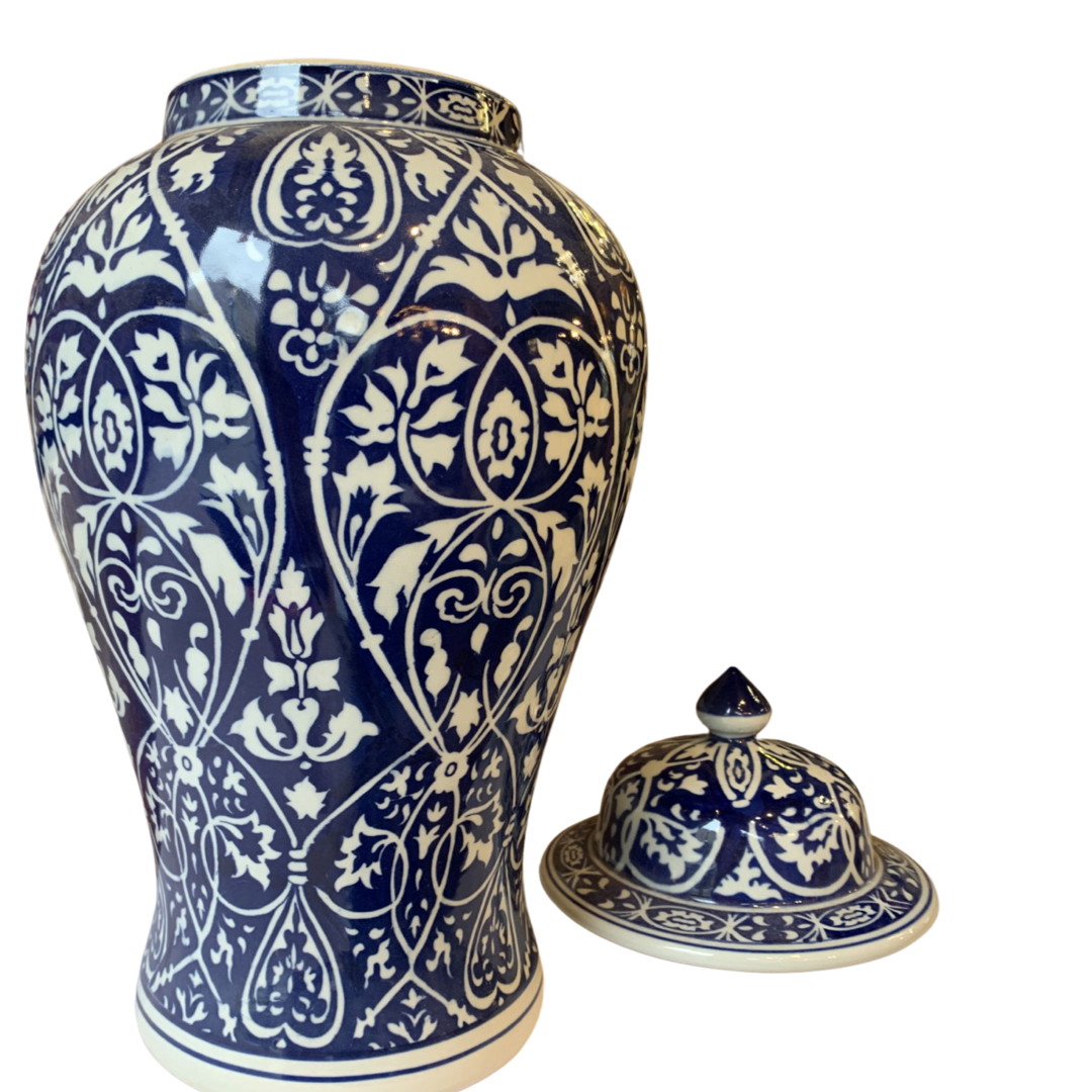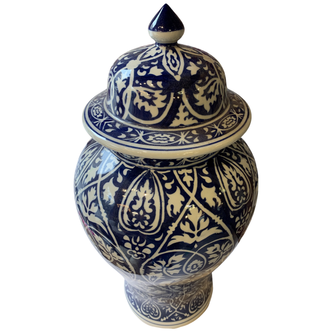 Classic Asian design temple jar, which are often displayed in pairs on buffets, credenzas, or sideboards. Decorated with a Chinese Blue and White landscape pattern with hand painted mountain and pagoda detail.