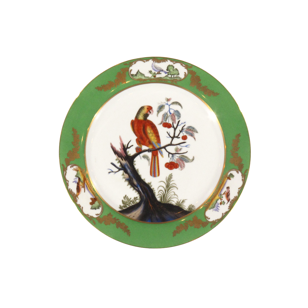 This lovely of Decorative Bird Plates, feature a vibrant Light Green Border, delicate Gold Trim, and Gold Floral Swags.