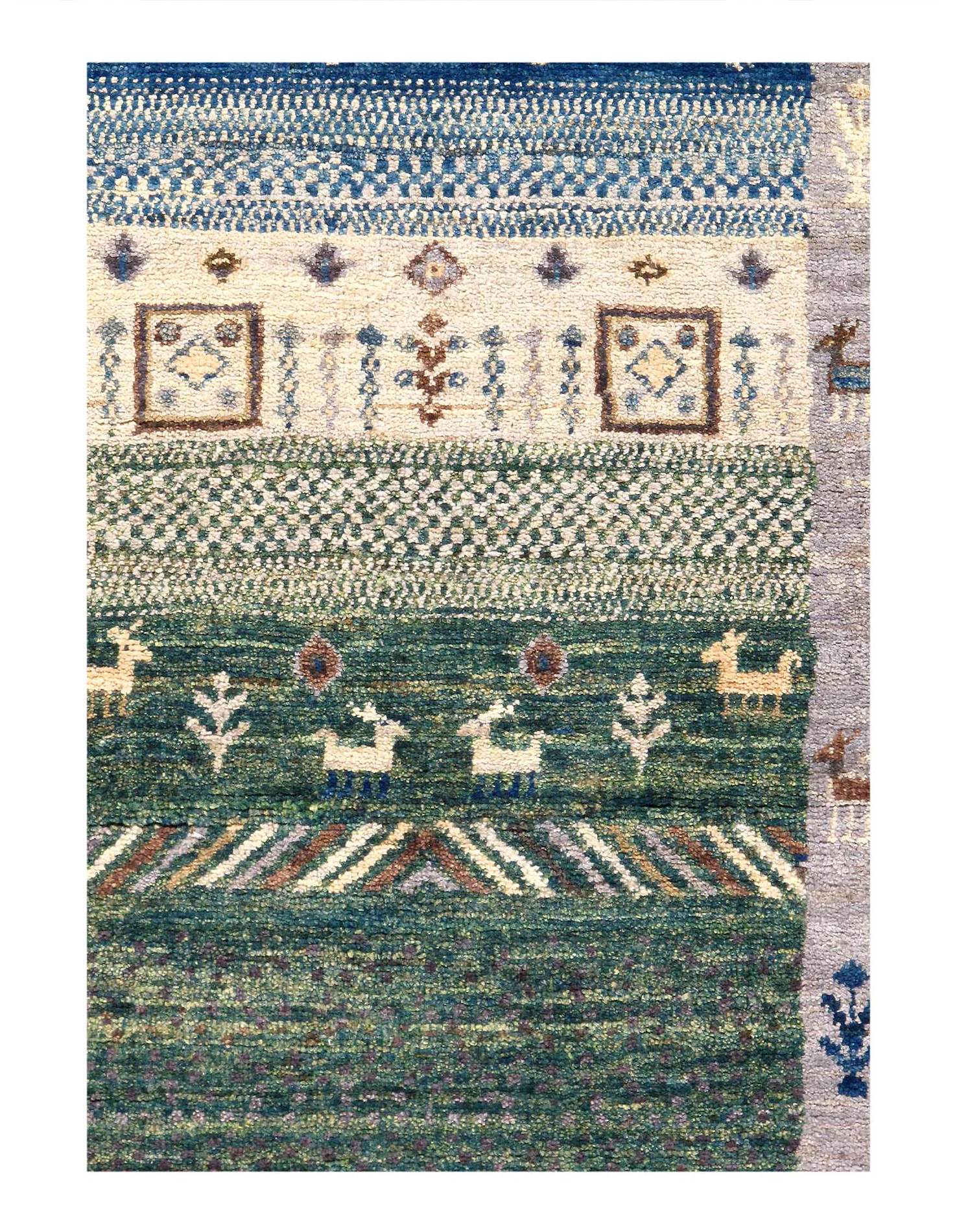 A Gabbeh is a handmade Persian rug which were traditionally woven by Qashqai and Luri weavers in Iran. These rugs are and were simple, whimsical or modern in design, often using geometric and stylized human, animal and plant forms.