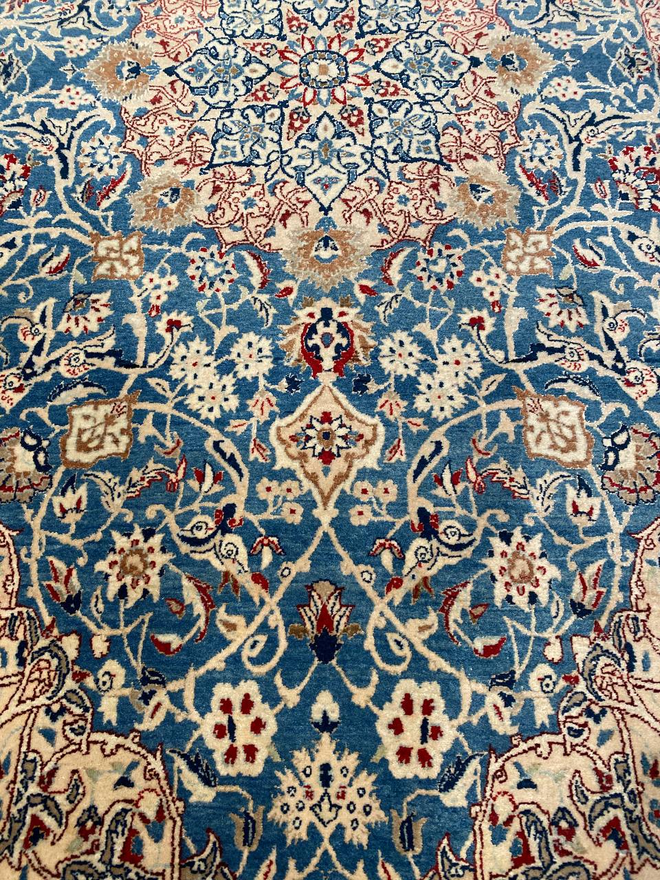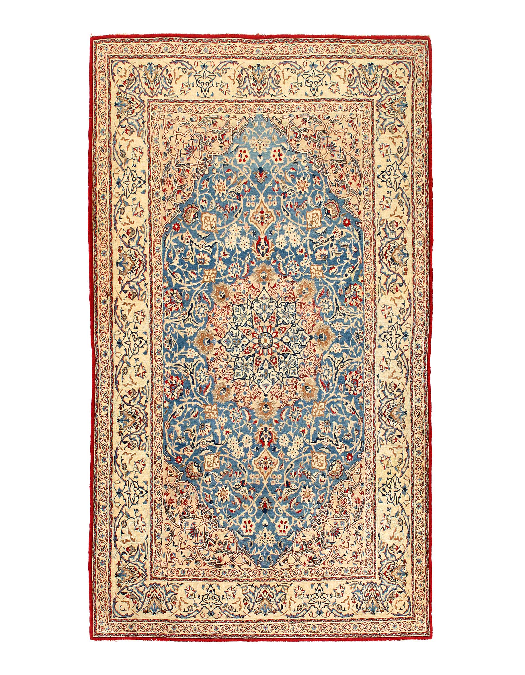 Persian Nain rugs are renowned for their detail and fine use of outlining along the central motifs. Breaking from the classical style of many vintage rugs produced around central Iran, Persian Nain rugs became renowned for their modern appeal and personal style, establishing the classical motifs of many other regional rugs, only through a more precise lens. In this striking piece, the precision is particularly visible along the heart of the vintage Persian rug, where the attention to detail allows each individual color to stand out as a unique part of the whole. The surrounding borders help ground the masterpiece and add horizontal intrigue to the natural elements within, which are arranged vertically to establish a cascading effect.