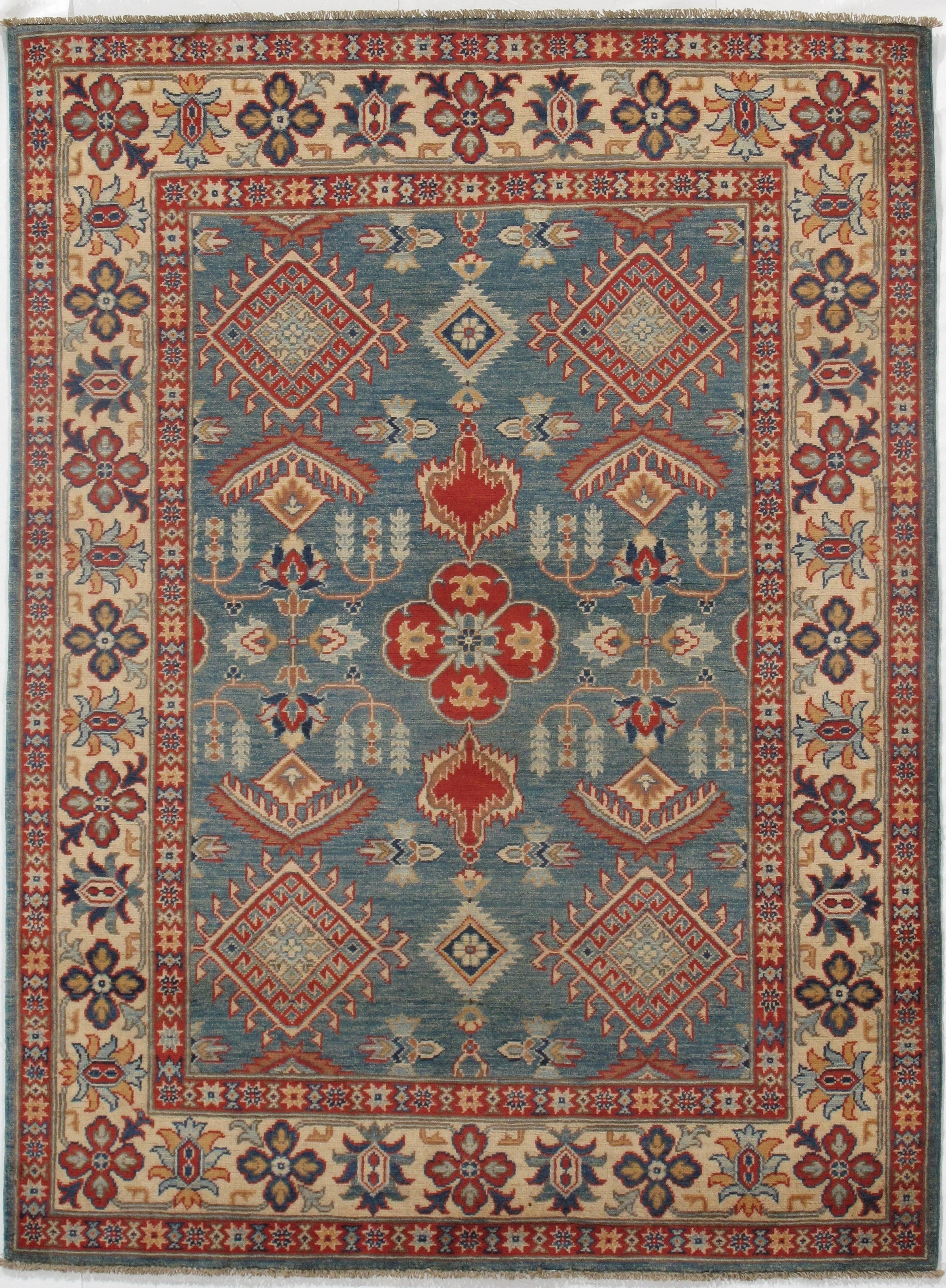 Kazak is a modern shape of old Caucasian rugs which strictly adheres to traditional design elements of the Caucasus. It has elements such as the stepped hooked polygons, geometrical medallions and rosettes, presented in more stylized manner and with a new dimension. Natural dyes produce soft luminous shades and abrashes causing a beautiful sheen. Handspun wool yarn is normally used in the variety of vibrant warm colors. Kazaks rugs in our collection are all fine quality pieces from Pakistan made with Ghazni handspun wool and natural dyes.
