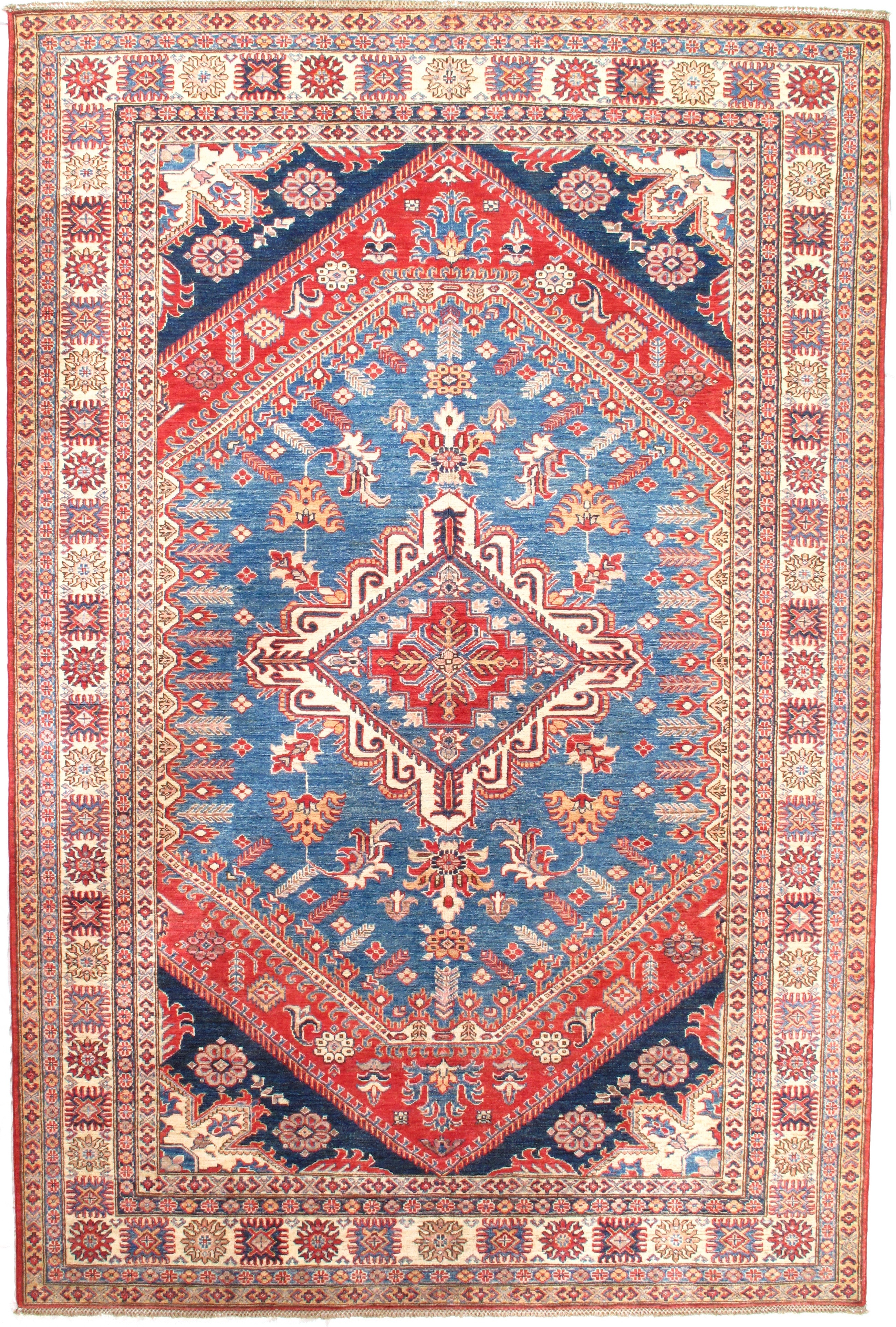 Kazak is a modern shape of old Caucasian rugs which strictly adheres to traditional design elements of the Caucasus. It has elements such as the stepped hooked polygons, geometrical medallions and rosettes, presented in more stylized manner and with a new dimension. Natural dyes produce soft luminous shades and abrashes causing a beautiful sheen. Handspun wool yarn is normally used in the variety of vibrant warm colors. Kazaks rugs in our collection are all fine quality pieces from Pakistan made with Ghazni handspun wool and natural dyes.