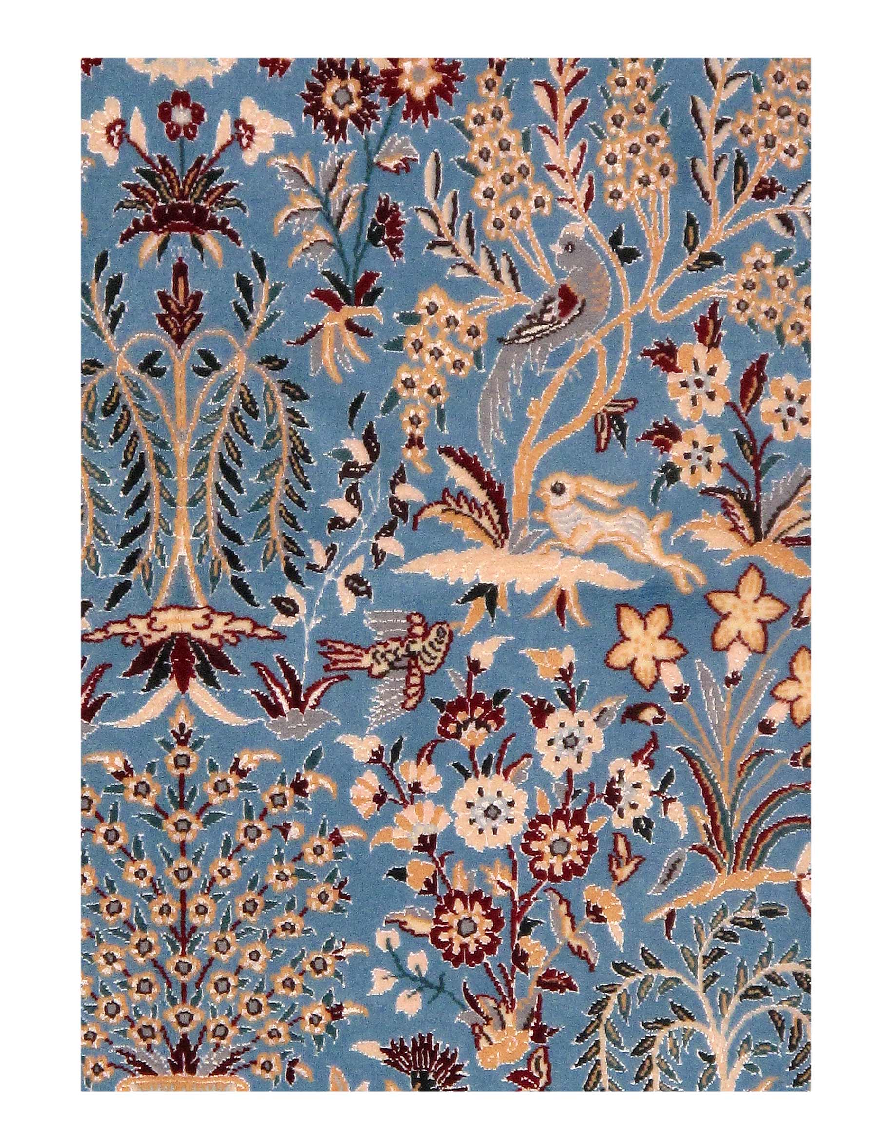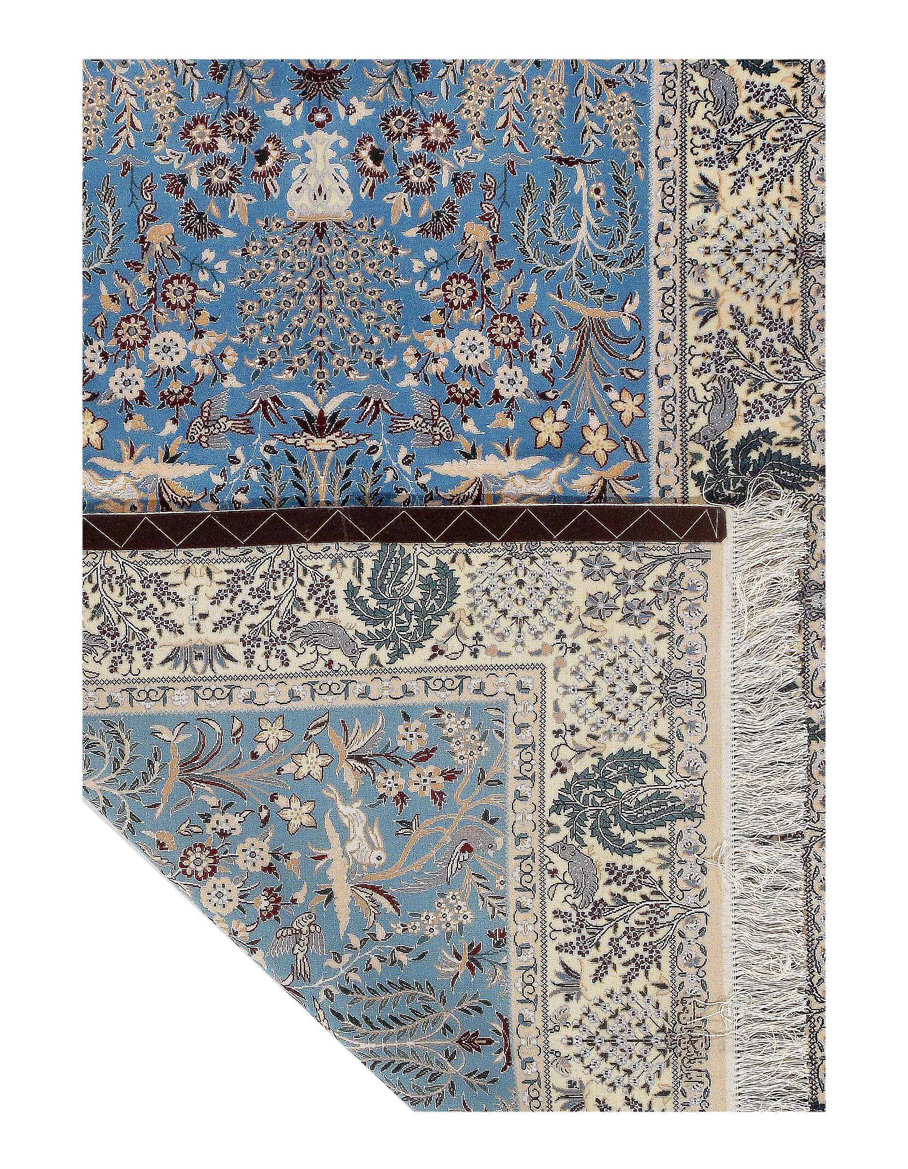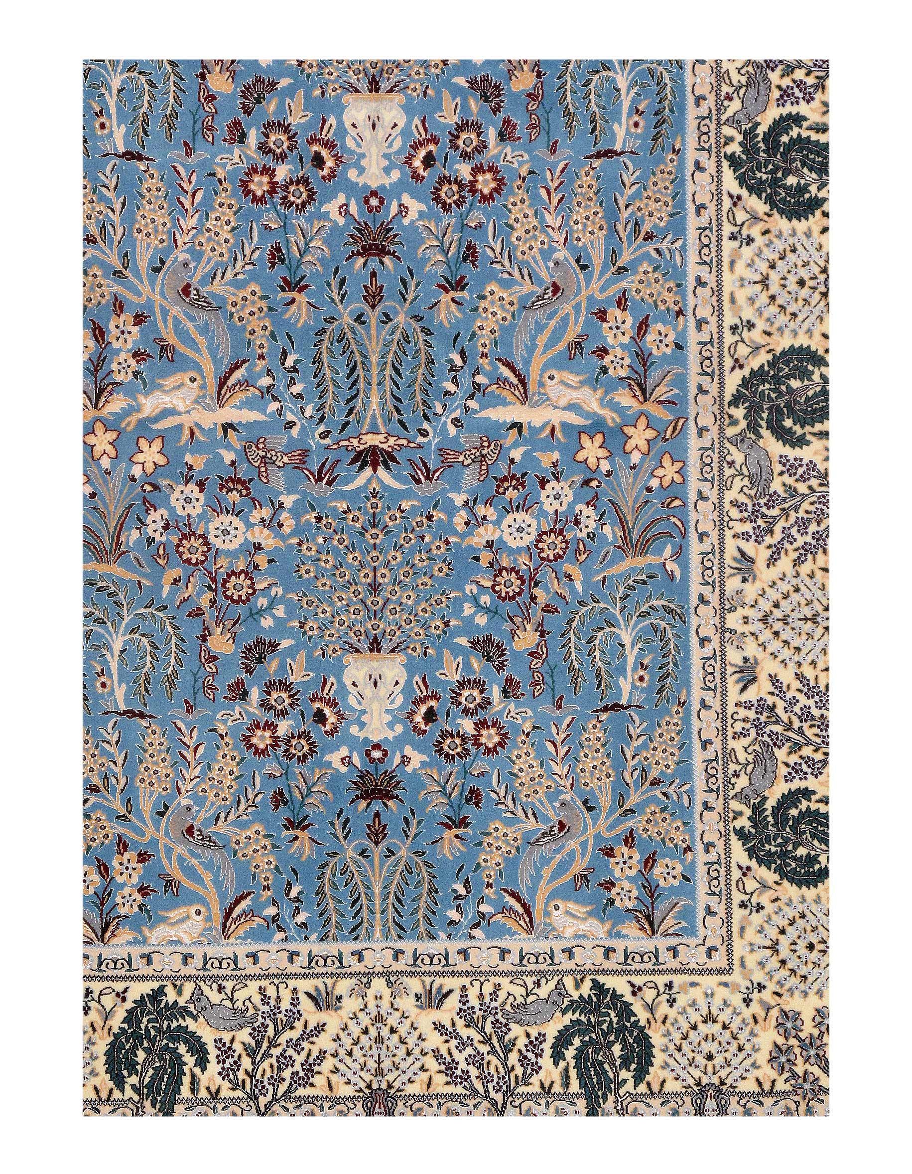 All Nain rugs are knotted by hand using asymmetrical Persian knots and wool pile on a cotton warp. The rugs are then clipped closely so that the design stands out more sharply in focus.