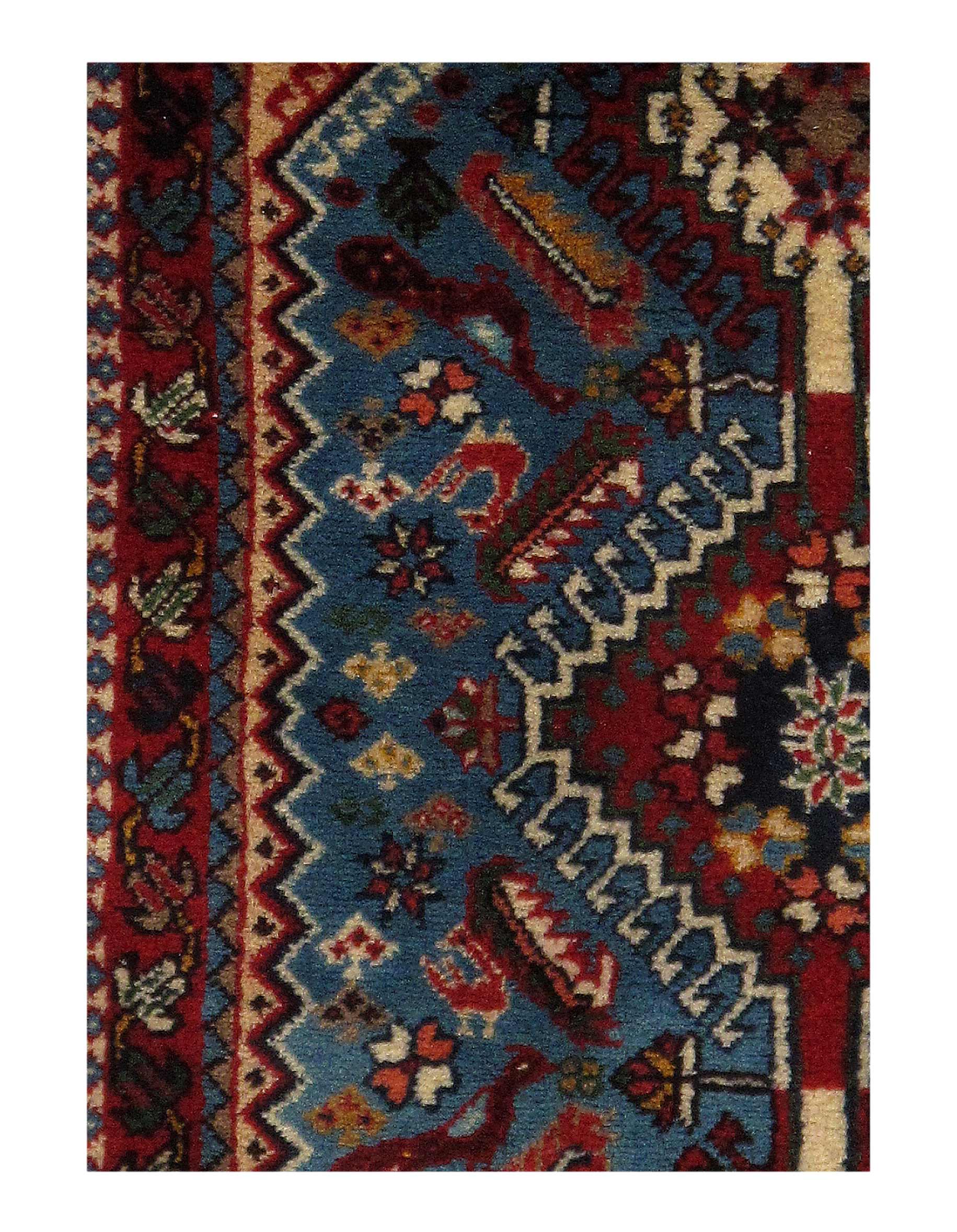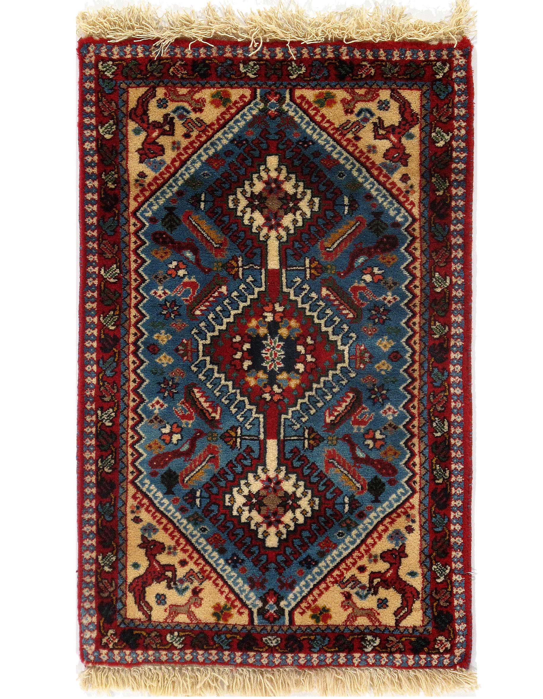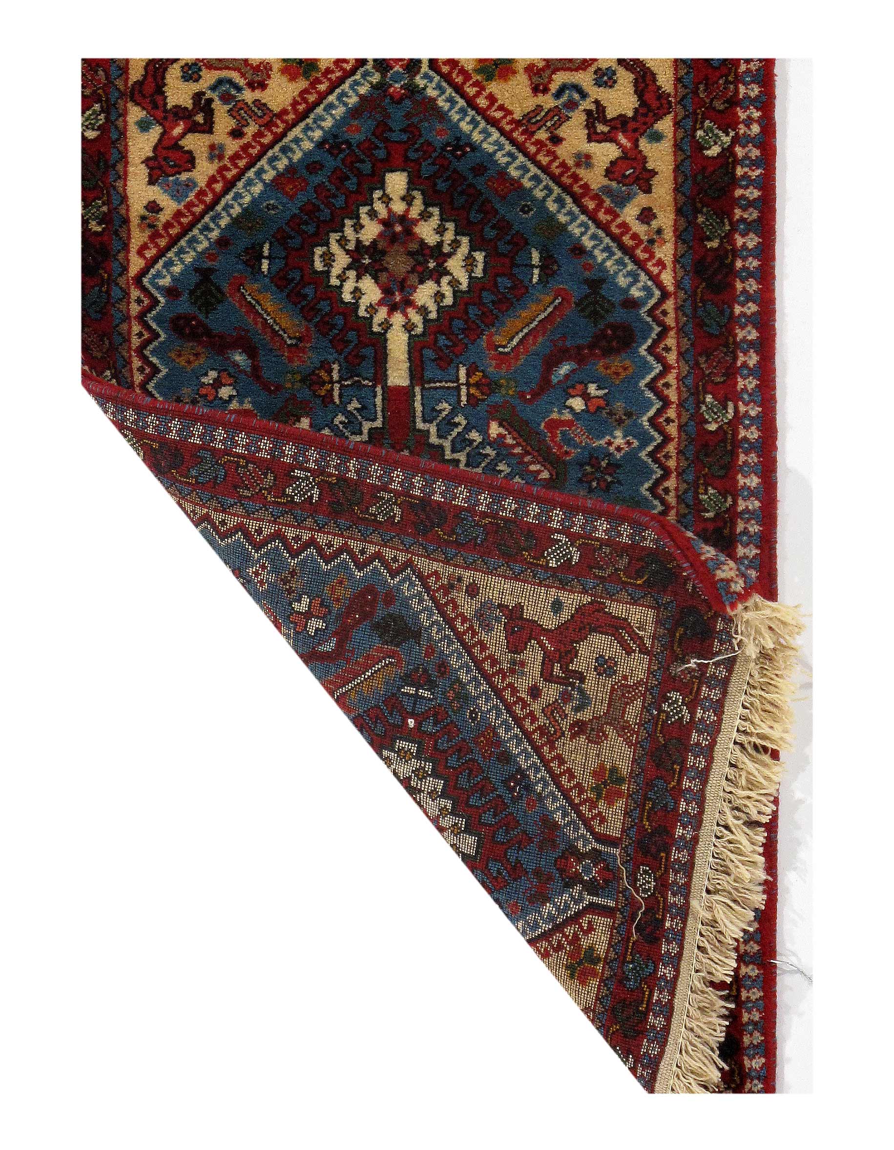 The pile used in Yalameh rugs is very fine, particularly in comparison to other tribal designs, using soft wool based on a Wool foundation. The pattern is distinctive with large repeated diamonds in a straight line down the carpet, often with geometrical animal or human prints scattered across the field. Dark red or light brown on a blue or orange background is most common for Yalameh, similar to Shiraz rugs, the rugs compliment modern or minimalist furniture beautifully, giving the living space an aura of luxurious style and warm.