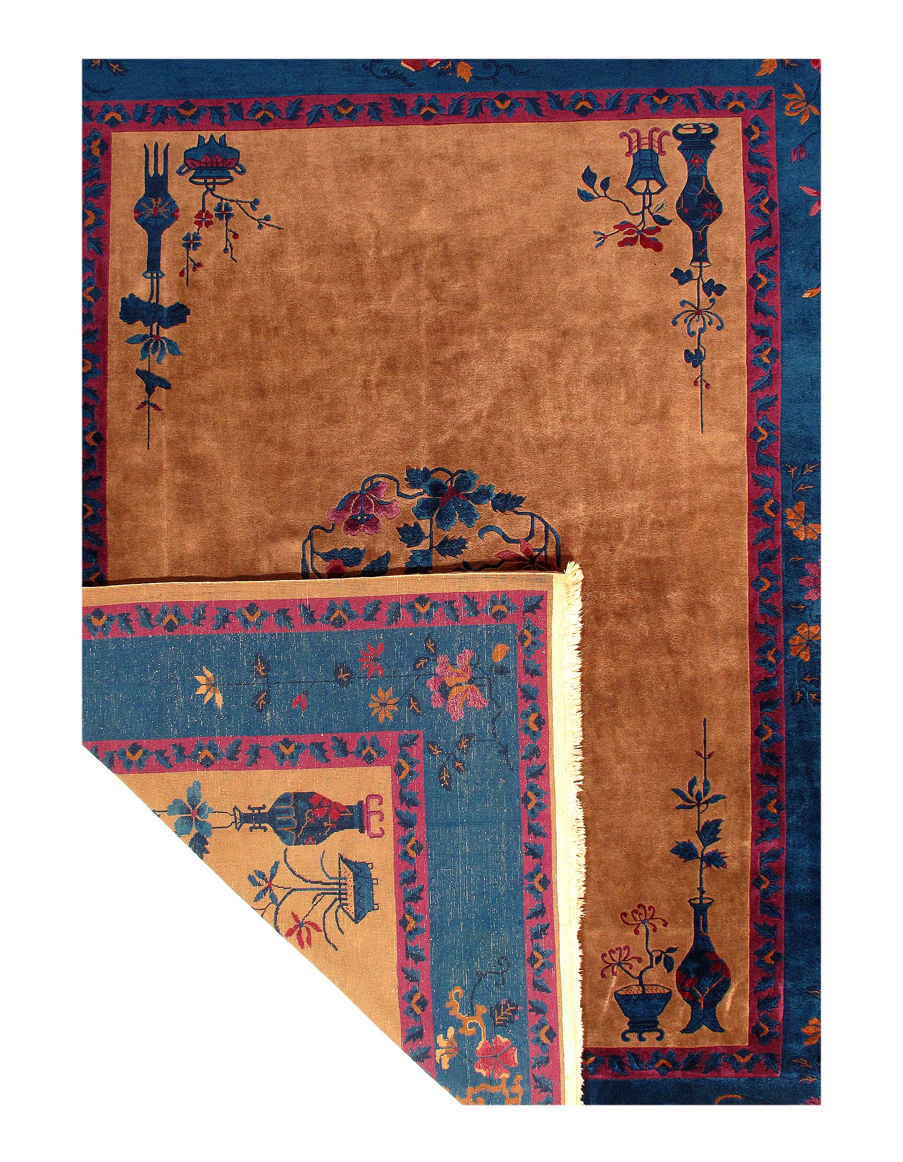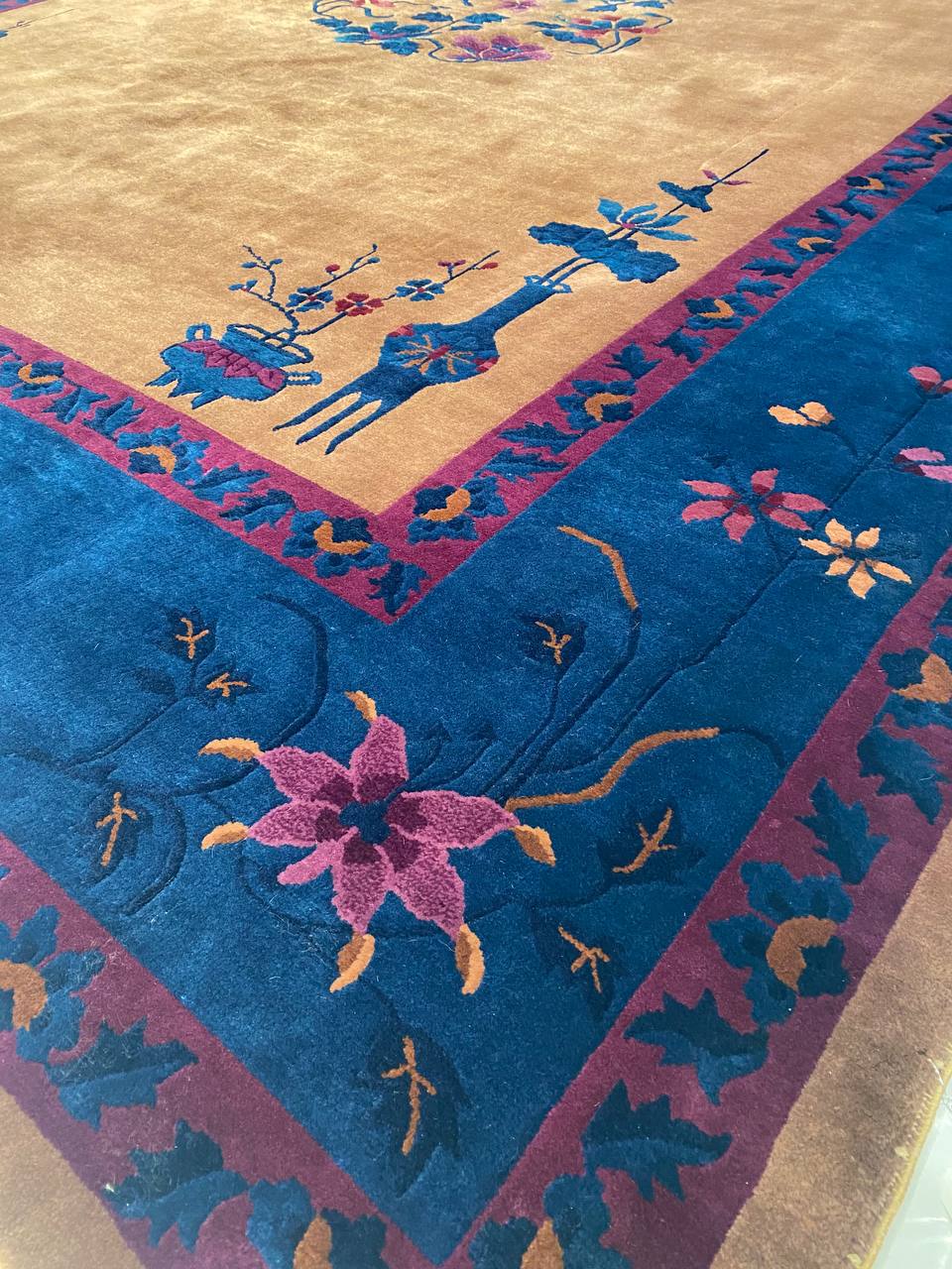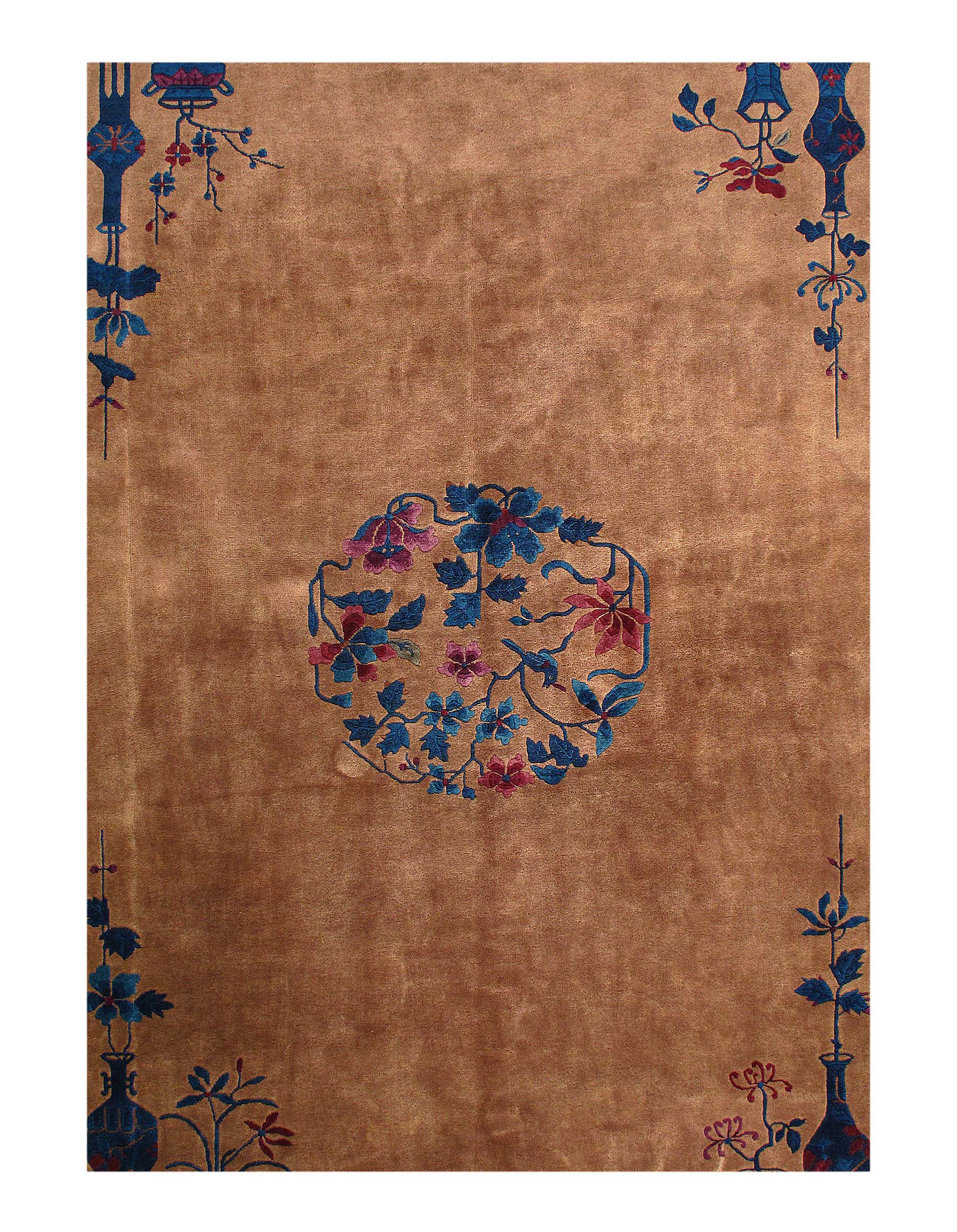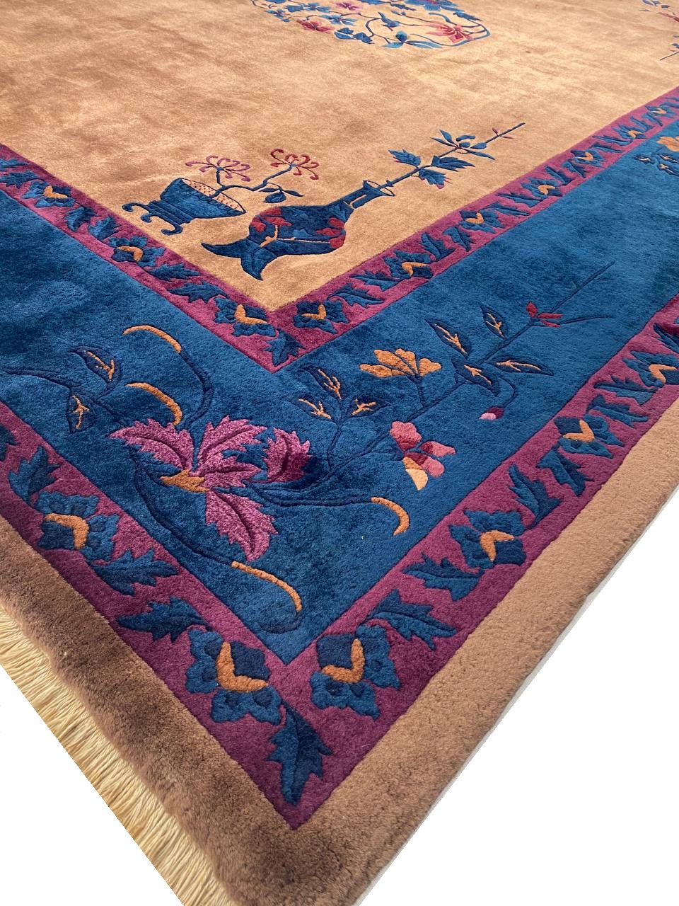 Chinese Deco Rug, Origin: China, Circa: Early 20th Century – Here is an exciting and appealing antique Oriental carpet – an antique Art Deco rug that was designed and woven in China during the early years of the twentieth century. Heavily informed by the aesthetic inclinations of the Art Deco period, this unique carpet is a compelling and thought-provoking example. A scalloped border of L Green encloses a Beige / Ivory sand field on this exquisitely subtle and restrained antique Chinese Art Deco. At first the field appears empty or open, but it is actually covered by a tone-on-tone design of scrolls and cloud-bands emanating inward from the outer edges. In their sinuous rhythms they echo the scalloped forms of the border and continue its visual effects across the carpet in a more subdued manner. This carpet testifies to the masterful design sensibilities of Chinese weavers as they made the transition into the modern world. The Art Deco movement had an outside influence on the world of art and design, and some of the most important qualities and characteristics of that movement may be found in this fine rug.