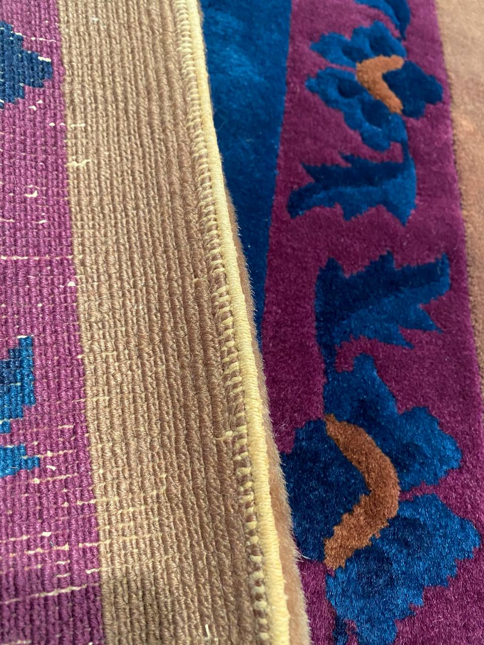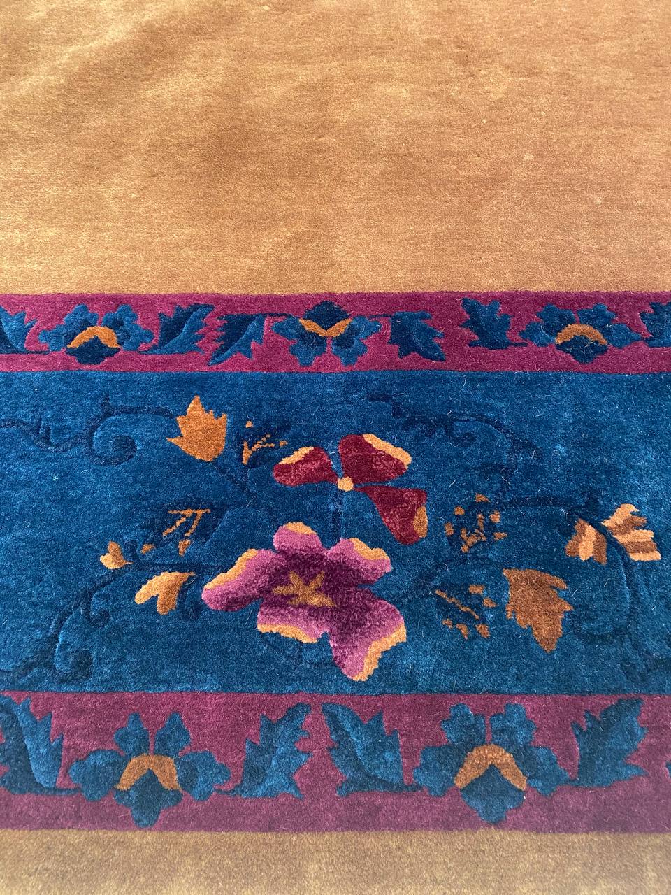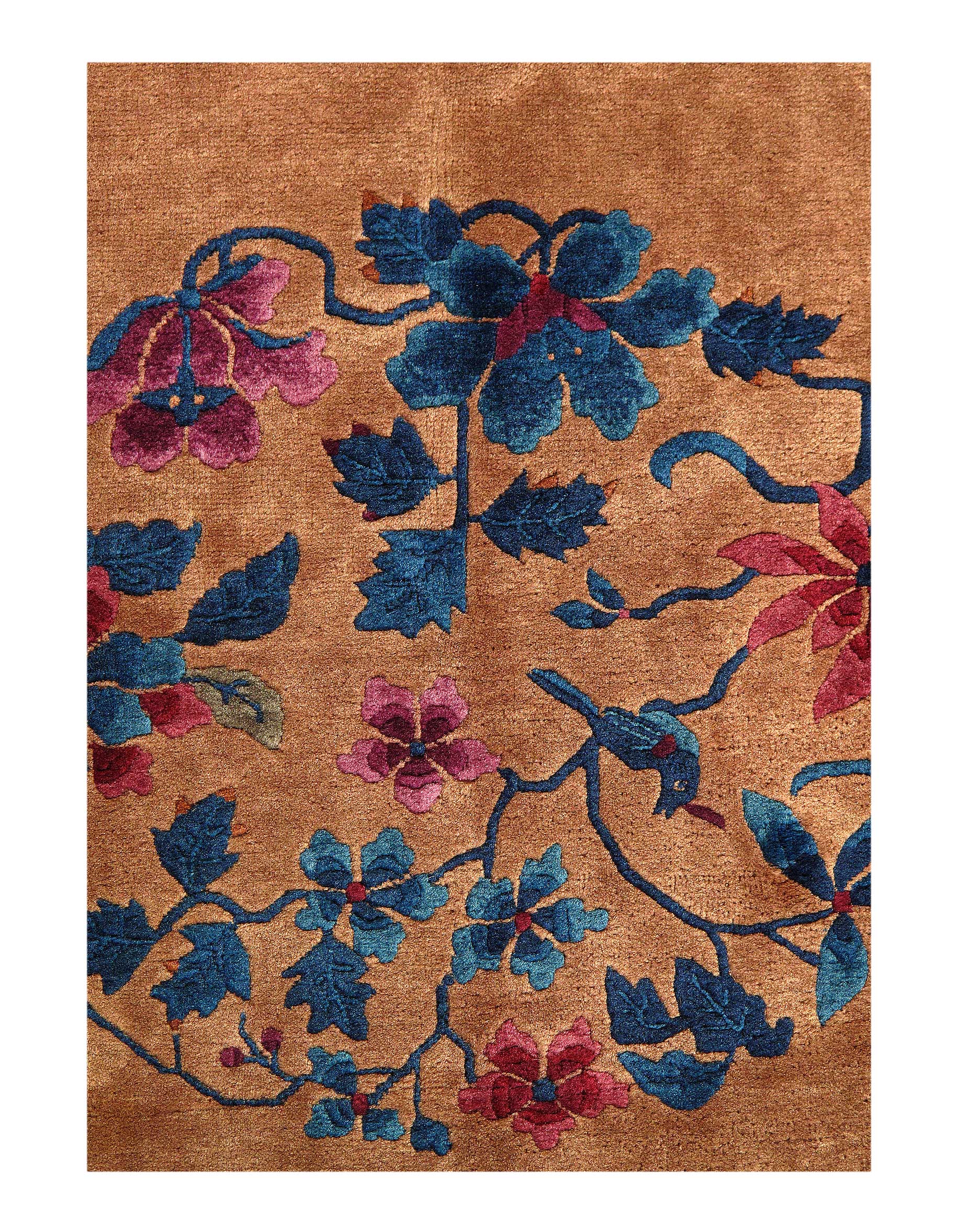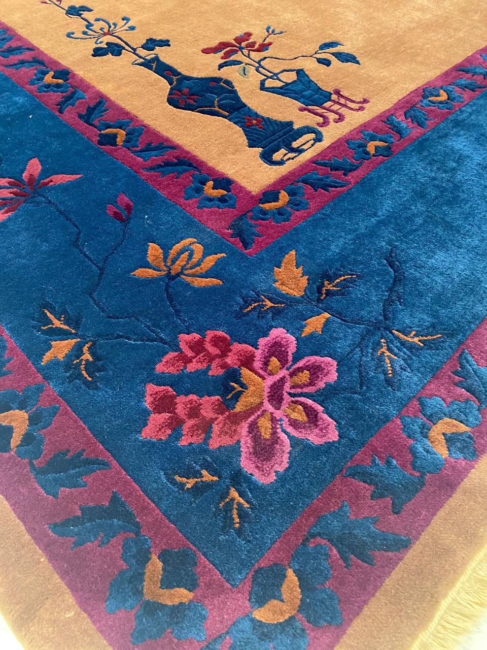 Chinese Deco Rug, Origin: China, Circa: Early 20th Century – Here is an exciting and appealing antique Oriental carpet – an antique Art Deco rug that was designed and woven in China during the early years of the twentieth century. Heavily informed by the aesthetic inclinations of the Art Deco period, this unique carpet is a compelling and thought-provoking example. A scalloped border of L Green encloses a Beige / Ivory sand field on this exquisitely subtle and restrained antique Chinese Art Deco. At first the field appears empty or open, but it is actually covered by a tone-on-tone design of scrolls and cloud-bands emanating inward from the outer edges. In their sinuous rhythms they echo the scalloped forms of the border and continue its visual effects across the carpet in a more subdued manner. This carpet testifies to the masterful design sensibilities of Chinese weavers as they made the transition into the modern world. The Art Deco movement had an outside influence on the world of art and design, and some of the most important qualities and characteristics of that movement may be found in this fine rug.