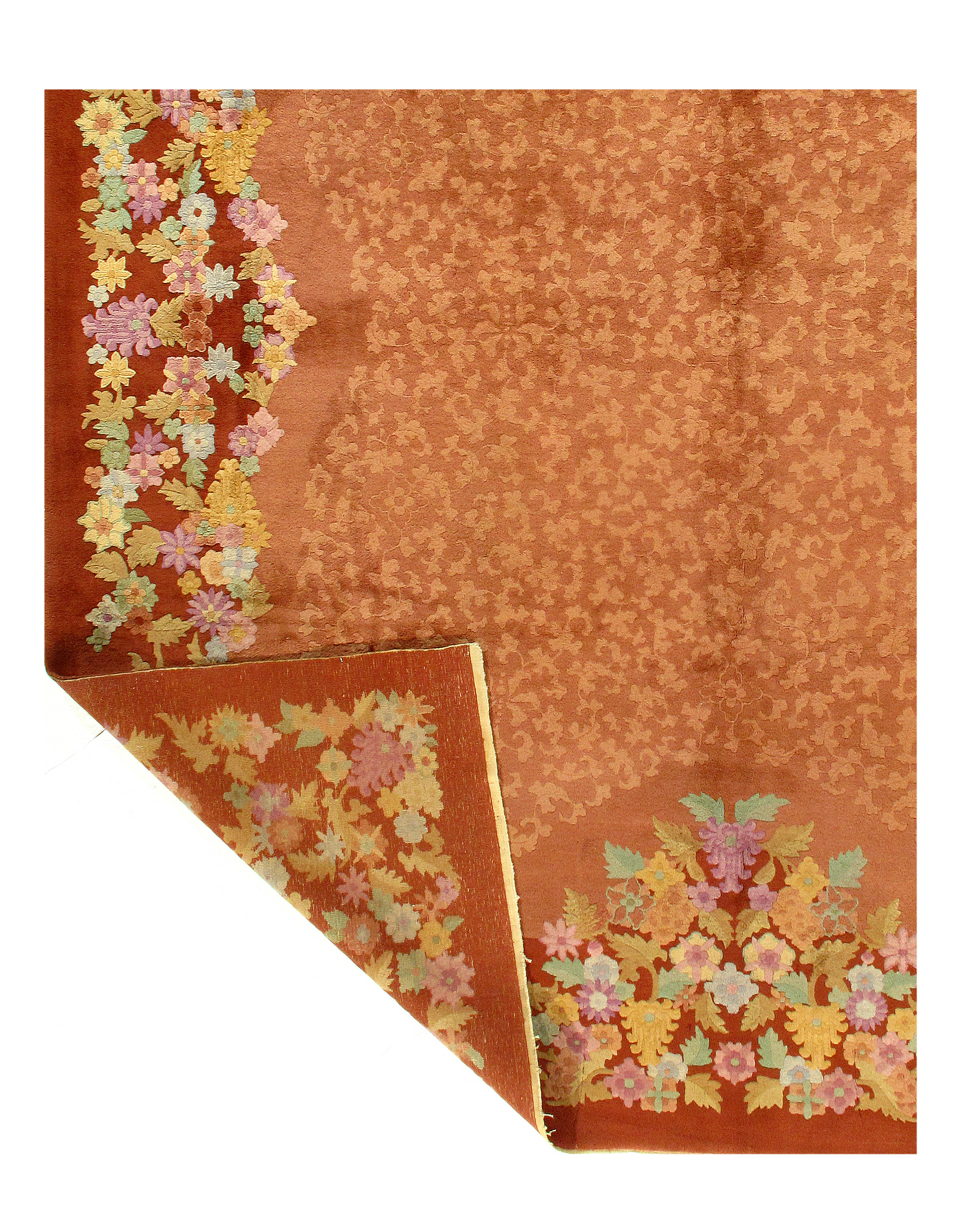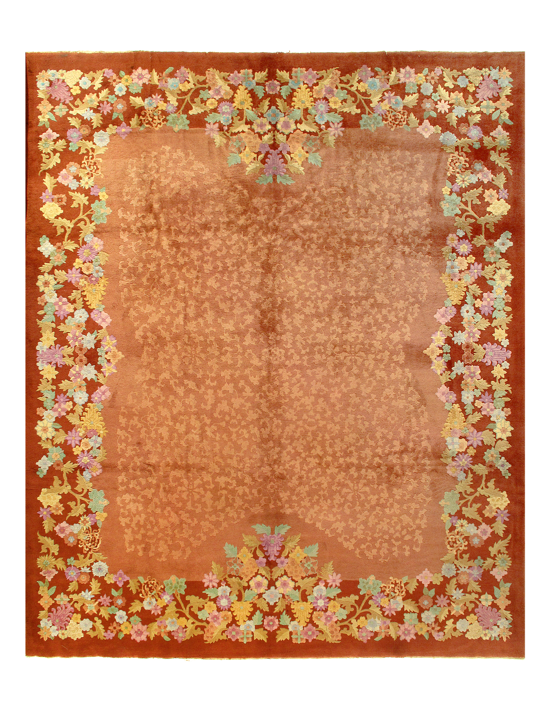 Vintage Chinese Deco Rug, Origin: China, Circa: Early 20th Century – Here is an exciting and appealing antique Oriental carpet – an antique Art Deco rug that was designed and woven in China during the early years of the twentieth century. Heavily informed by the aesthetic inclinations of the Art Deco period, this unique carpet is a compelling and thought-provoking example. A scalloped border of L . brown encloses a golden sand field on this exquisitely subtle and restrained antique Chinese Art Deco. At first the field appears empty or open, but it is actually covered by a tone-on-tone design of scrolls and cloud-bands emanating inward from the outer edges. In their sinuous rhythms they echo the scalloped forms of the border and continue its visual effects across the carpet in a more subdued manner. This carpet testifies to the masterful design sensibilities of Chinese weavers as they made the transition into the modern world. The Art Deco movement had an outside influence on the world of art and design, and some of the most important qualities and characteristics of that movement may be found in this fine rug.