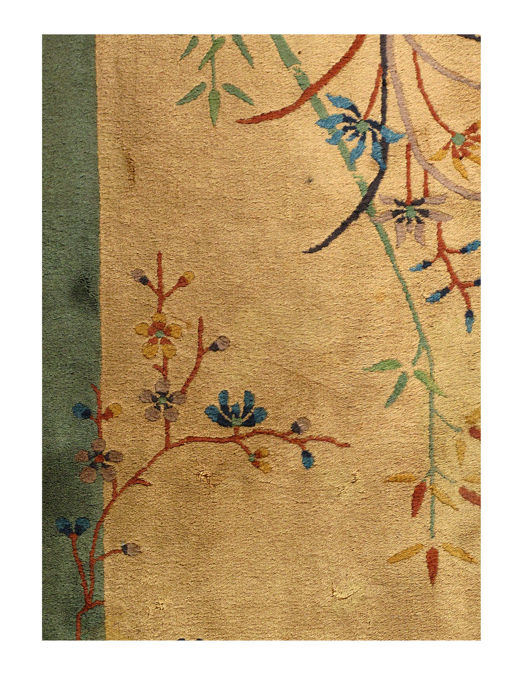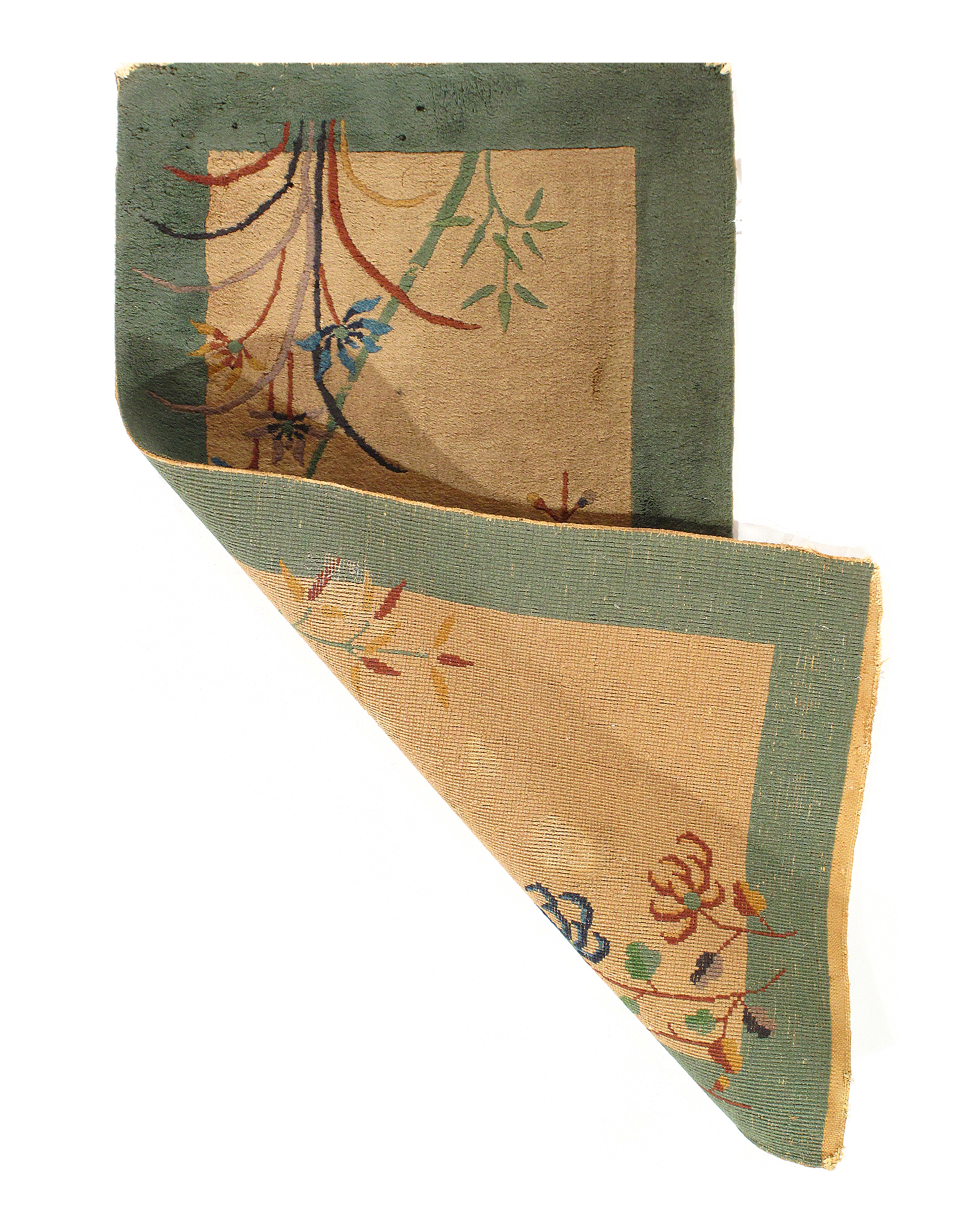 Chinese Deco Rug, Origin: China, Circa: Early 20th Century – Here is an exciting and appealing antique Oriental carpet – an antique Art Deco rug that was designed and woven in China during the early years of the twentieth century. Heavily informed by the aesthetic inclinations of the Art Deco period, this unique carpet is a compelling and thought-provoking example. A scalloped border of L Green encloses a Beige / Ivory sand field on this exquisitely subtle and restrained antique Chinese Art Deco. At first the field appears empty or open, but it is actually covered by a tone-on-tone design of scrolls and cloud-bands emanating inward from the outer edges. In their sinuous rhythms they echo the scalloped forms of the border and continue its visual effects across the carpet in a more subdued manner. This carpet testifies to the masterful design sensibilities of Chinese weavers as they made the transition into the modern world. The Art Deco movement had an outside influence on the world of art and design, and some of the most important qualities and characteristics of that movement may be found in this fine rug.