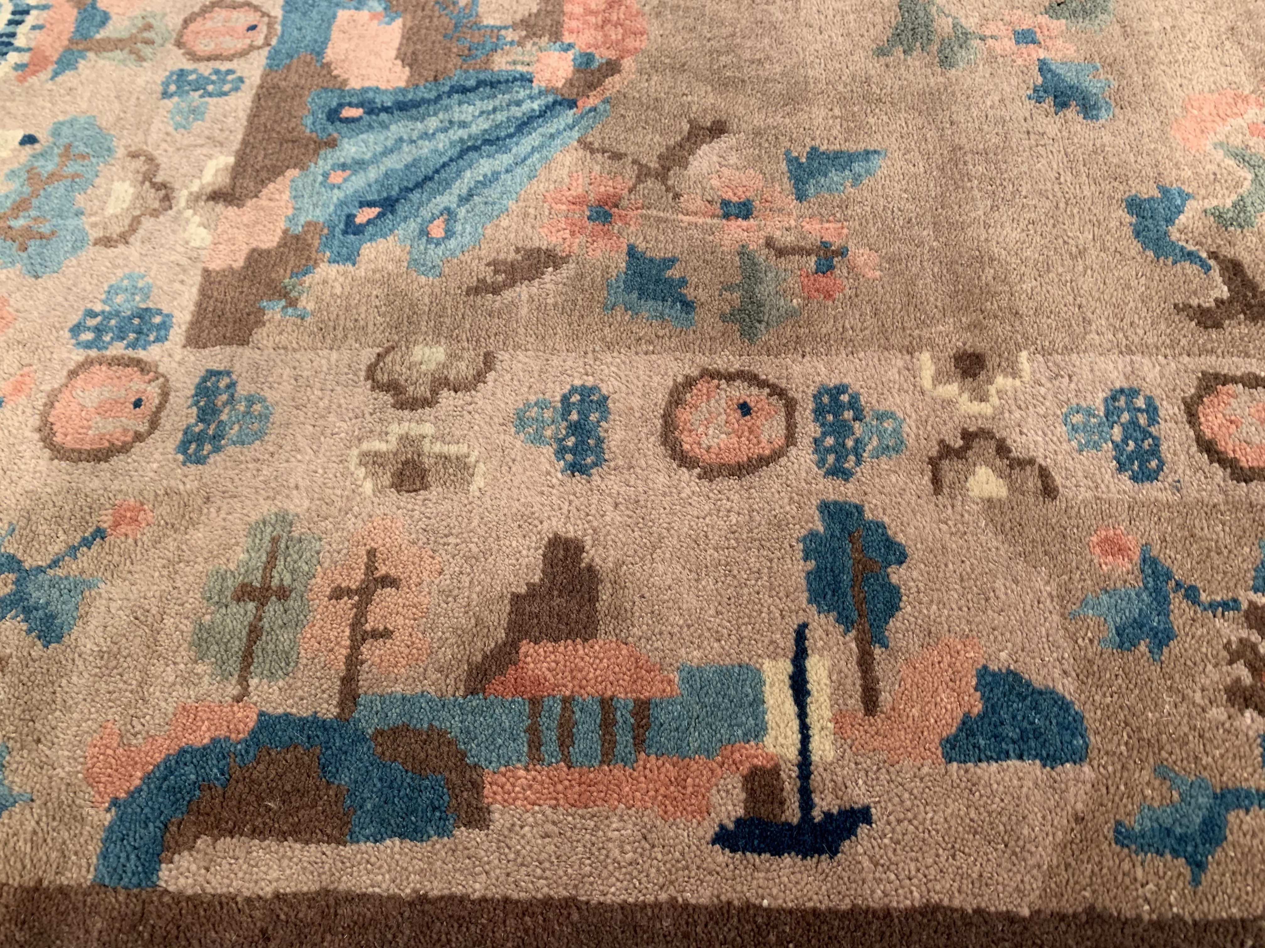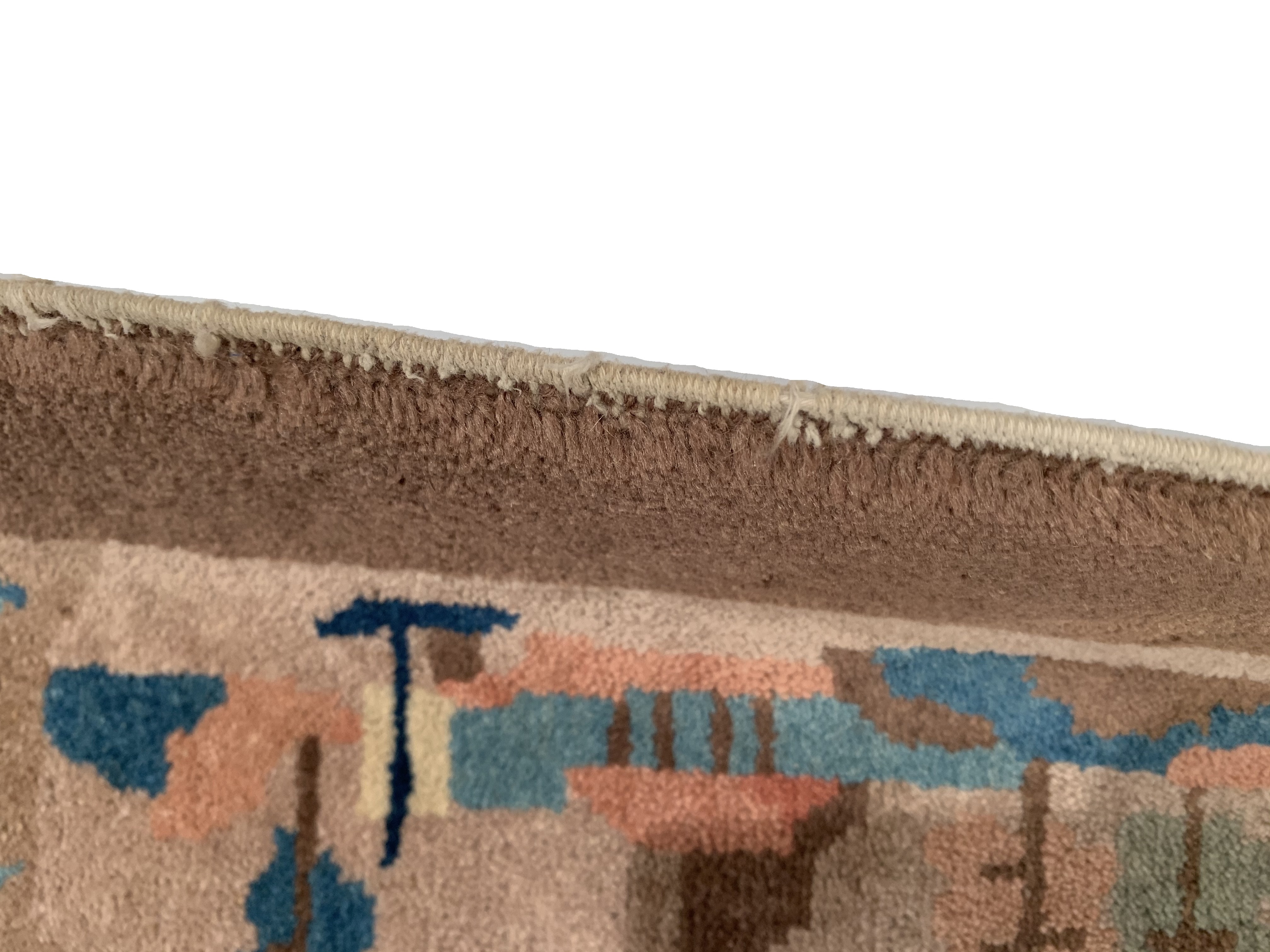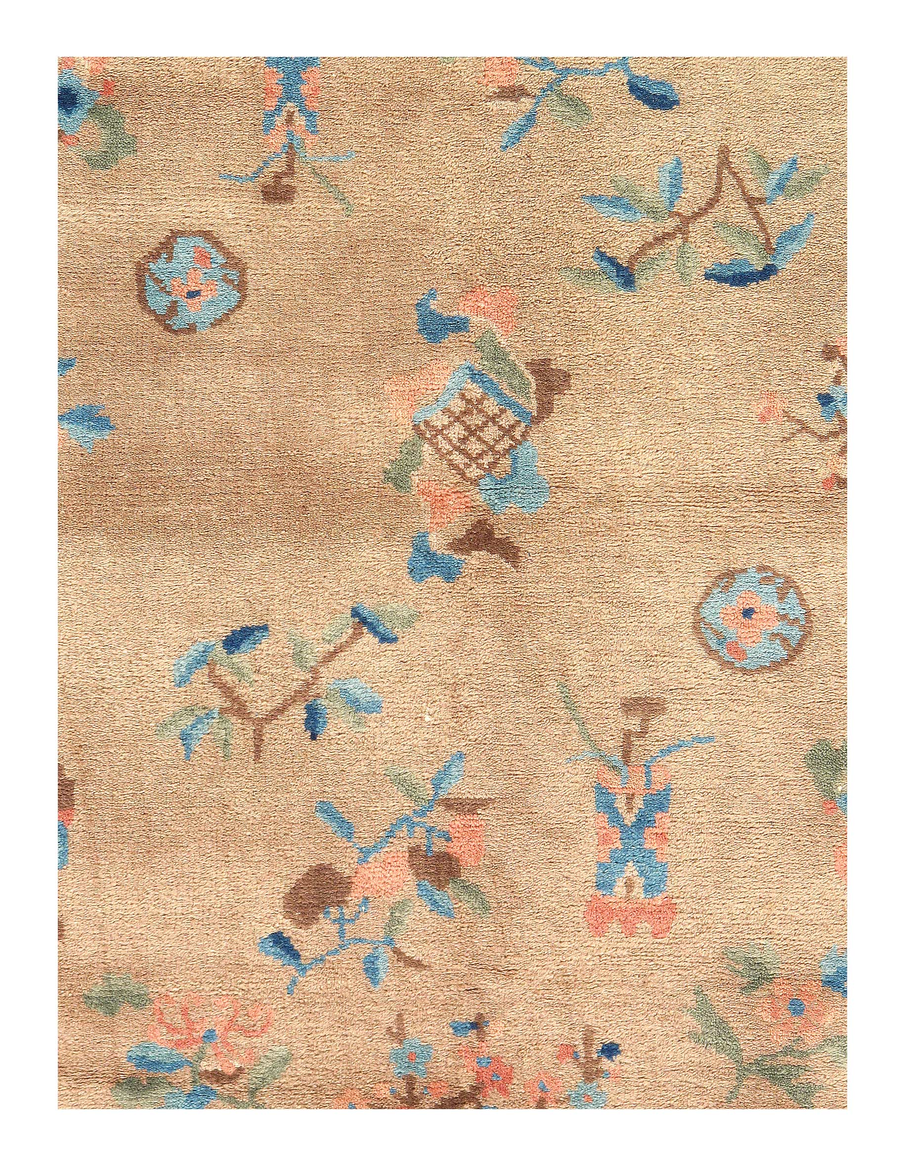 Chinese Deco Rug, Origin: China, Circa: Early 20th Century – Here is an exciting and appealing antique Oriental carpet – an antique Art Deco rug that was designed and woven in China during the early years of the twentieth century. Heavily informed by the aesthetic inclinations of the Art Deco period, this unique carpet is a compelling and thought-provoking example. A scalloped border of L Green encloses a Beige / Ivory sand field on this exquisitely subtle and restrained antique Chinese Art Deco. At first the field appears empty or open, but it is actually covered by a tone-on-tone design of scrolls and cloud-bands emanating inward from the outer edges. In their sinuous rhythms they echo the scalloped forms of the border and continue its visual effects across the carpet in a more subdued manner. This carpet testifies to the masterful design sensibilities of Chinese weavers as they made the transition into the modern world. The Art Deco movement had an outside influence on the world of art and design, and some of the most important qualities and characteristics of that movement may be found in this fine rug.