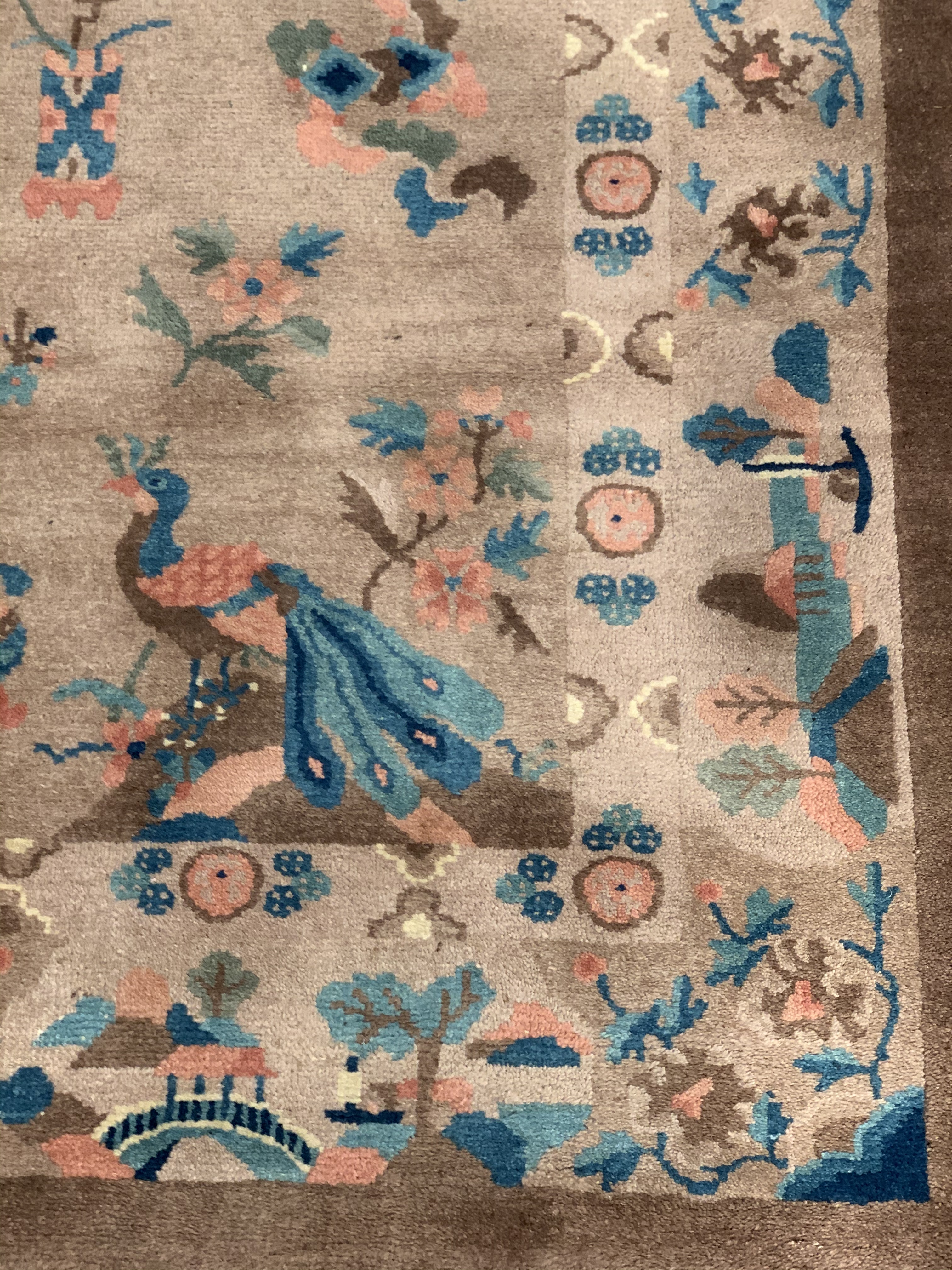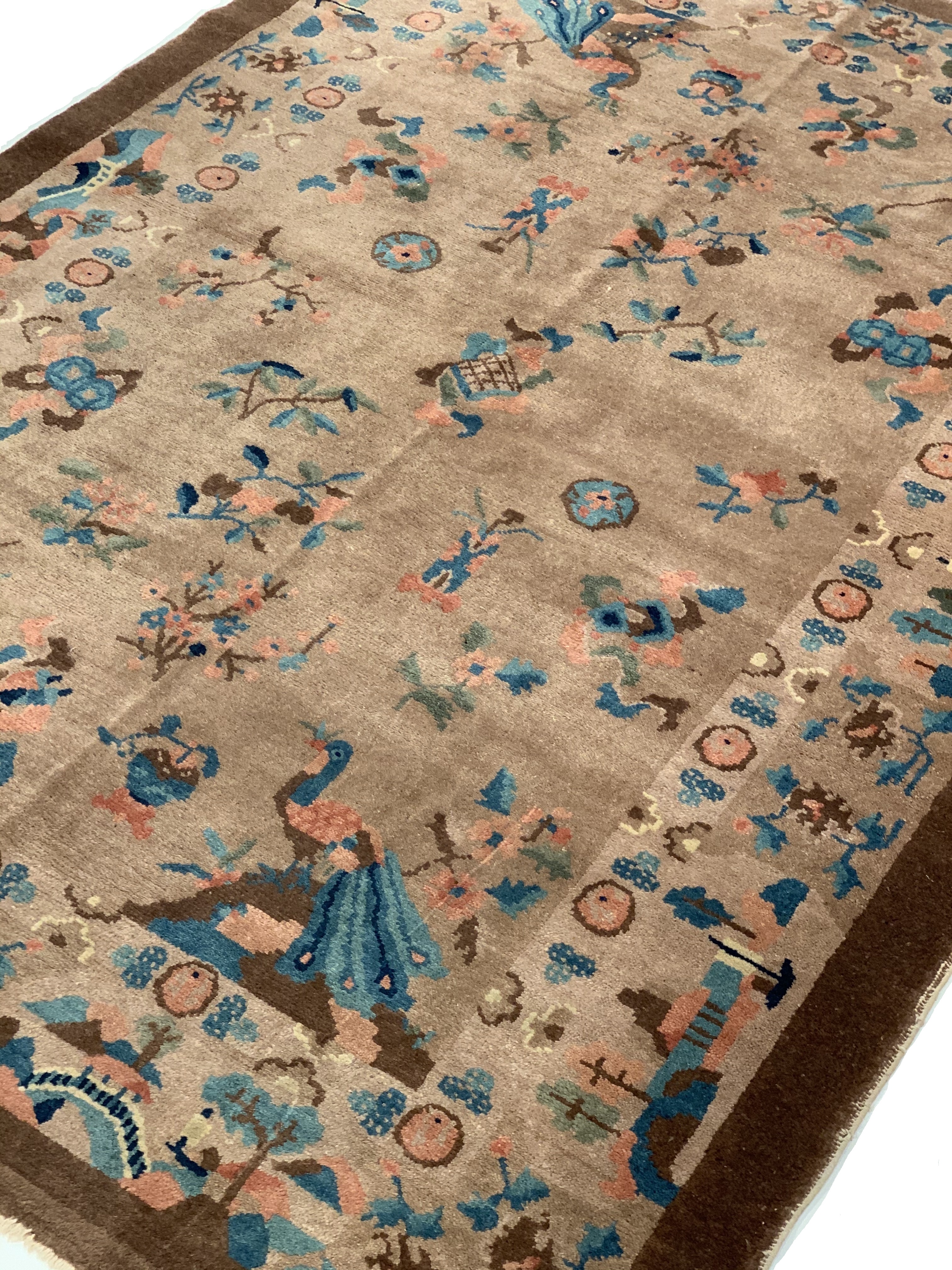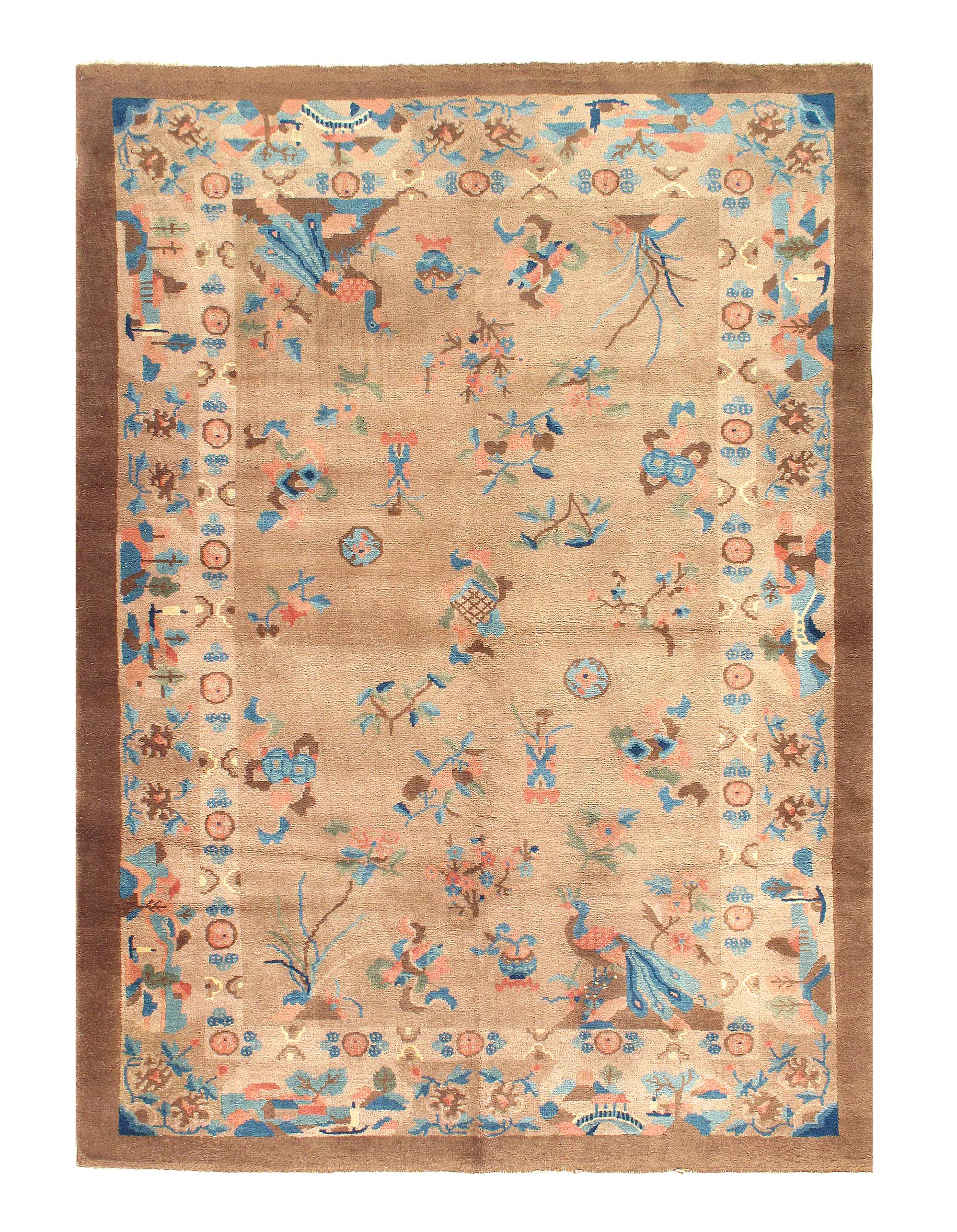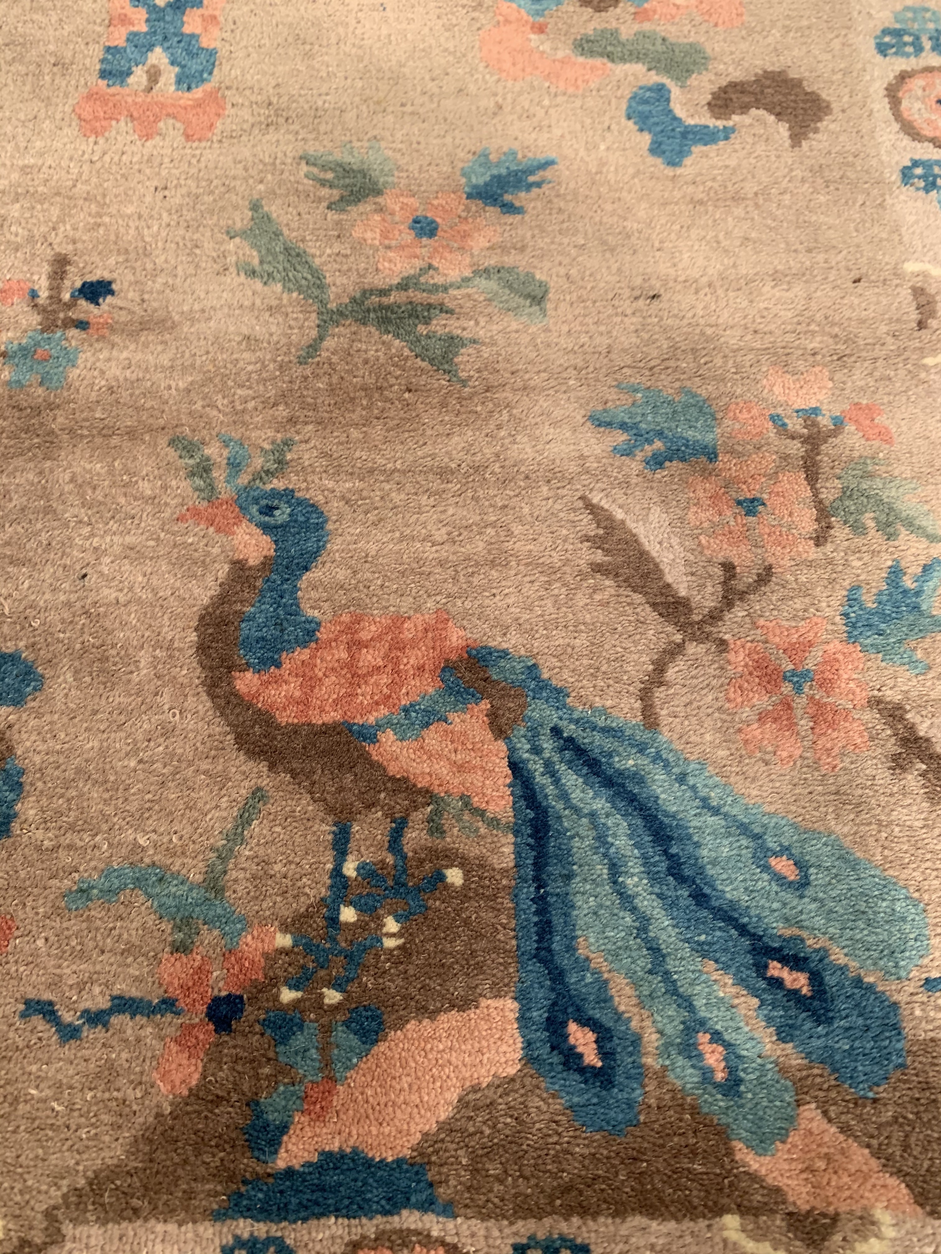 Chinese Deco Rug, Origin: China, Circa: Early 20th Century – Here is an exciting and appealing antique Oriental carpet – an antique Art Deco rug that was designed and woven in China during the early years of the twentieth century. Heavily informed by the aesthetic inclinations of the Art Deco period, this unique carpet is a compelling and thought-provoking example. A scalloped border of L Green encloses a Beige / Ivory sand field on this exquisitely subtle and restrained antique Chinese Art Deco. At first the field appears empty or open, but it is actually covered by a tone-on-tone design of scrolls and cloud-bands emanating inward from the outer edges. In their sinuous rhythms they echo the scalloped forms of the border and continue its visual effects across the carpet in a more subdued manner. This carpet testifies to the masterful design sensibilities of Chinese weavers as they made the transition into the modern world. The Art Deco movement had an outside influence on the world of art and design, and some of the most important qualities and characteristics of that movement may be found in this fine rug.