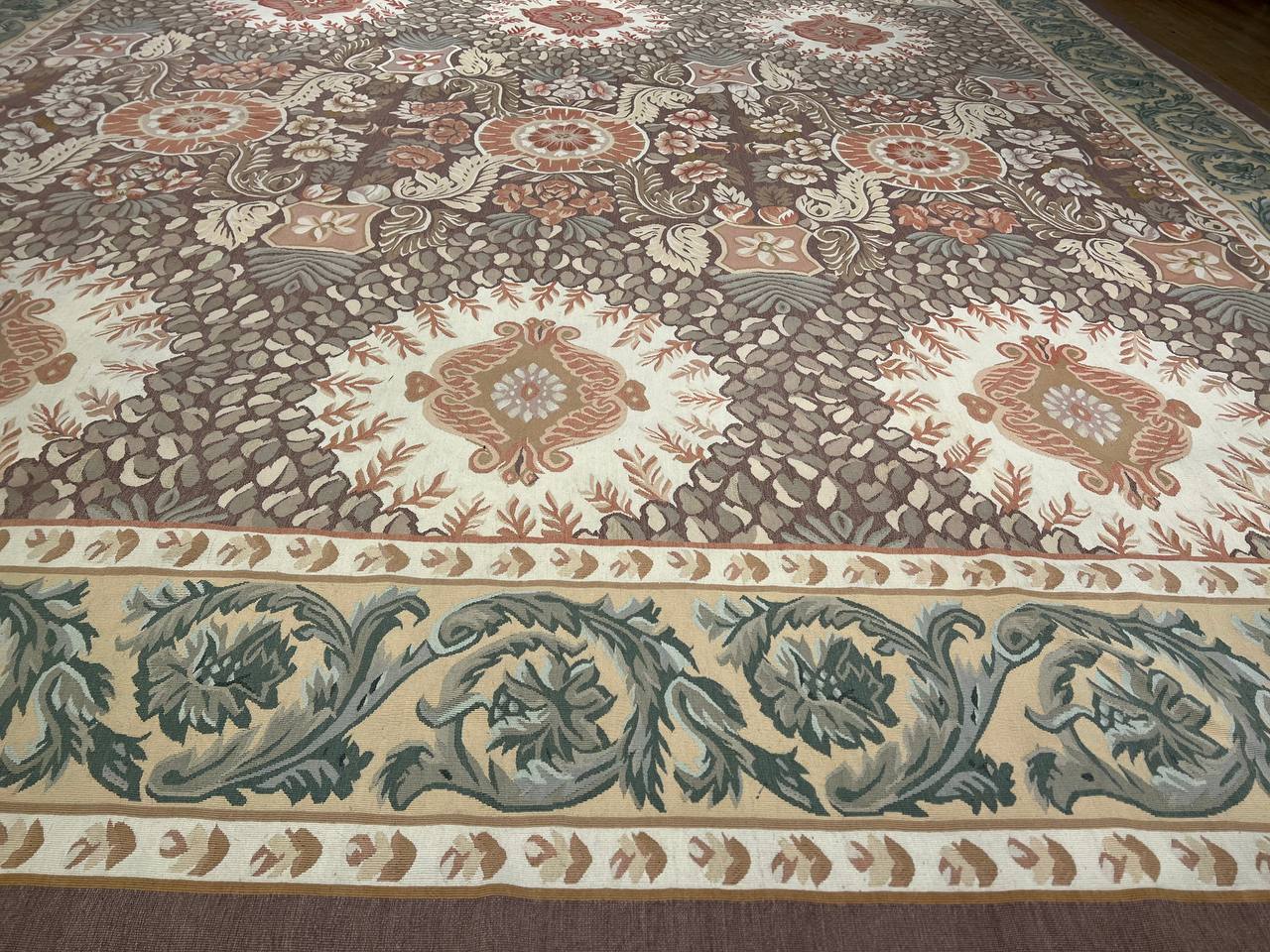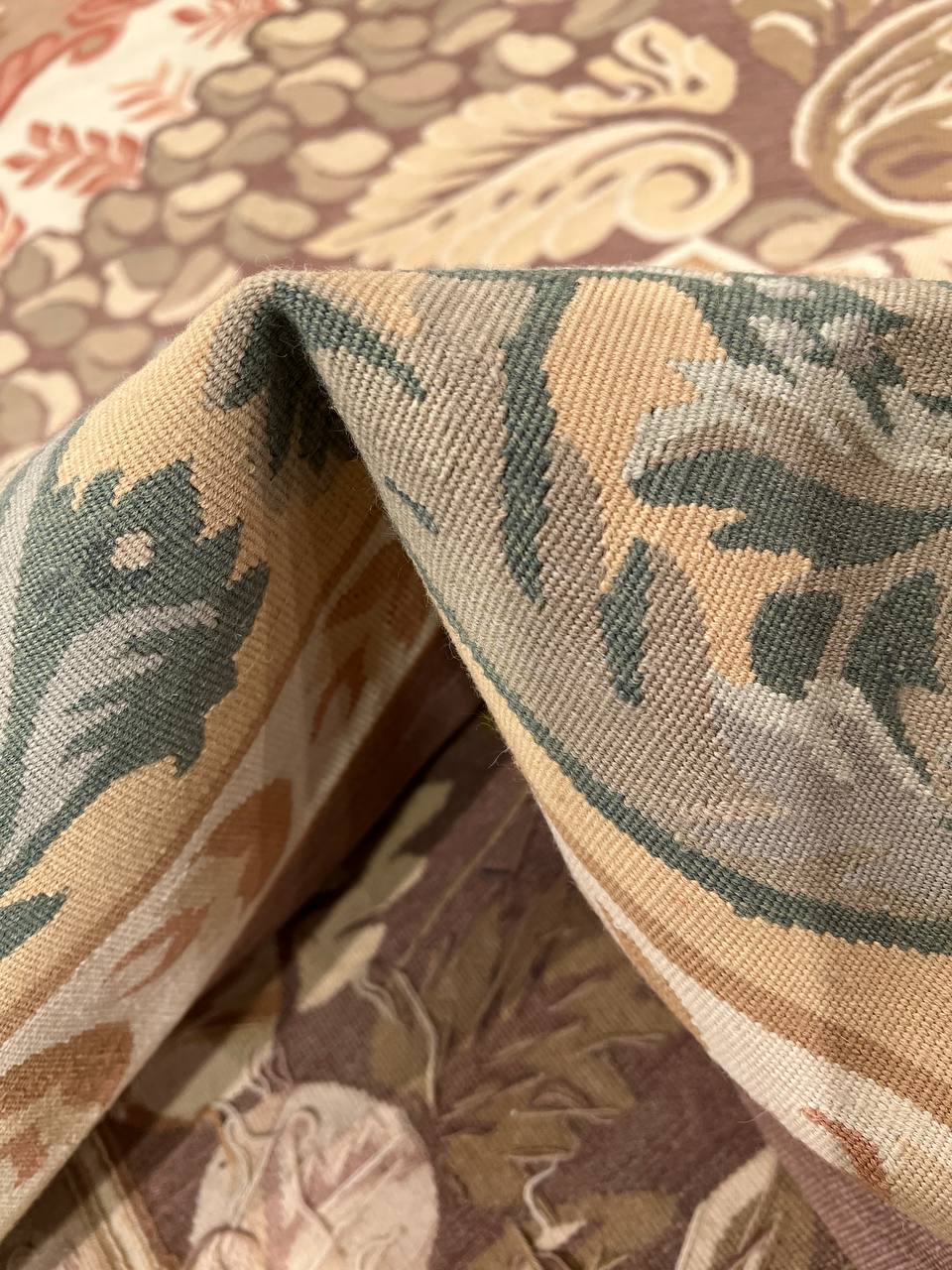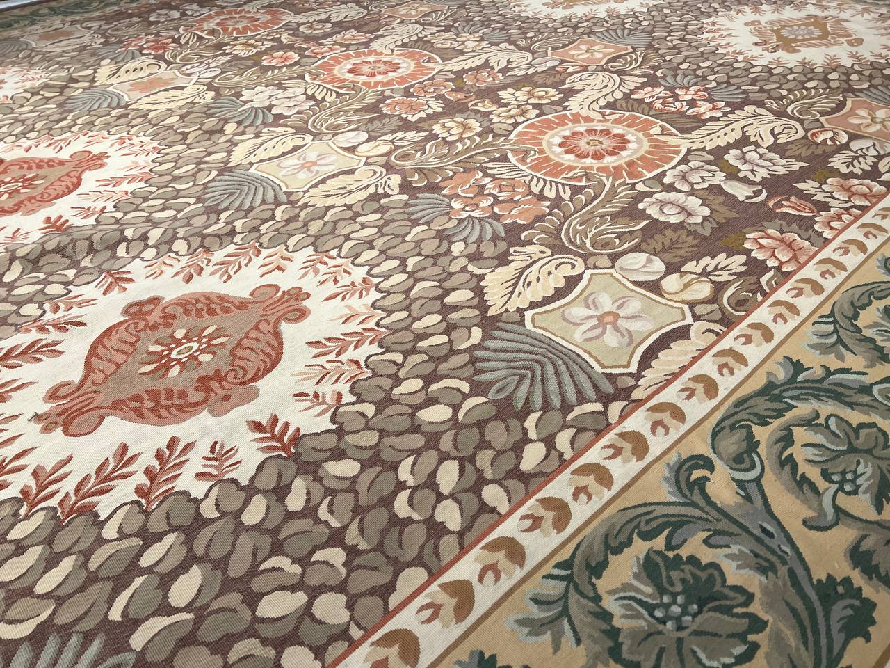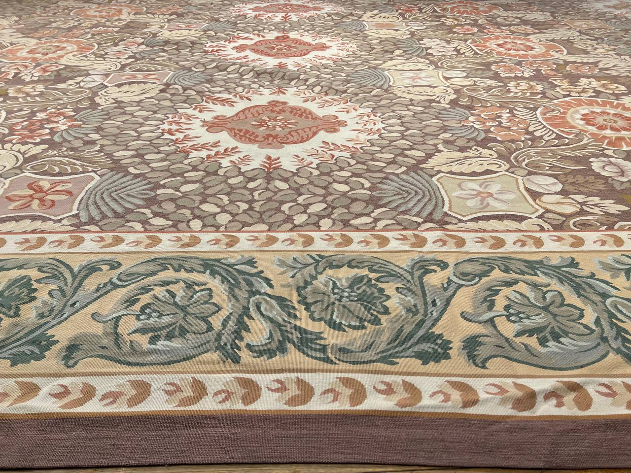 This is a beautiful reproduction Aubusson flat weave rug. Handcrafted using 100% New Zealand wool. It was done exactly as it was centuries ago in France. Use with a thick pad on the floor in any room, or display on a wall. Patterns may vary according to shape and dimension